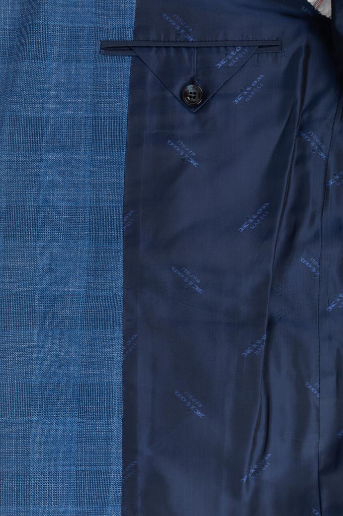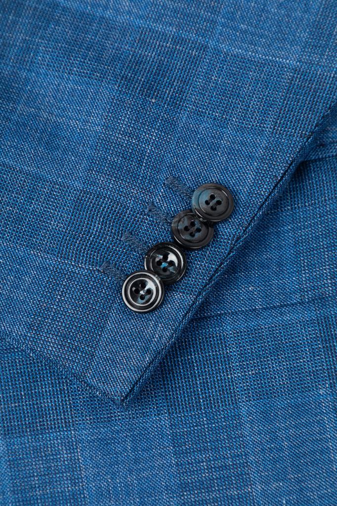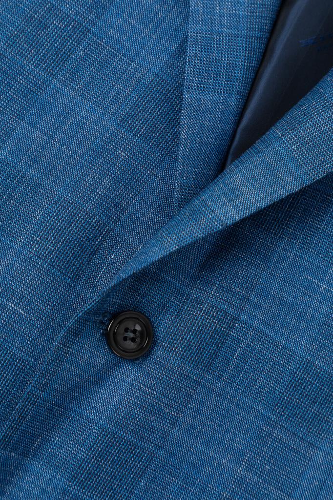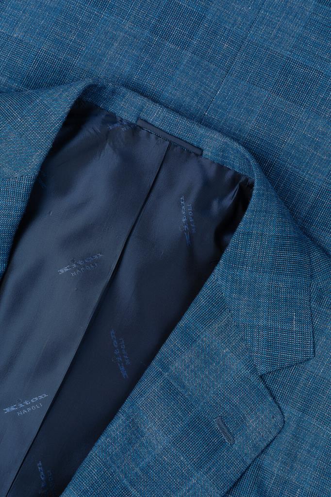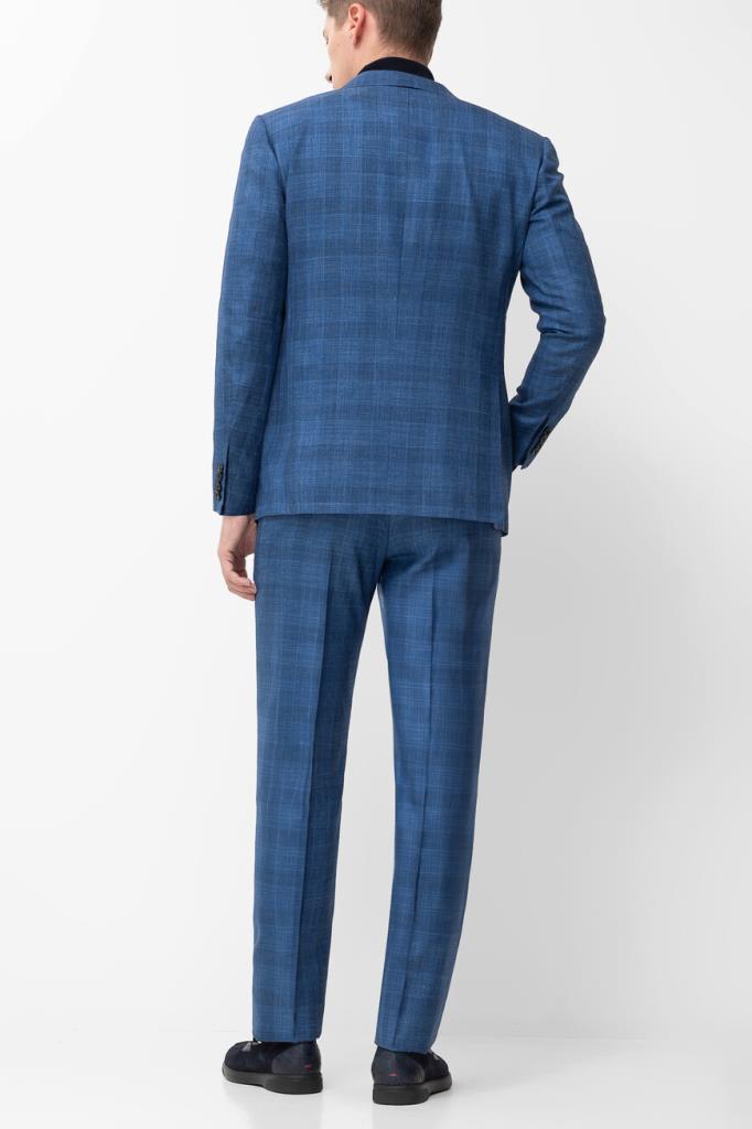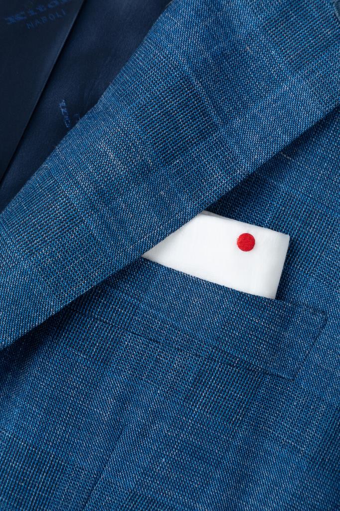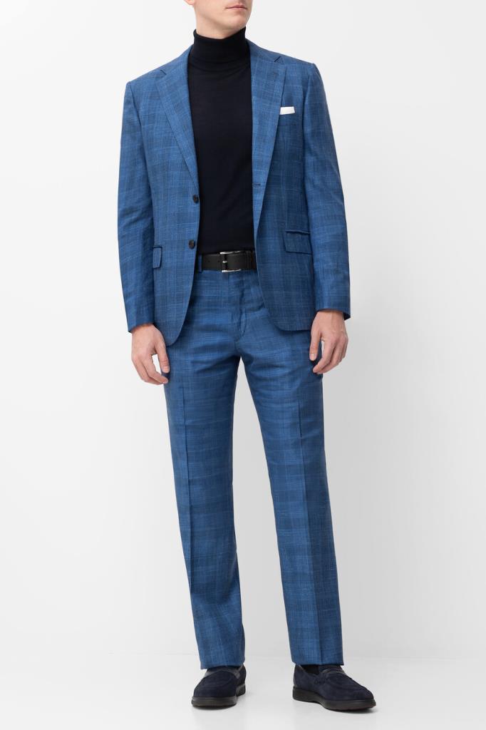 Синий костюм-двойка Kiton в крупную клетку. Однобортный пиджак полуприлегающего силуэта и брюки со стрелками выполнены из мягкого трикотажа, в котором переплели прочный кашемир, лён и гладкий шёлк. Детали, вырезанные по проверенным временем лекалам, точно подогнали и обработали исключительно вручную. Такой комплект безупречно садится по фигуре, сохраняя чувство комфорта в течение всего дня. На принадлежность изделия Дому указывают тёмно-синяя подкладка с повторяющимся логотипом и знаковая символика - ярко-красная точка на белом нагрудном платке, идущем в комплекте.
