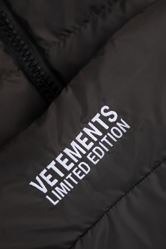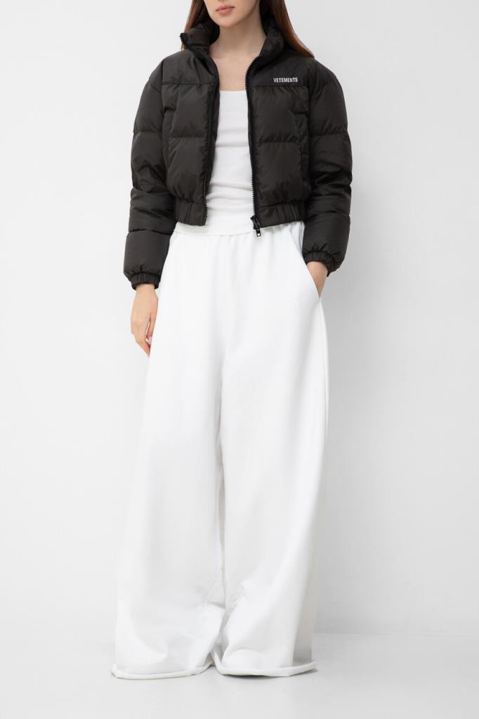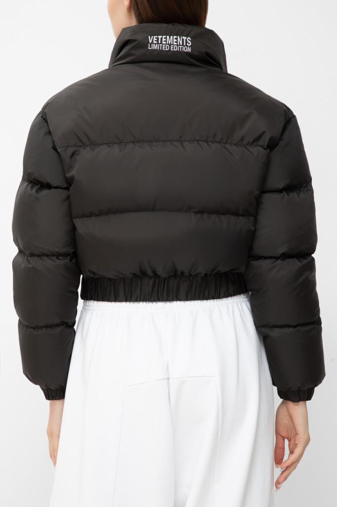 Стёганая куртка укороченного силуэта от VETEMENTS. Изделие сшито из прочного износостойкого полиэфира чёрного цвета и оснащено застёжкой-молнией с двумя бегунками. Слева на груди и сзади на воротнике вышиты контрастные надписи-логотипы Дома. Дополнительный комфорт и удобство в носке обеспечивают манжеты-резинки и широкий эластичный пояс. Утеплённая натуральным пухом и пером куртка из лимитированной коллекции бренда станет неотъемлемой частью демисезонного гардероба.