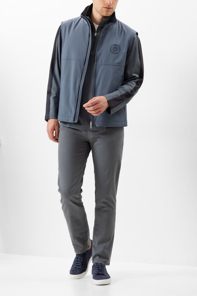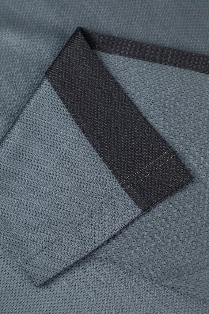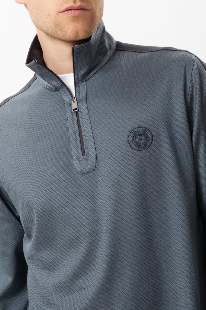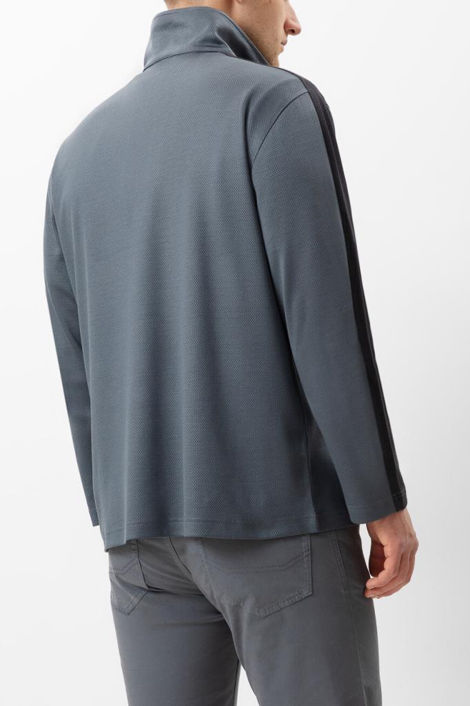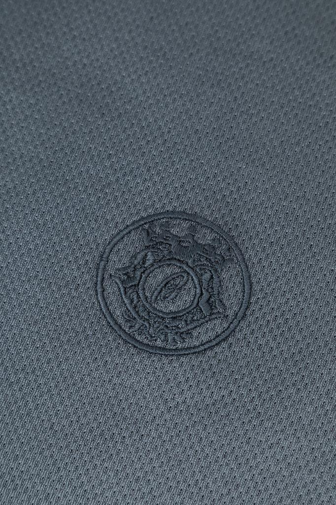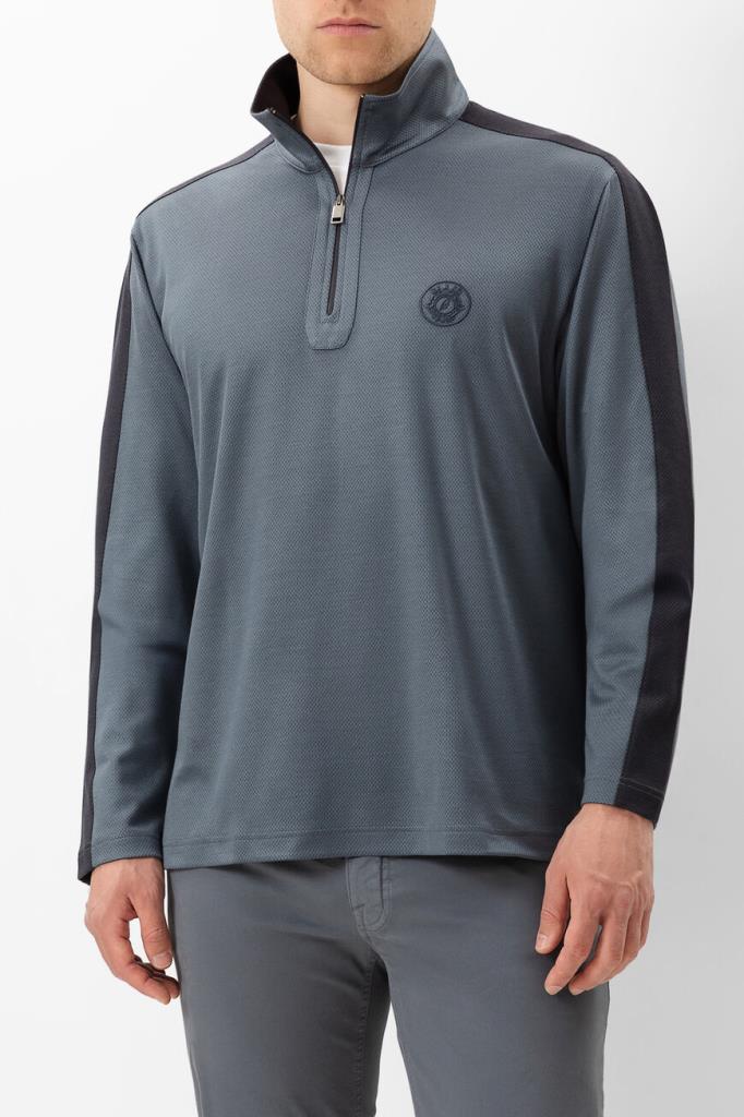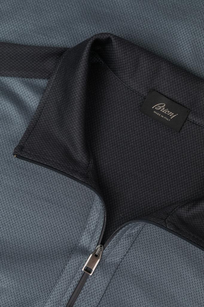 Сетчатая фактурная олимпийка Brioni с высоким воротником-стойкой. Изделие выполнено из мягкого синего джерси на основе хлопка и натуральной шерсти. Фасон модели в спортивном стиле предполагает прямой крой и застёжку на короткую молнию сверху. Декором выступают чёрные полосы-лампасы на рукавах и по линии плеч и вышитый дизайнерский логотип, посвященный гольфу, слева на груди. Олимпийка прекрасно дополнит образы как на поле, так и за его пределами.