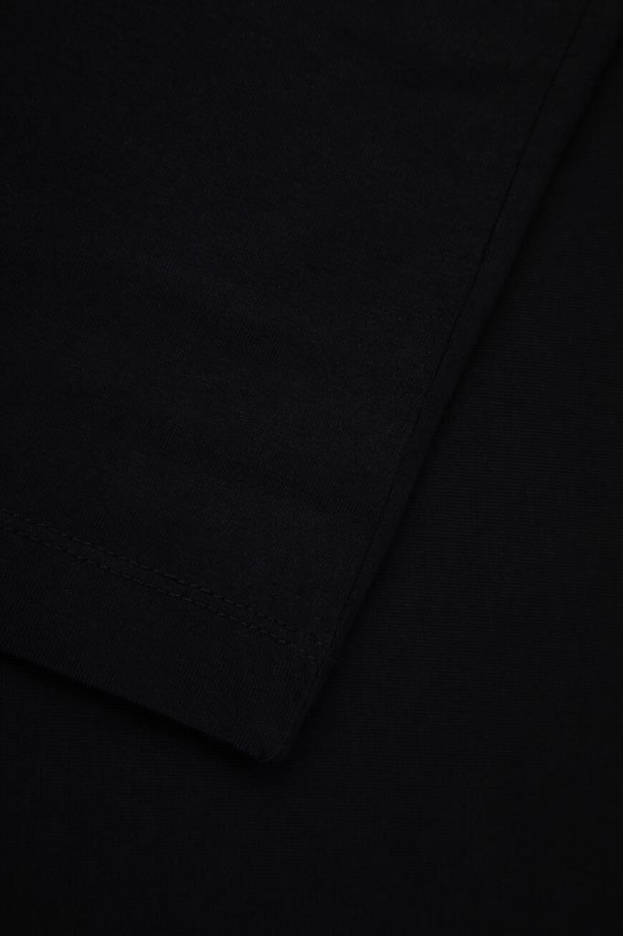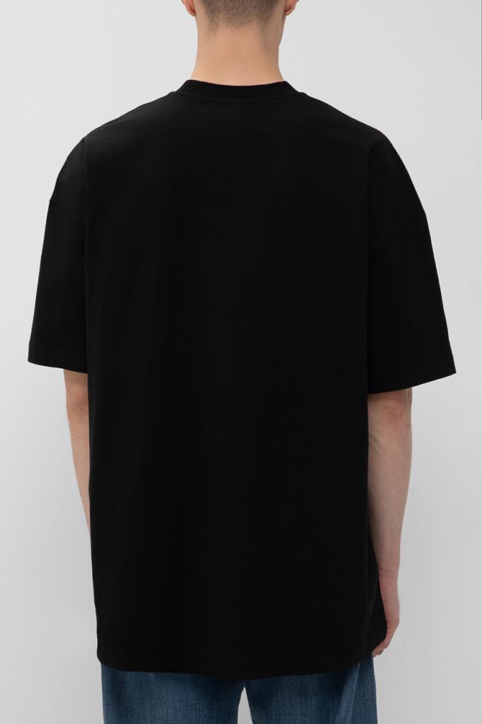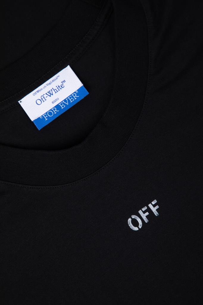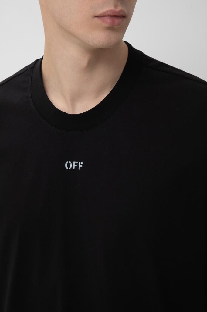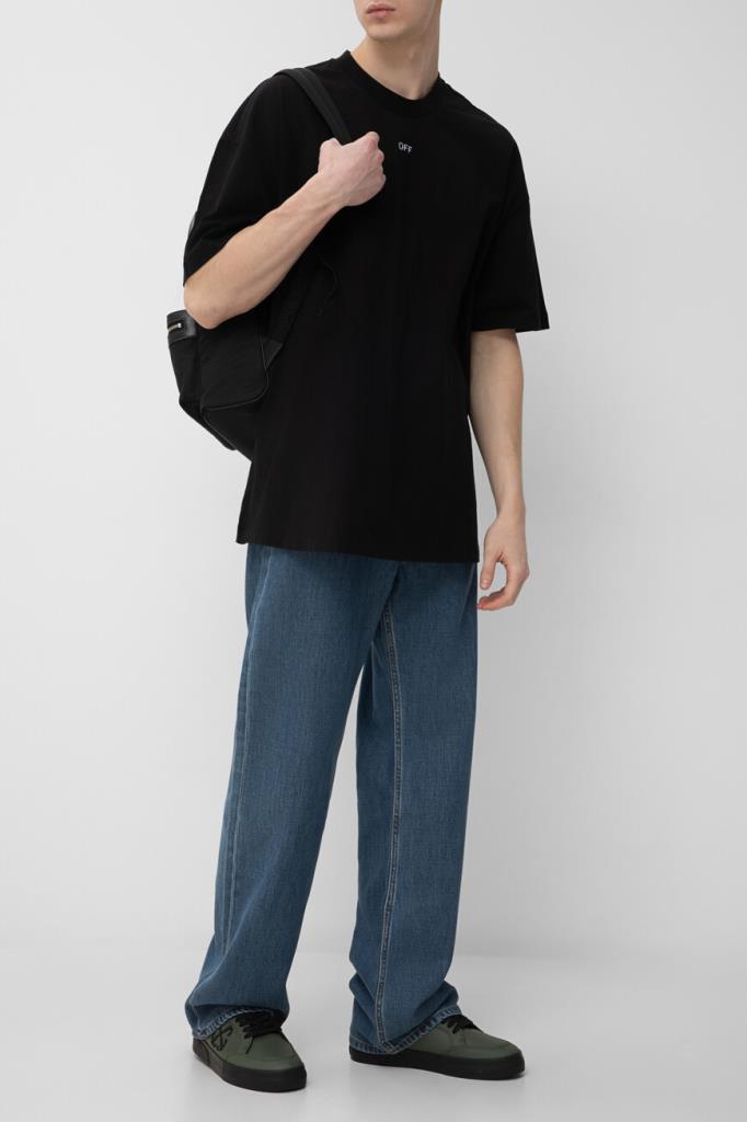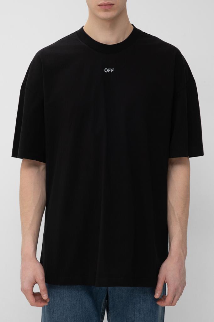 Чёрная футболка Off-White с круглым вырезом горловины на резинке. Лёгкая модель изготовлена из гладкого хлопкового джерси, хорошо пропускающего воздух, и дополнена QR-кодом для подтверждения её подлинности. Атрибутом Дома стала небольшая контрастная надпись «OFF» на груди, созданная по трафарету и имитирующая граффити. Нарочитые дизайнерские потёртости на принте усиливают сходство, а крой oversize превращает изделие в эталон одежды в стиле streetwear.