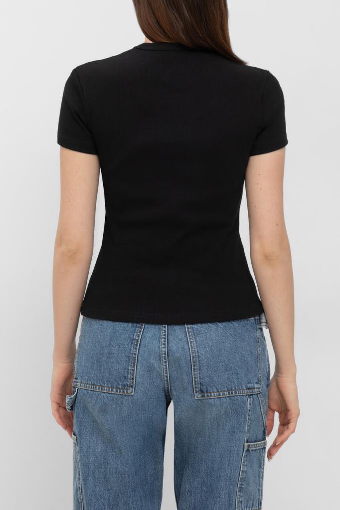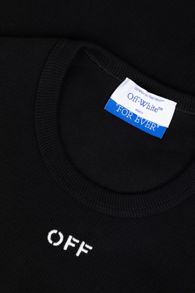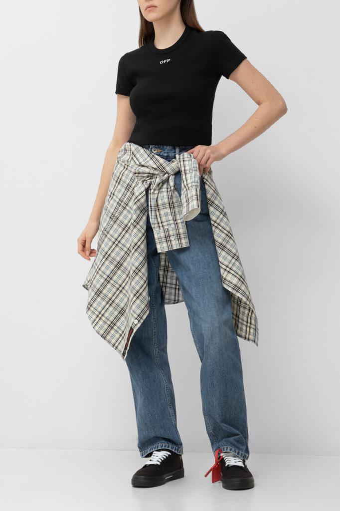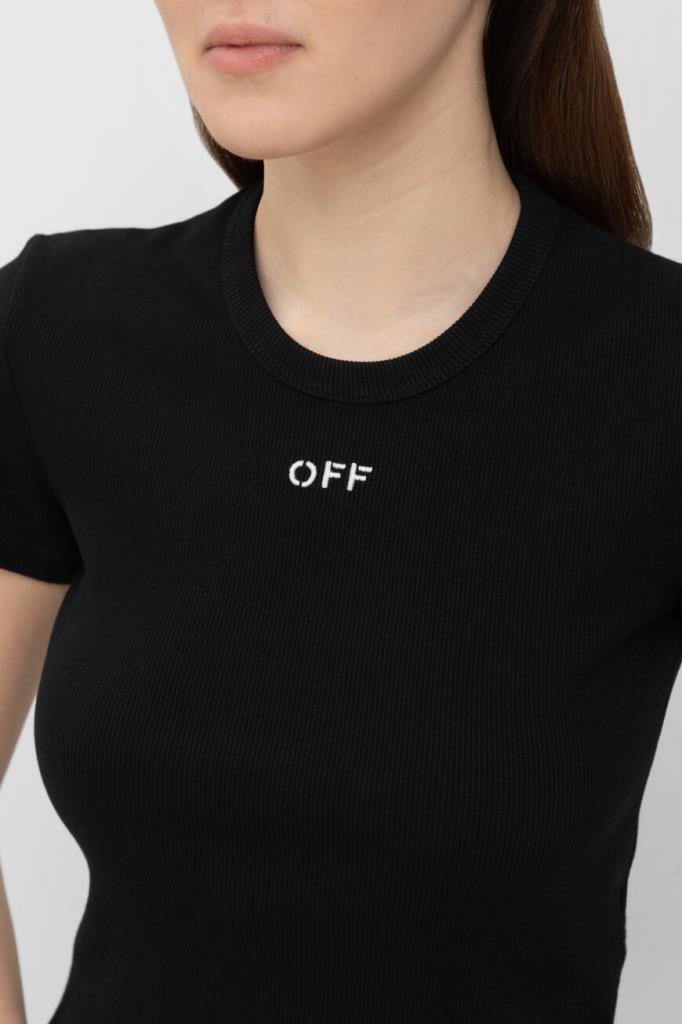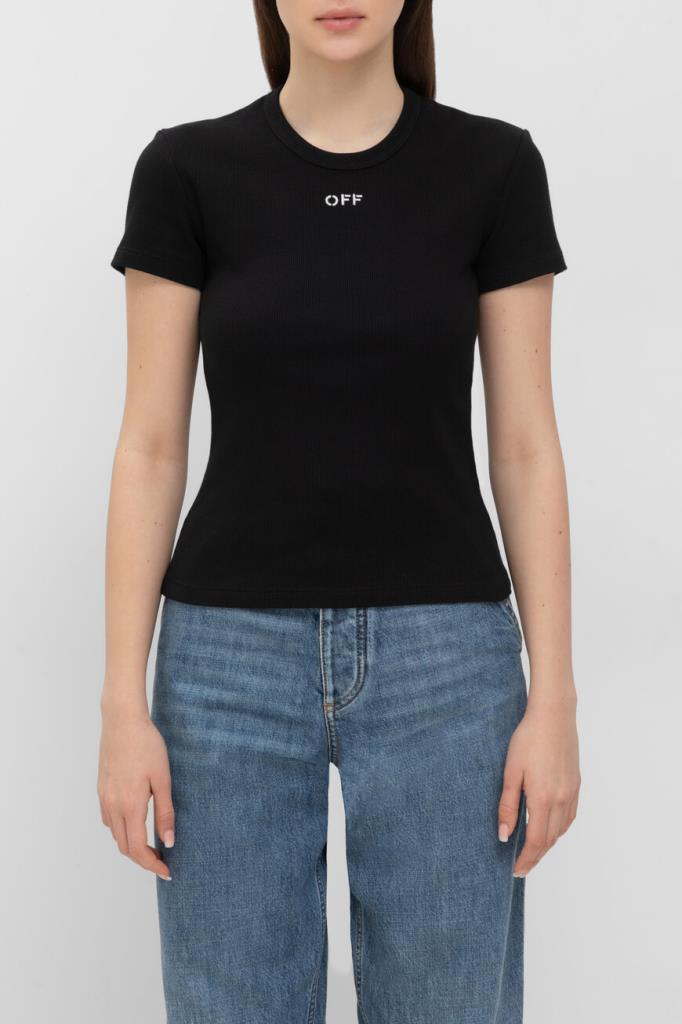 Прилегающая футболка Off-White с текстурой в рубчик. Повседневная модель из эластичного хлопкового трикотажа чёрного цвета украшена небольшим контрастным логотипом «OFF», указывающим на её принадлежность Дому. Материал с рифлёным узором легко тянется в ширину, поэтому изделие комфортно облегает фигуру, адаптируясь к её форме. Футболка с круглым вырезом горловины на резинке идеально сочетается с джинсами.