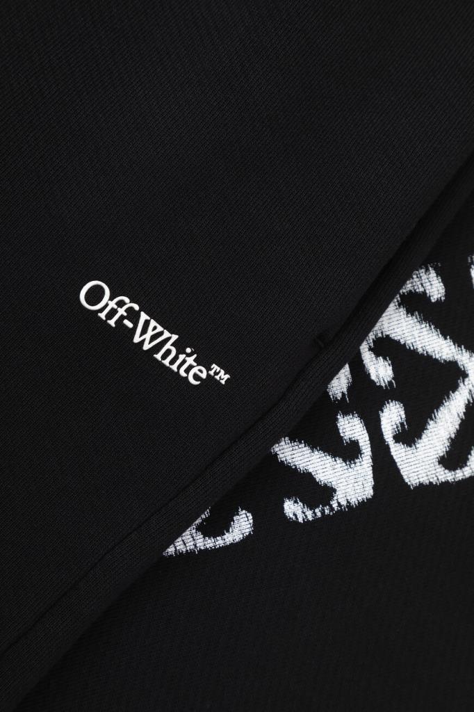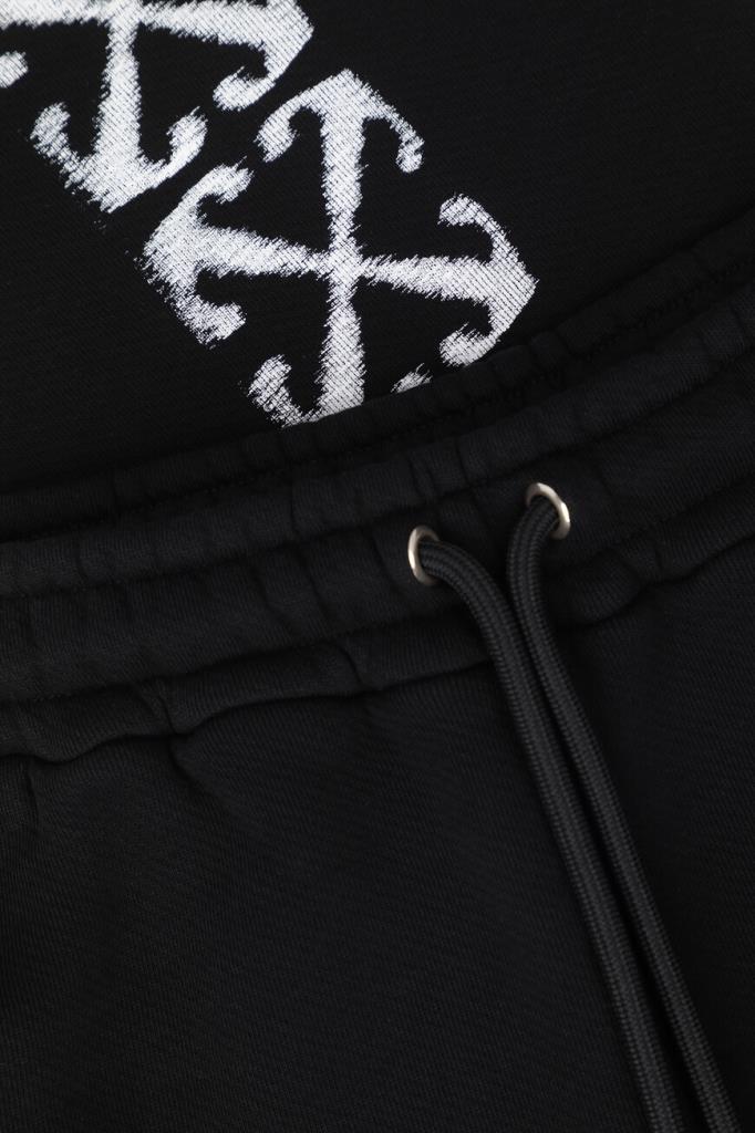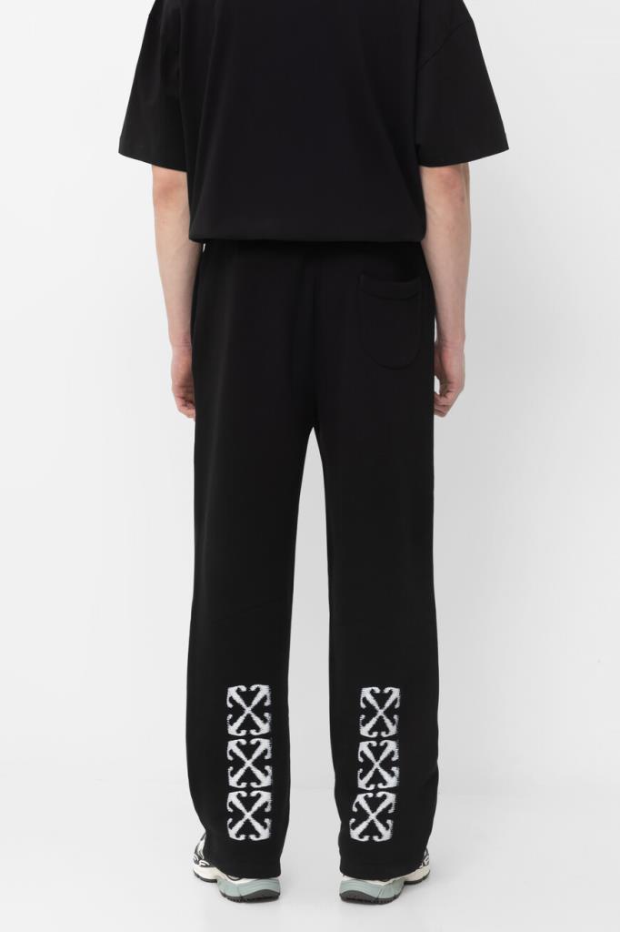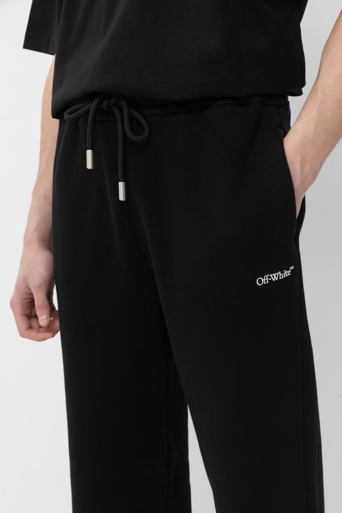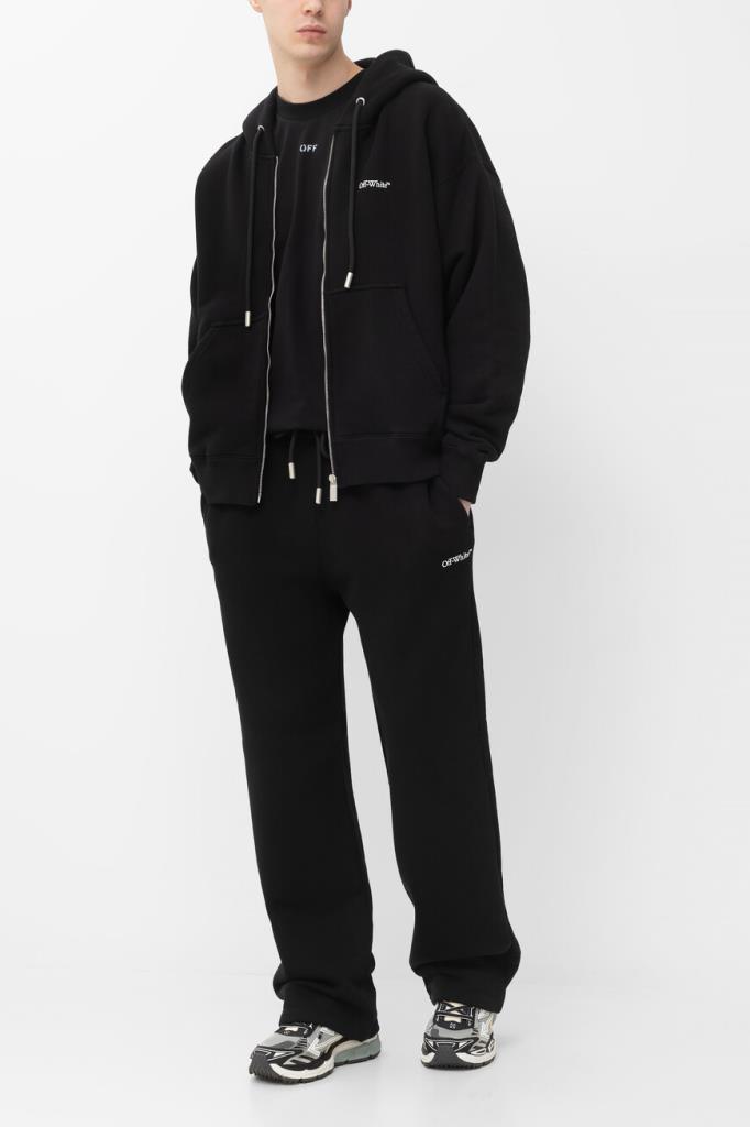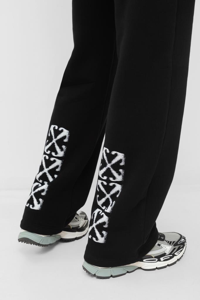 Хлопковые брюки Windy Arrow от бренда Off-White. Изделие сшито из плотного джерси чёрного цвета и оснащено широким эластичным поясом-кулиской для регулировки посадки. Особенностями прямой модели стали контрастные логотип Дома под боковым карманом и знаковый мотив в виде перекрещенных стрелок Arrows сзади снизу. Спортивные брюки дополнены QR-кодом для подтверждения подлинности. Дополните образ чёрной толстовкой на серебристой молнии из той же коллекции.