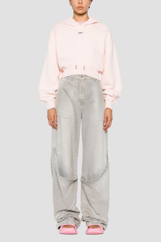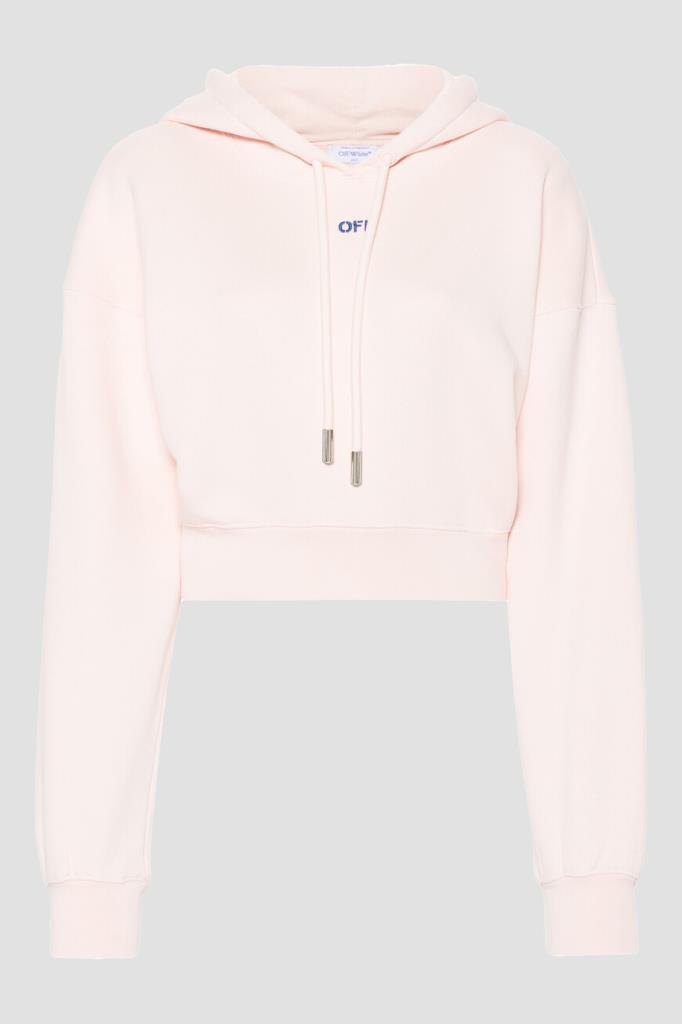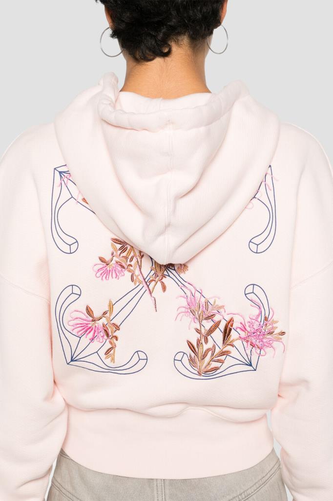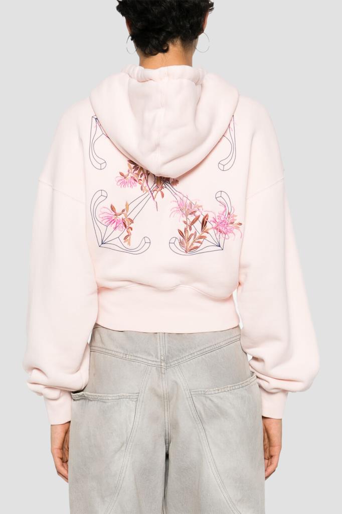 Укороченное худи Off-White с цветочной вышивкой сзади. Изделие выполнено из мягкого хлопкового джерси светло-розового оттенка и дополнено уникальным QR-кодом для подтверждения подлинности. Модель на фактурной подкладке из футера украшают тёмно-синие вышивка «OFF» спереди по центру и крупный знаковый принт в виде перекрещенных стрелок Arrows на спинке.