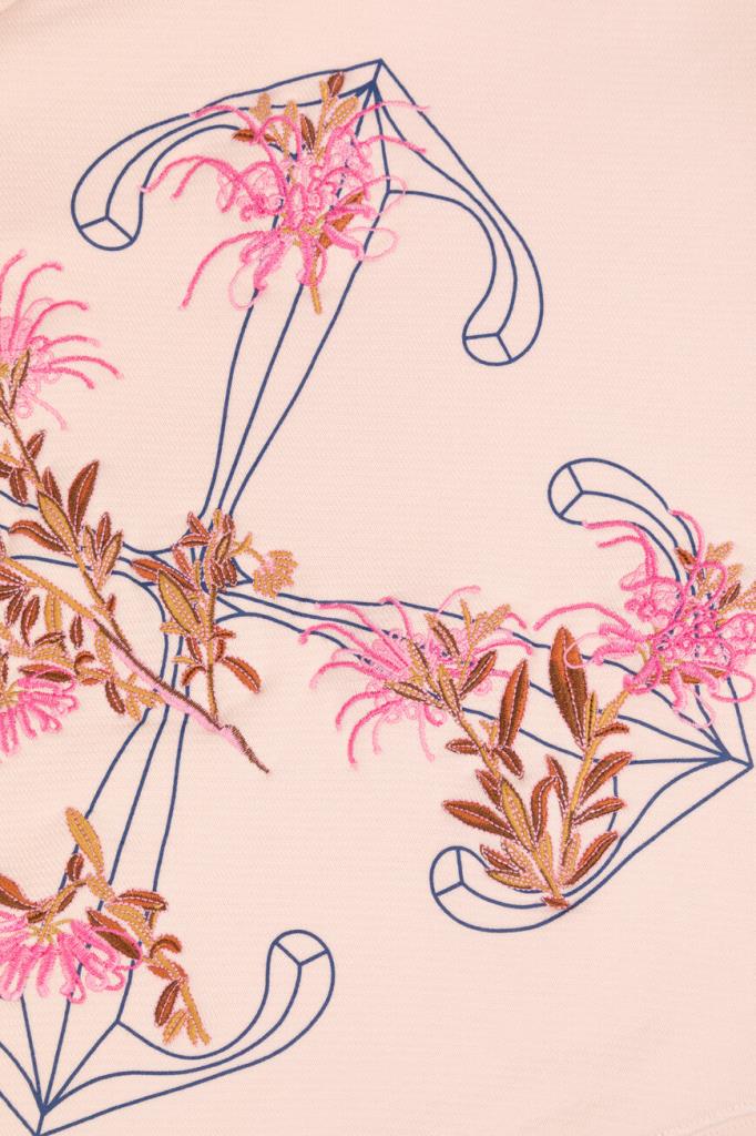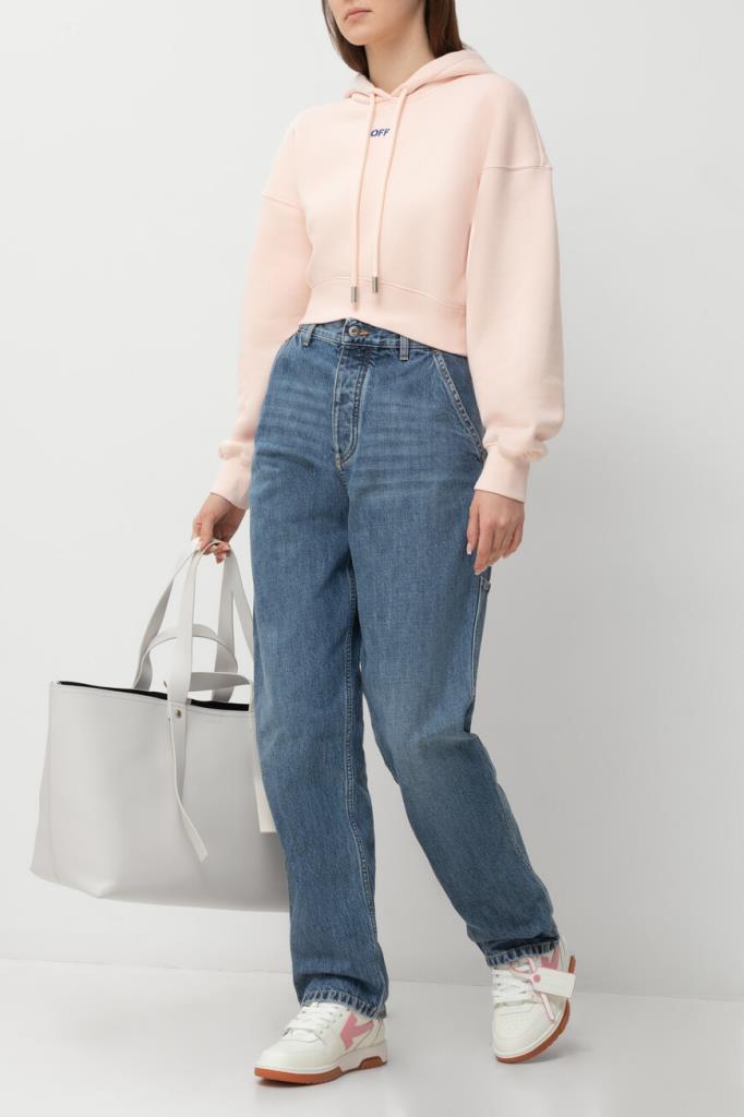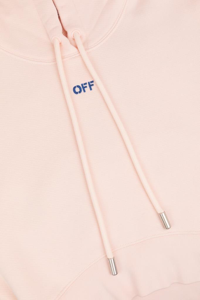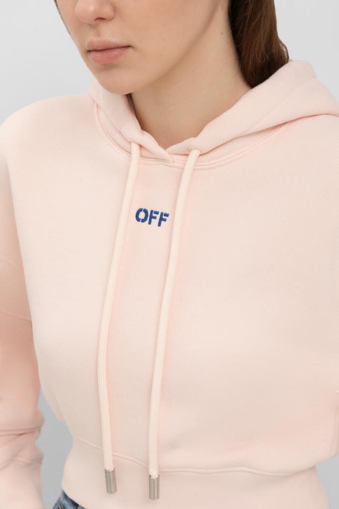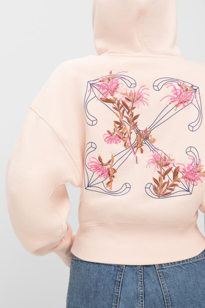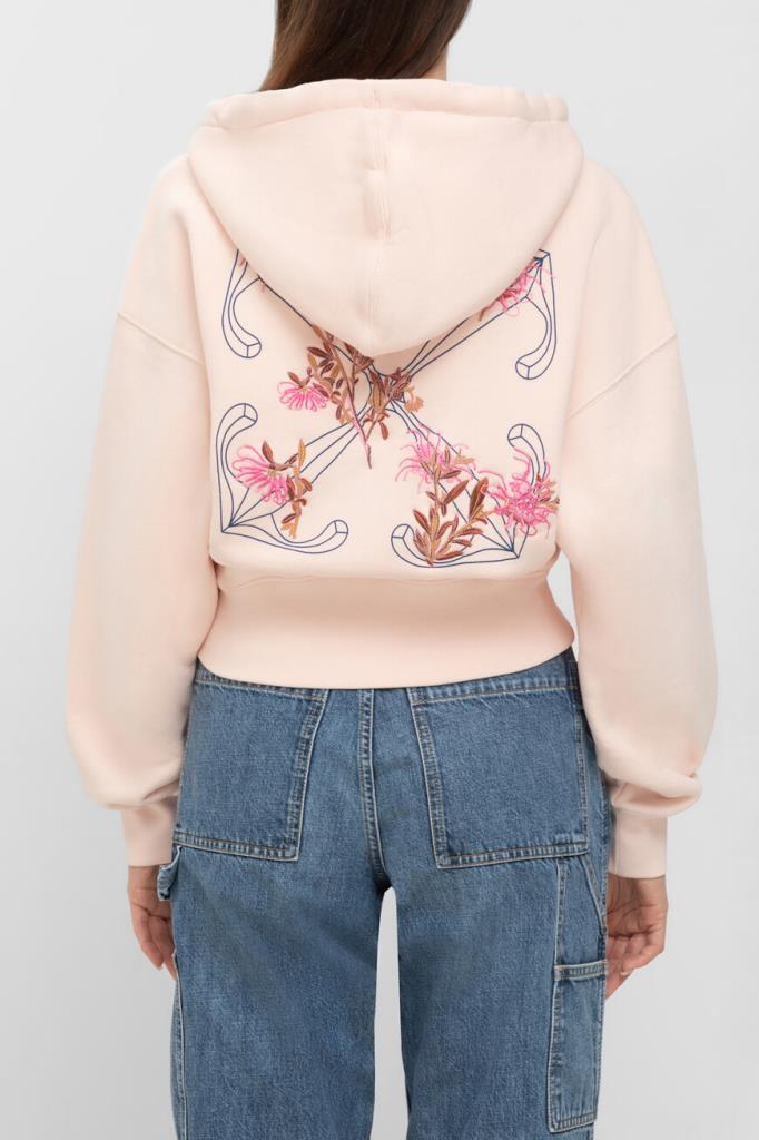 Укороченное худи Off-White с цветочной вышивкой сзади. Изделие выполнено из мягкого хлопкового джерси светло-розового оттенка и дополнено уникальным QR-кодом для подтверждения подлинности. Модель на фактурной подкладке из футера украшают тёмно-синие вышивка «OFF» спереди по центру и крупный знаковый принт в виде перекрещенных стрелок Arrows на спинке.
