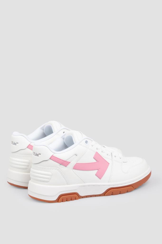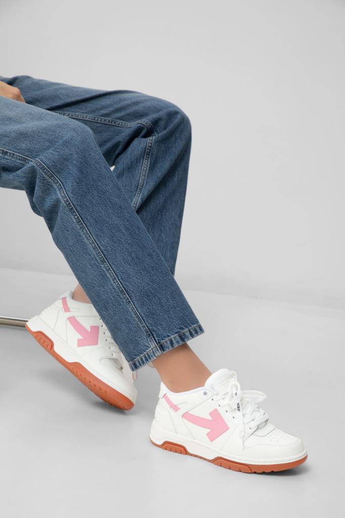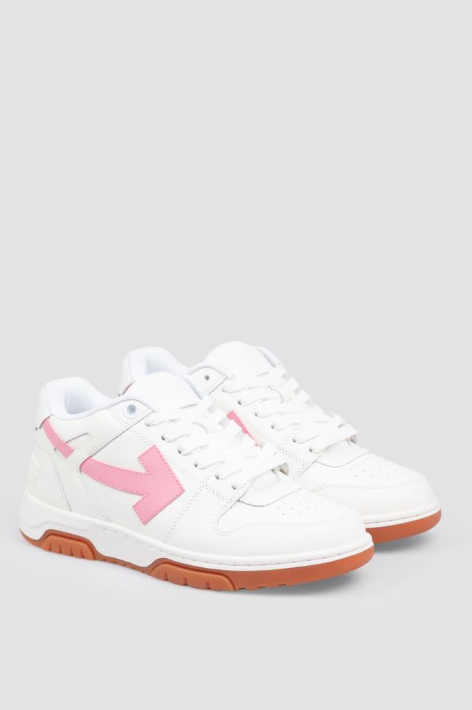 Кожаные кроссовки Out Of Office от бренда Off-White. Изделие белого цвета характеризуется гладкой текстурой материала, наличием закрытой перекрёстной шнуровкой с двухцветной кожаной пломбой «ZIP TIE» и отделкой из прочного переработанного полиэфира в тон. Декором выступают вставка с тиснёной надписью на язычке, чёрная надпись-логотип на кожаной вставке сзади и розовые лого Arrows в виде стрелок, расположенные на боковинах.