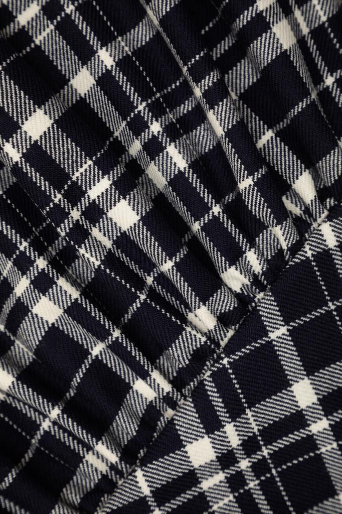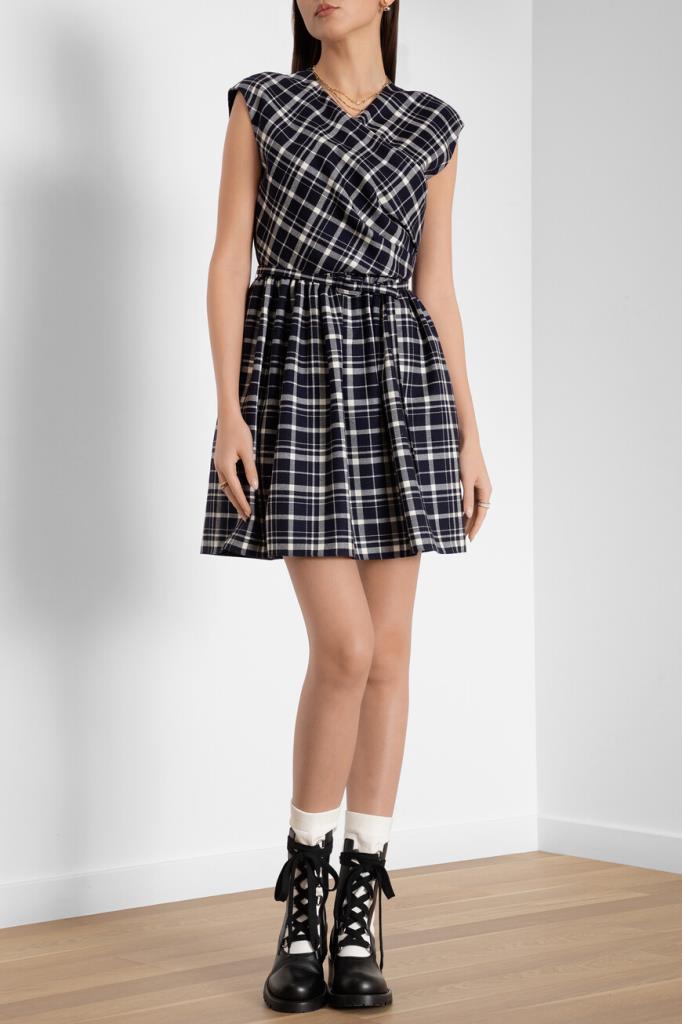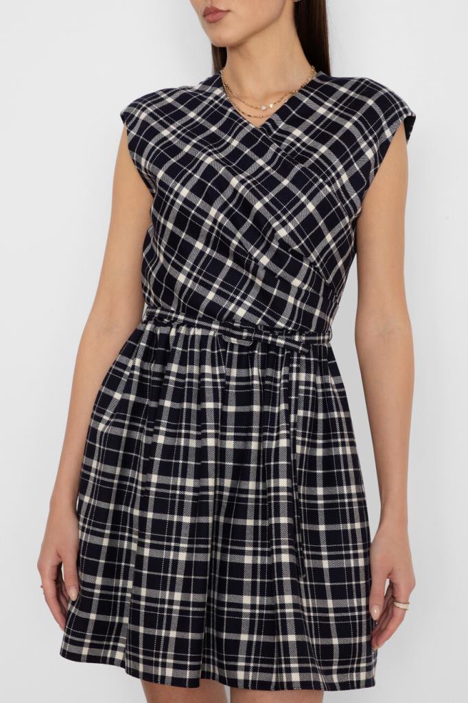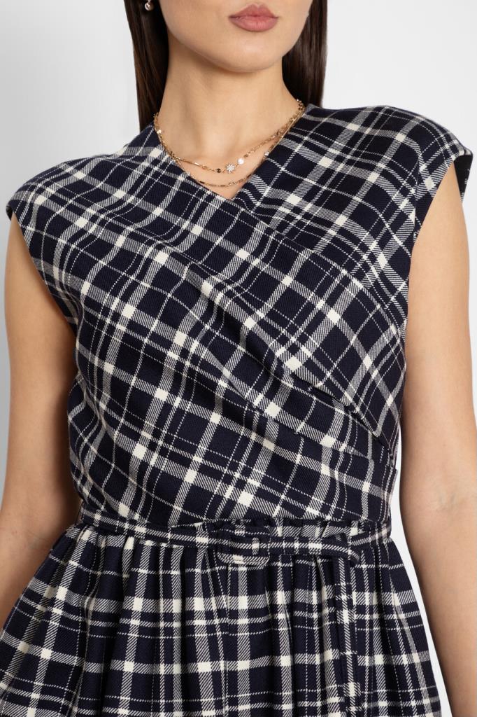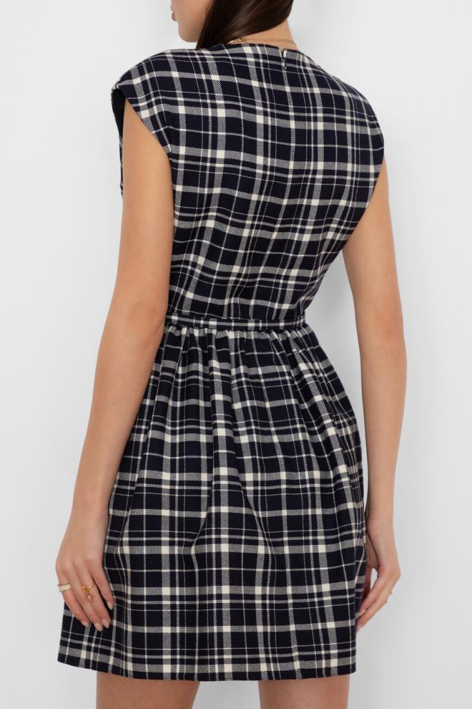 Лёгкое женственное платье Dior из мягкой натуральной шерсти virgin синего цвета с оригинальным контрастным белым узором с фирменным мотивом Check'n'Dior Pop в крупную клетку. Эффектная короткая модель свободного кроя без рукавов, с изящным V-образным вырезом горловины, запАхом сверху, удобной застёжкой на молнию сзади, двумя прорезными карманами по бокам, талией на кулиске и стильной плиссированной юбкой. Линию талии подчёркивает тонкий изящный пояс с пряжкой в тон.