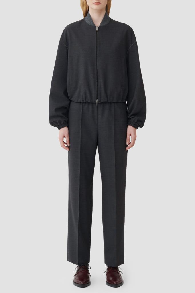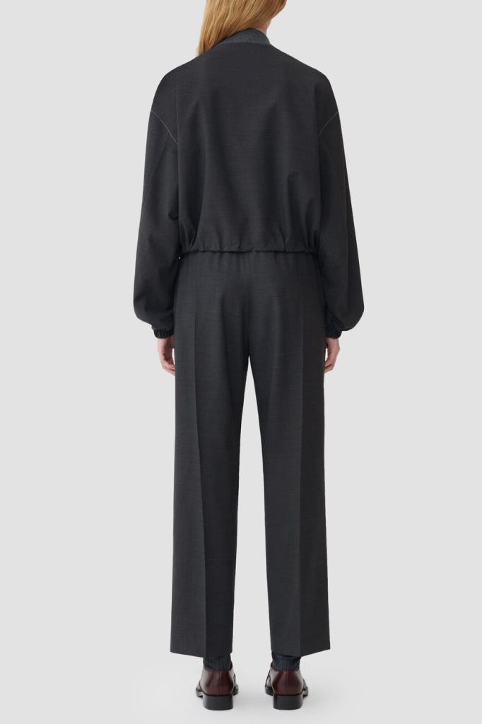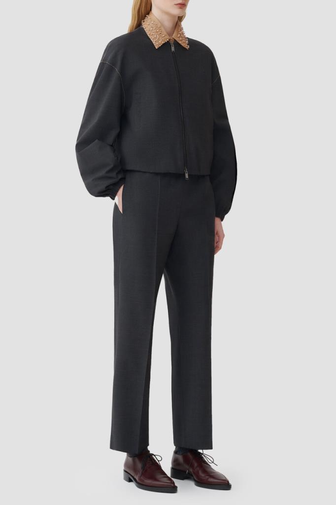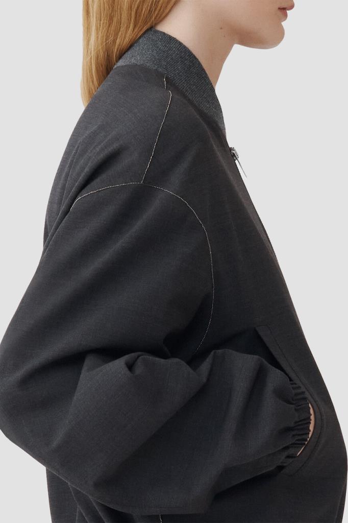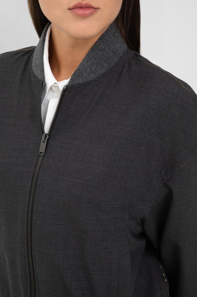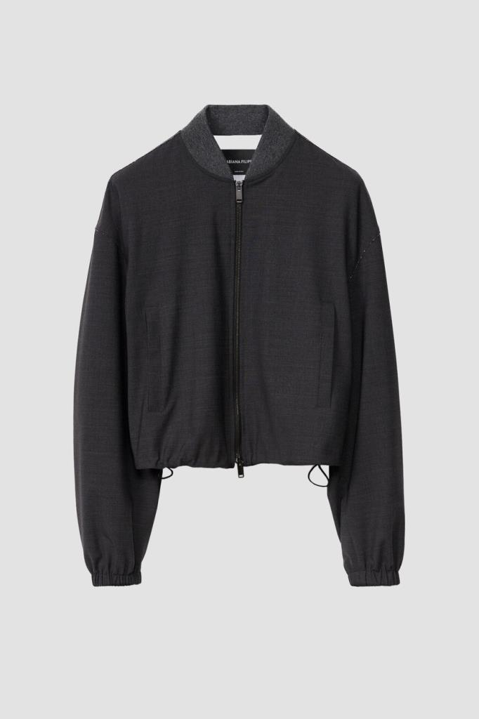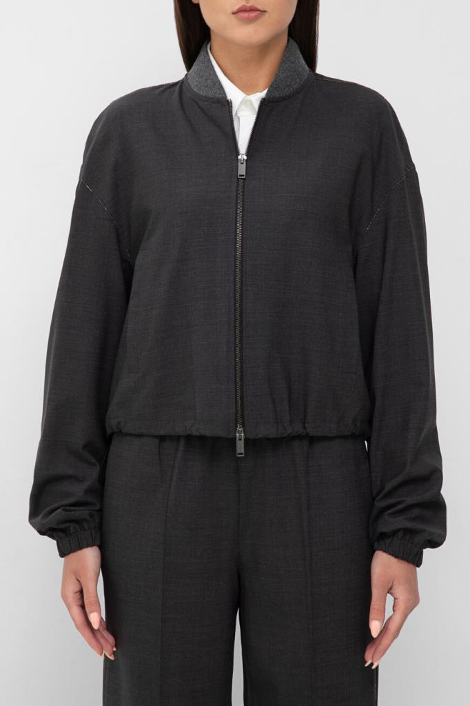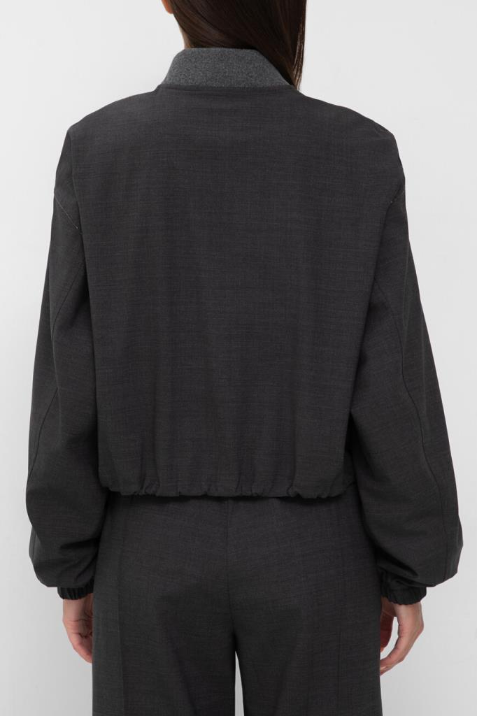 Укороченный бомбер тёмно-серого цвета от Fabiana Filippi. Модель изготовлена из мягкого трикотажа на основе шерсти и прочного эластичного нейлона. Лёгкий материал из сверхтонкой мериносовой шерсти обеспечивает комфорт. Изделие отличается невысоким серым воротником-стойкой и застёжкой на встречную молнию с двумя бегунками. Декором выступает окантовка в виде серебристой цепочки в проймах рукавов и по линии плеч. Оптимальную посадку бомбера по фигуре обеспечивают манжеты-резинки и регулируемые кулиски по линии талии.