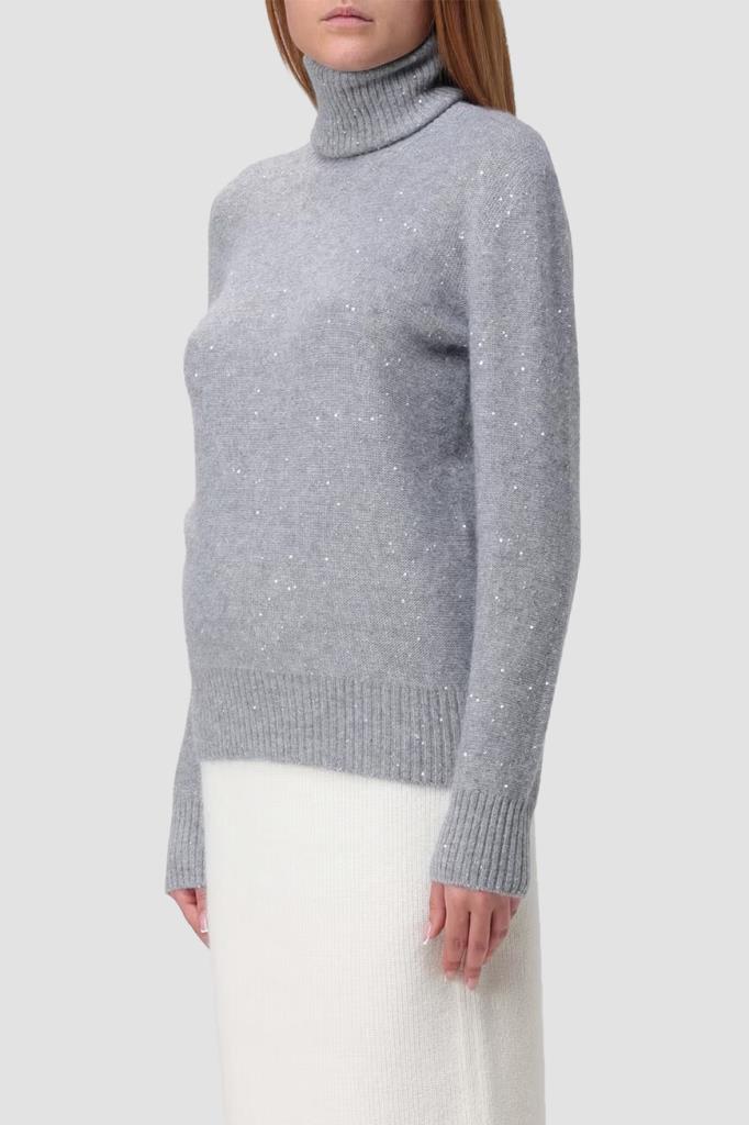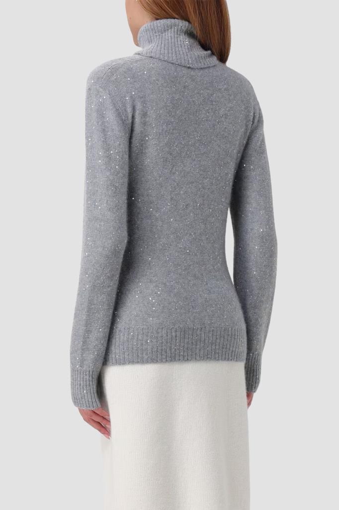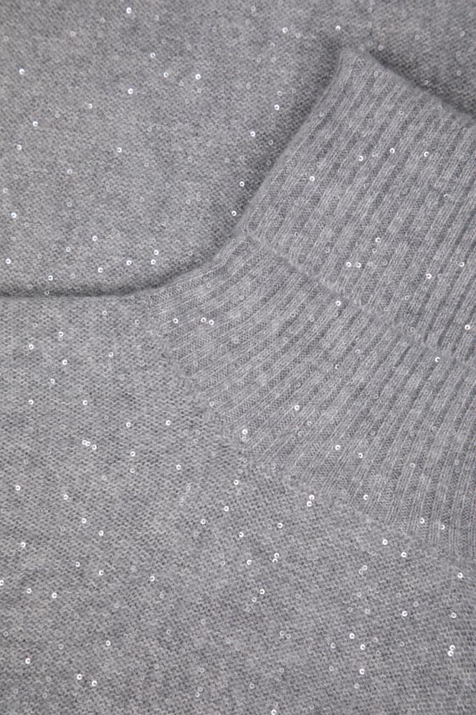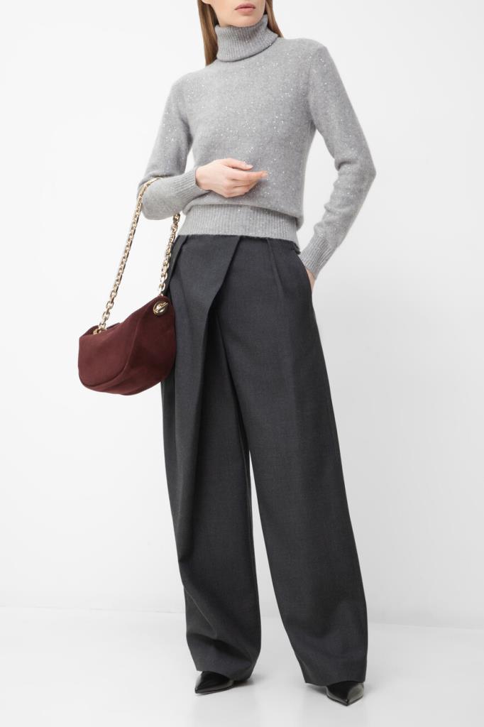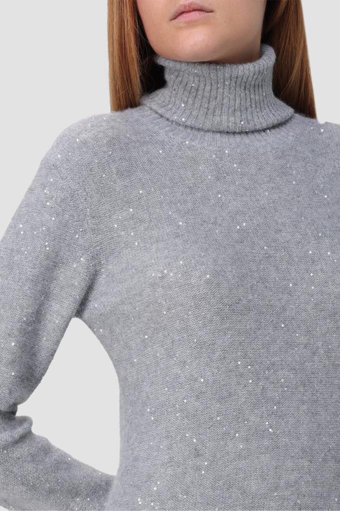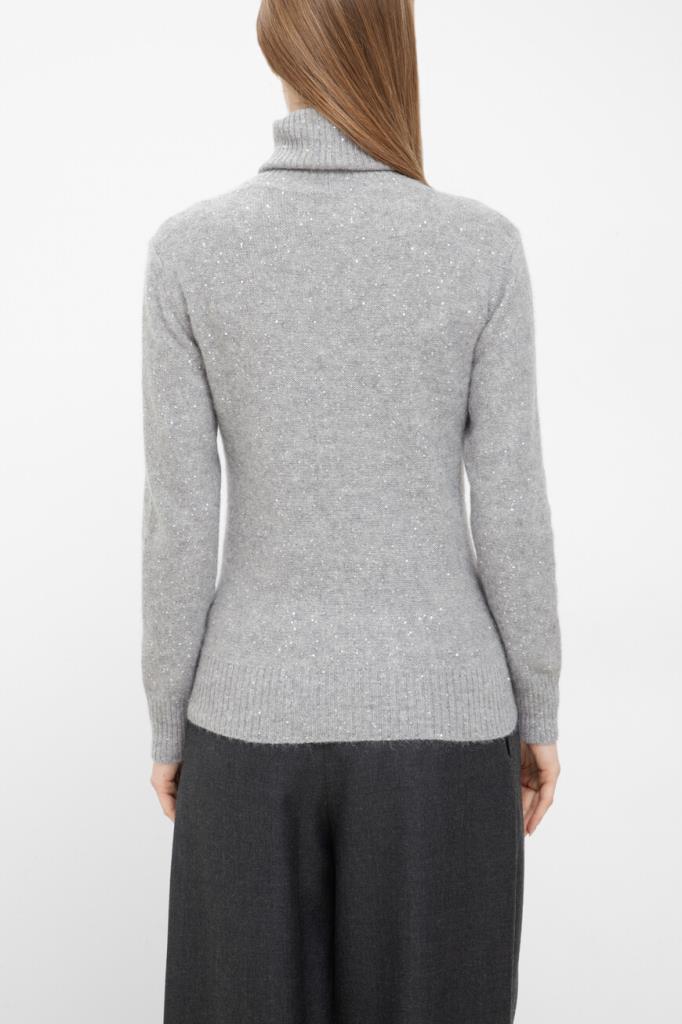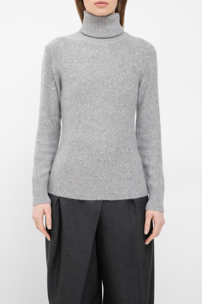 Прилегающий свитер серого цвета от Fabiana Filippi. Фасон изделия из мягкого трикотажа на основе шерсти virgin, кашемира, гладкого шёлка, прочного полиэфира и пряжи альпаки предполагает наличие высокого воротника фасона «гольф» и манжет-резинок на рукавах и широком поясе для оптимальной посадки по фигуре. Декором выступают микропайетки, распространяющие сияющие блики по поверхности модели.