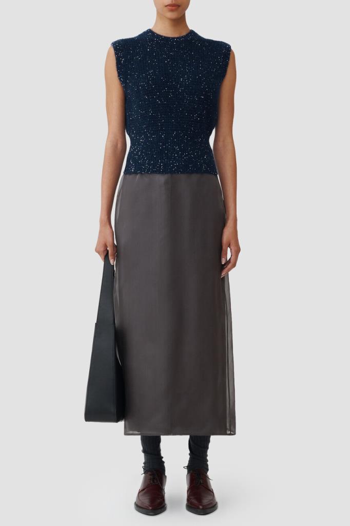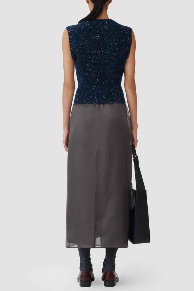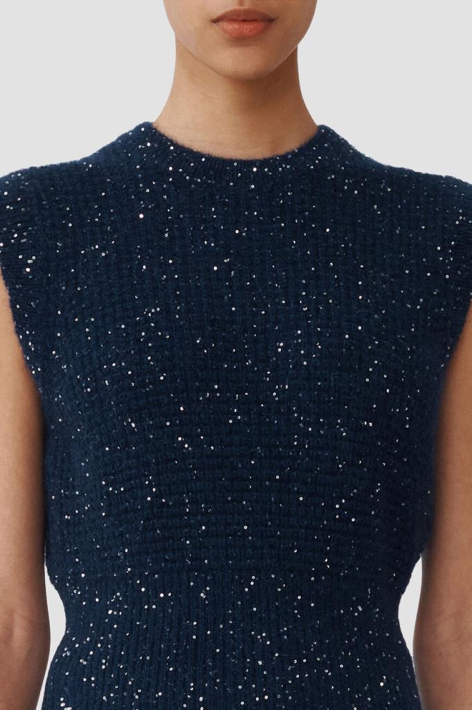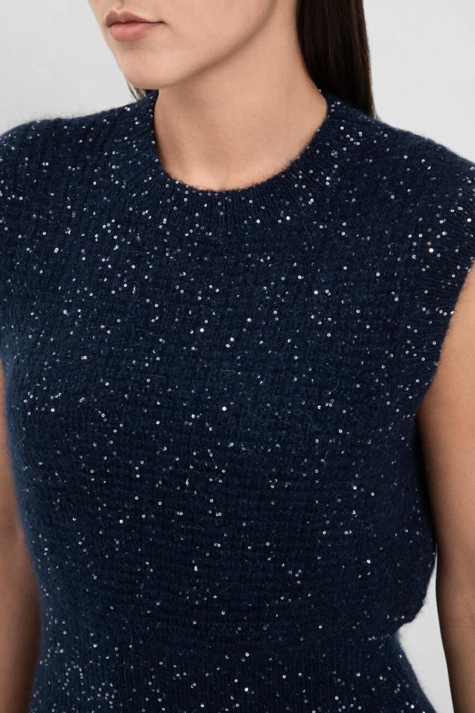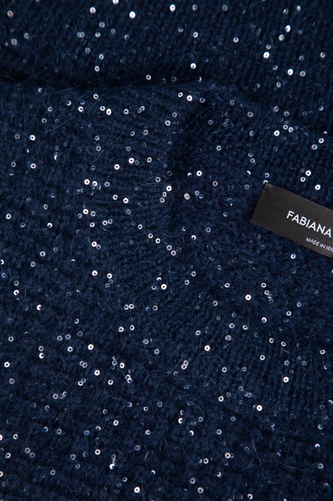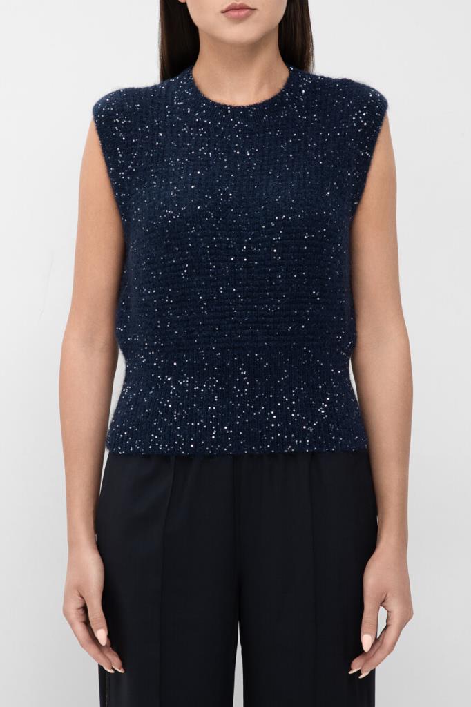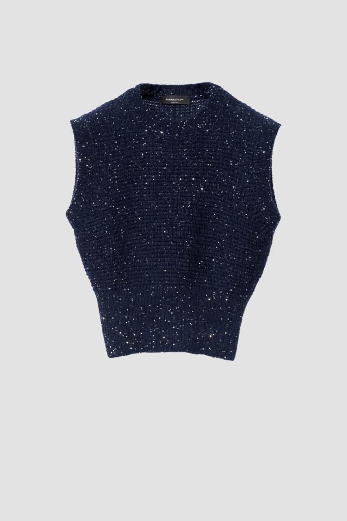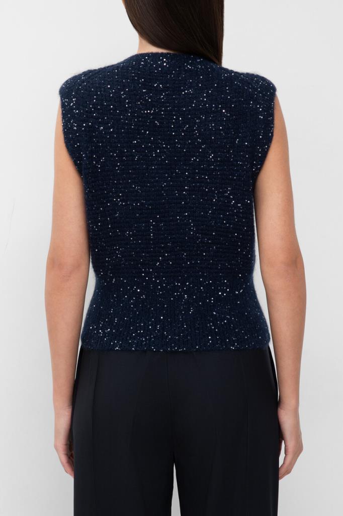 Прилегающий жилет без застёжки от Fabiana Filippi. Для создания укороченной модели тёмно-синего цвета используется мягкий трикотаж на основе шерсти, хлопка, прочного нейлона и мохера, обладающего гипоаллергенными и изоляционными свойствами. Декором выступают фактурный геометрический узор и россыпь блестящих пайеток, распределённых по поверхности пряжи.