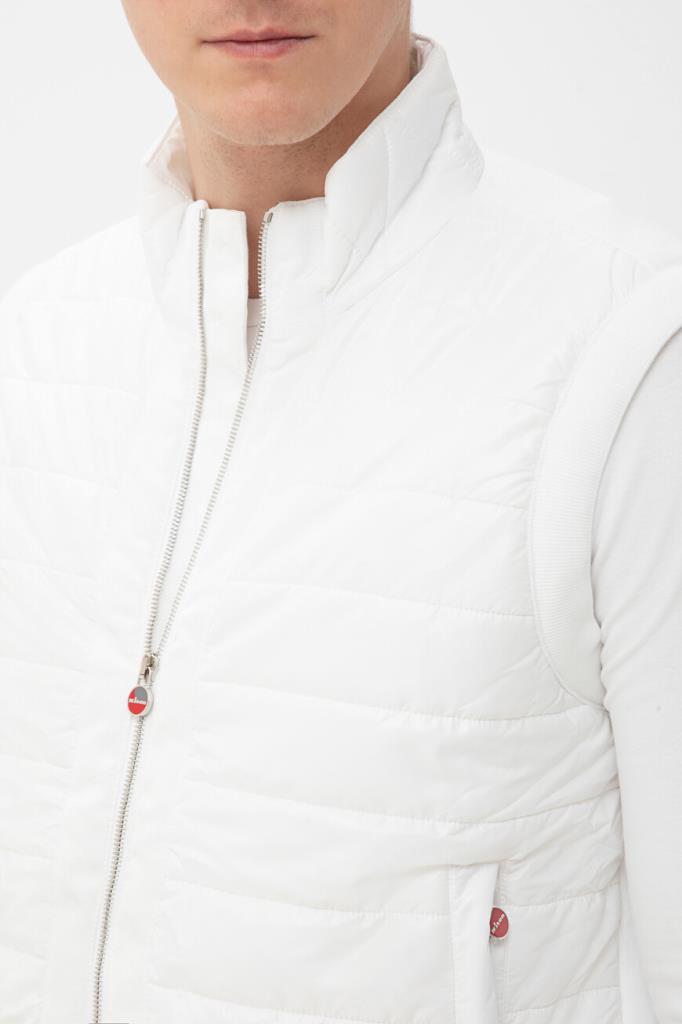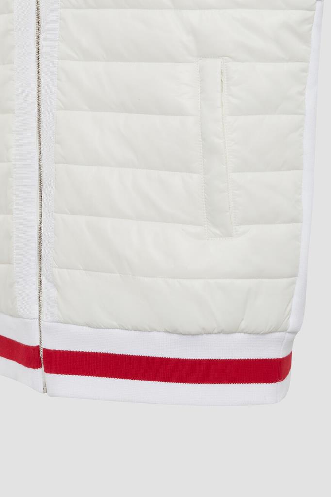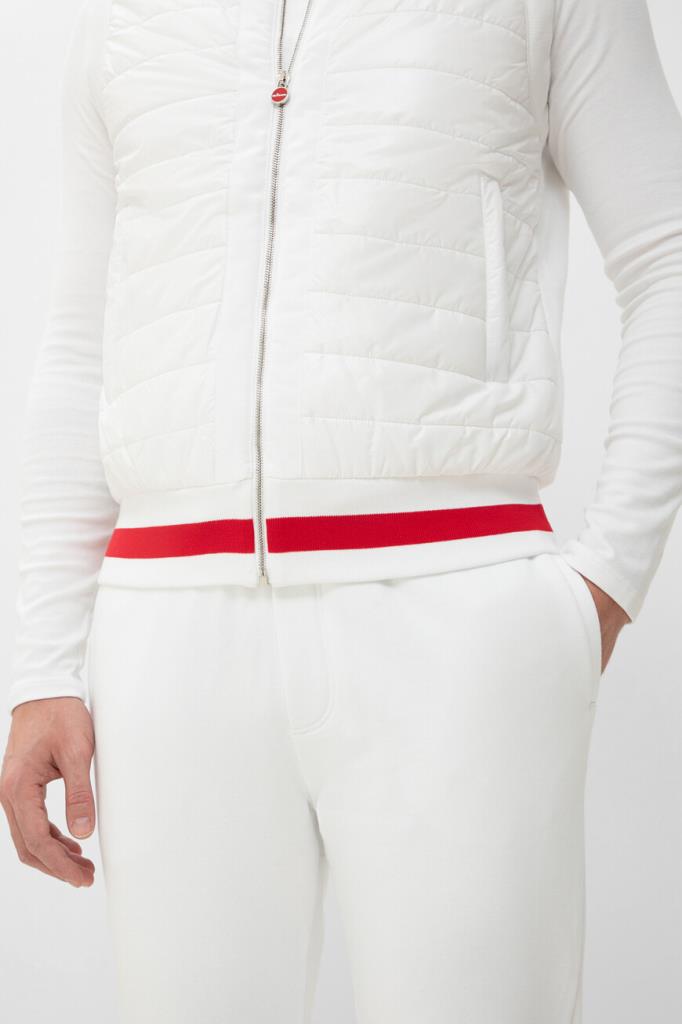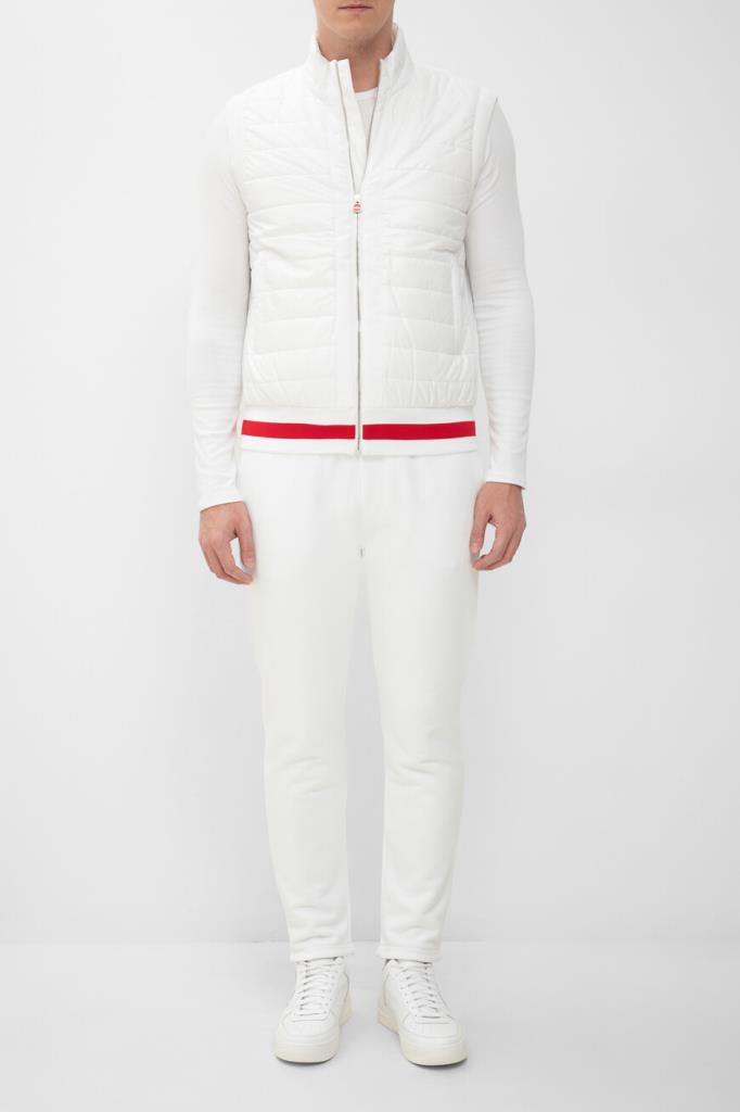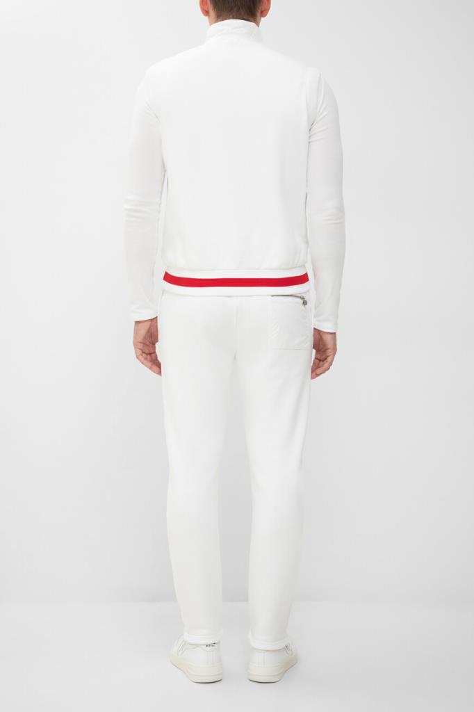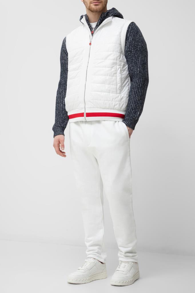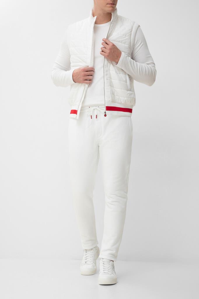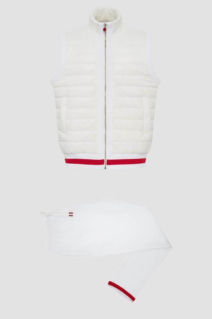 Белый спортивный костюм от бренда Kiton. Комплект состоит из жилета на молнии с брендированным бегунком и брюк свободного кроя. Изделия сшиты из мягкого хлопкового трикотажа и декорированы ярко-красной полосой на поясе жилета. Жилет оснащён стёгаными вставками из полиуретана спереди по бокам и на воротнике, а брюки подобраны на кулиску для регулировки посадки. Модель дополнена фактурной подкладкой из хлопка стрейч в тон.