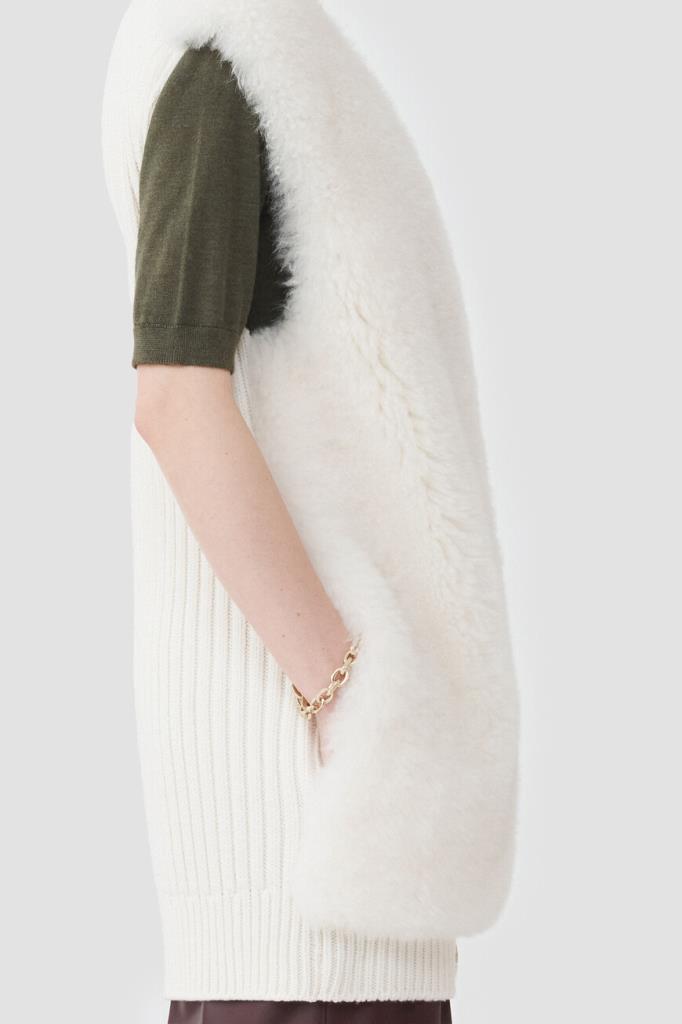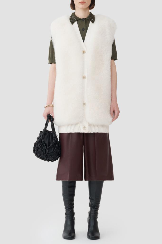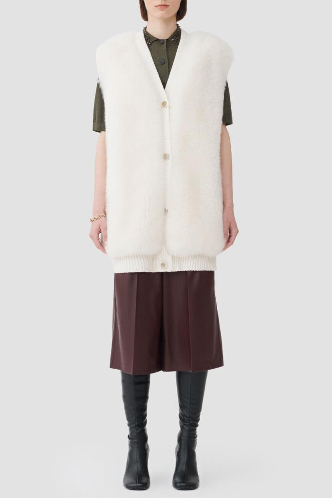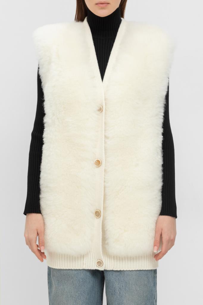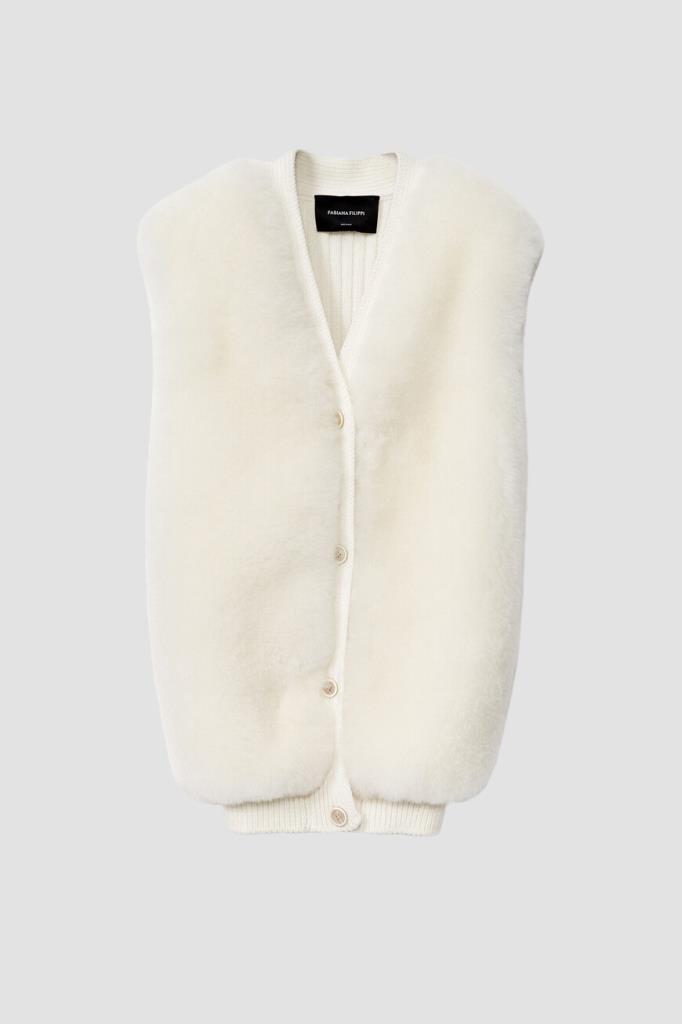 Жилет Fabiana Filippi вдохновлён эстетикой верхней одежды. Для изготовления комбинированной модели используются мягкий кашемир белого цвета со вставкой из натурального меха ширлинга спереди. Изделие с неглубоким V-образным вырезом выступит в качестве верхнего слоя в демисезонных образах.