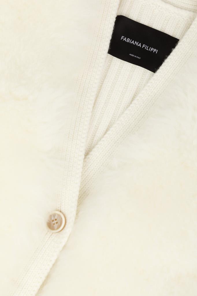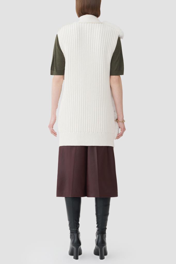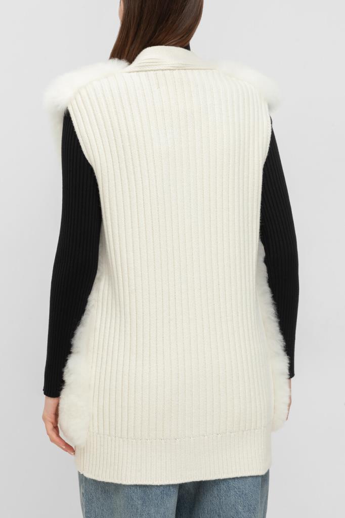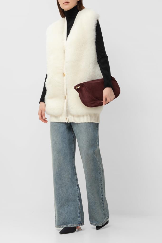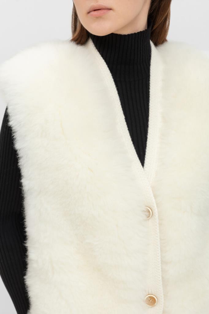 Жилет Fabiana Filippi вдохновлён эстетикой верхней одежды. Для изготовления комбинированной модели используются мягкий кашемир белого цвета со вставкой из натурального меха ширлинга спереди. Изделие с неглубоким V-образным вырезом выступит в качестве верхнего слоя в демисезонных образах.