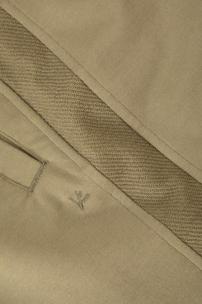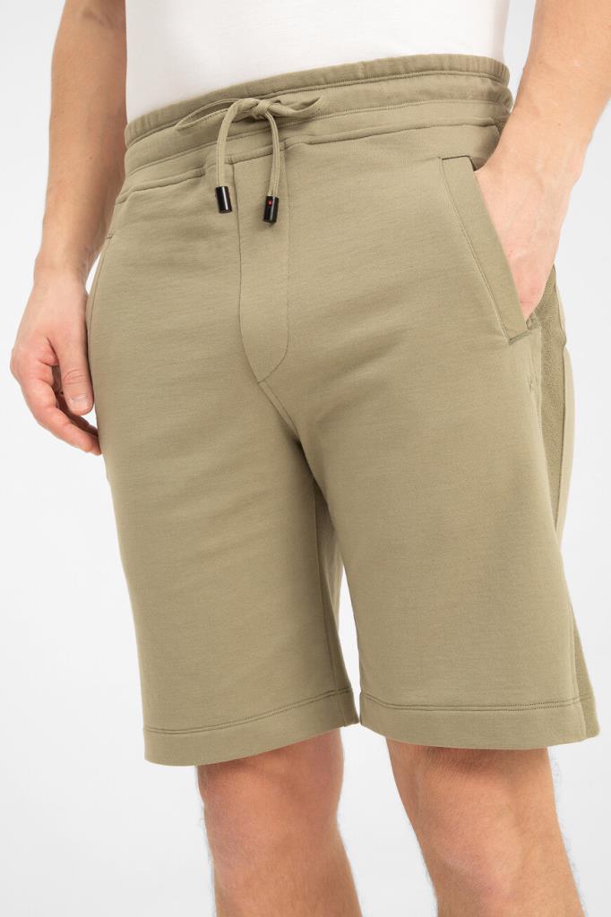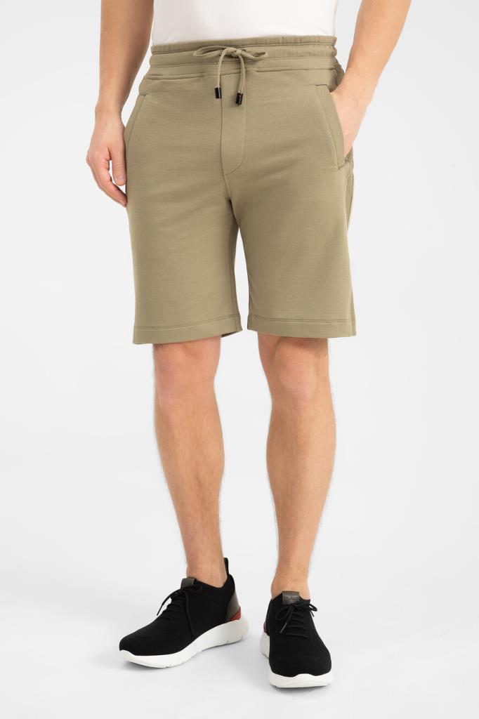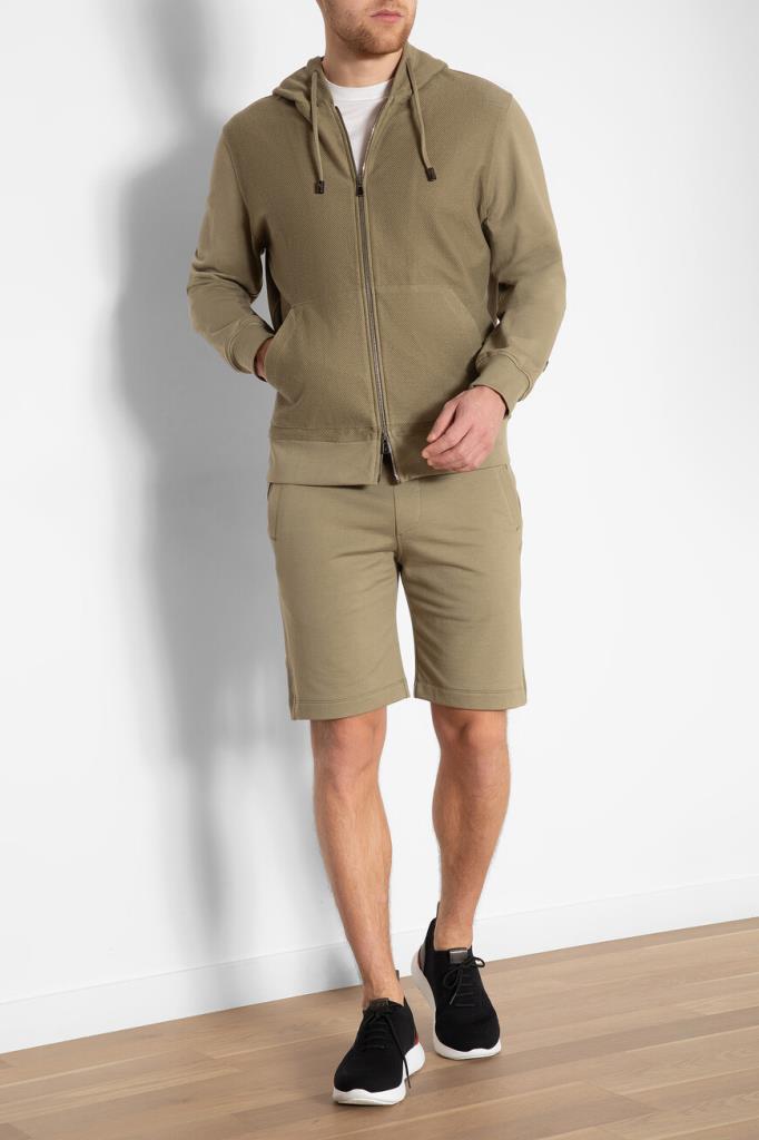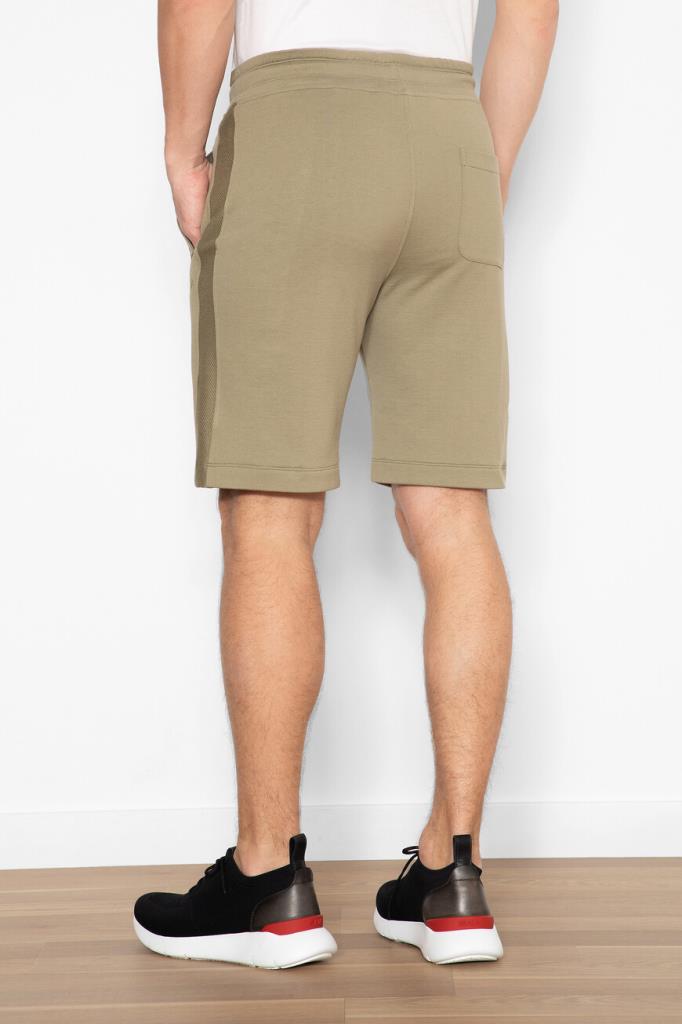 Шорты из хлопка и гладкого шёлка от Isaia. Модель с широким эластичным поясом на завязках выполнена в зелёном оттенке. Отличительной особенностью изделия стали фактурные лампасы. Шорты можно носить с толстовкой на молнии и чёрными кроссовками из сетчатого спортивного текстиля того же бренда.
