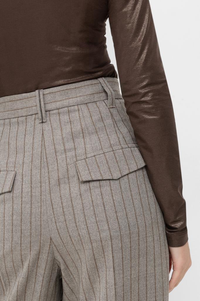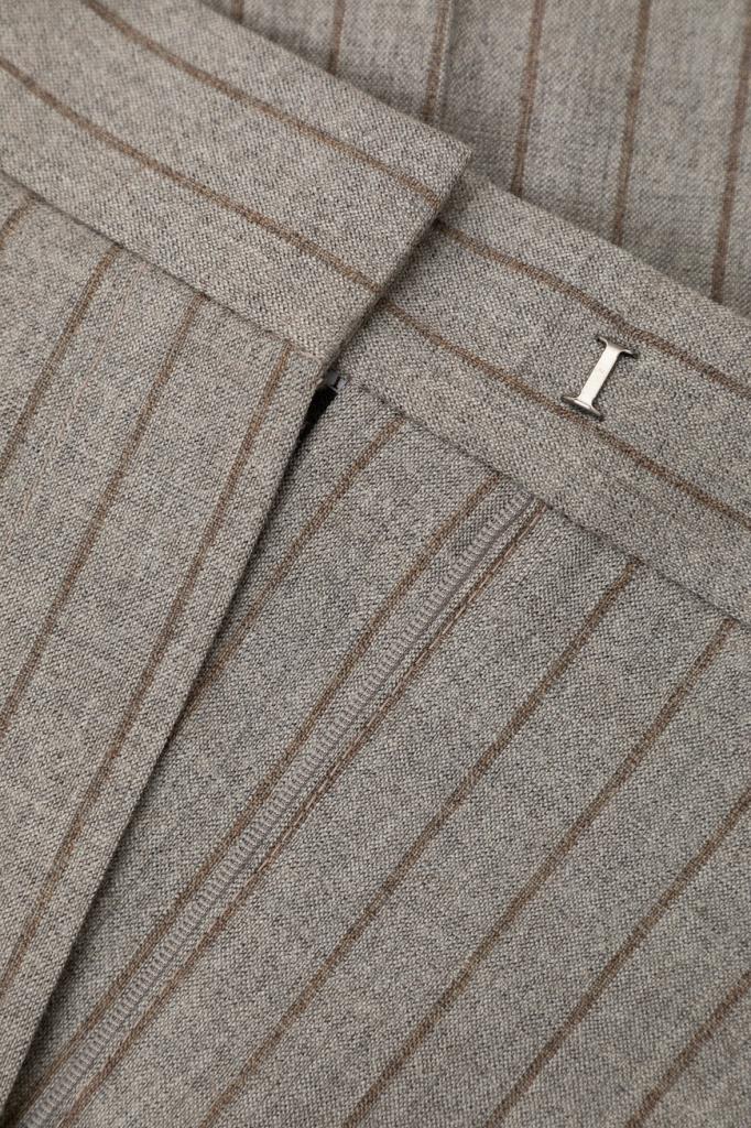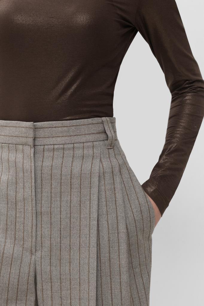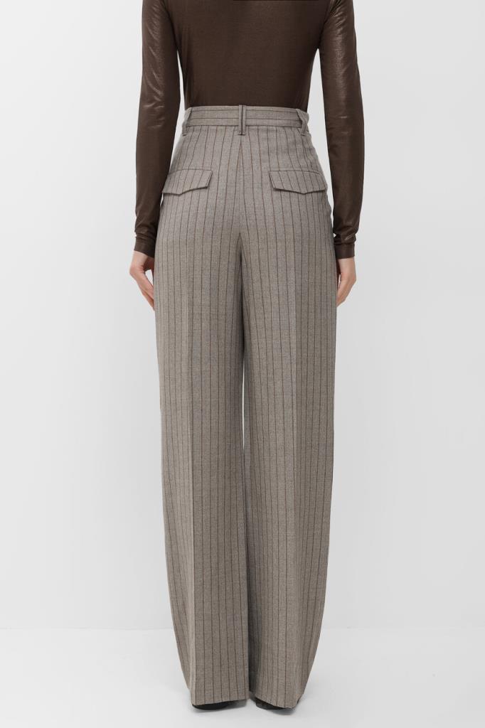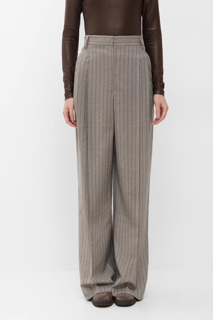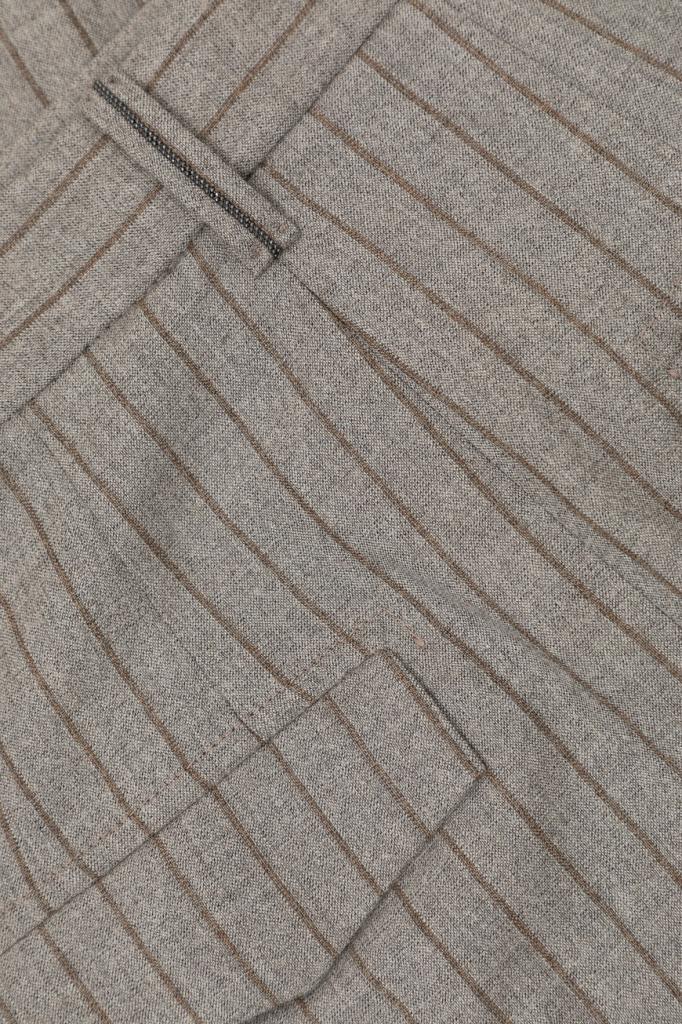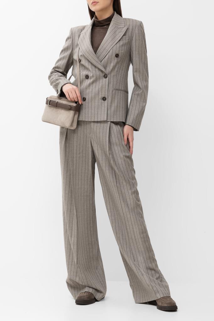 Широкие брюки BRUNELLO CUCINELLI с высокой линией талии. Модель изготовлена из мягкой вирджинской шерсти серого цвета и украшена полосатым геометрическим мотивом. Изделие с классическими стрелками и защипами сверху смотрится органично в комплекте с двубортным пиджаком на крупных роговых пуговицах и прямоугольной сумкой из той же коллекции.