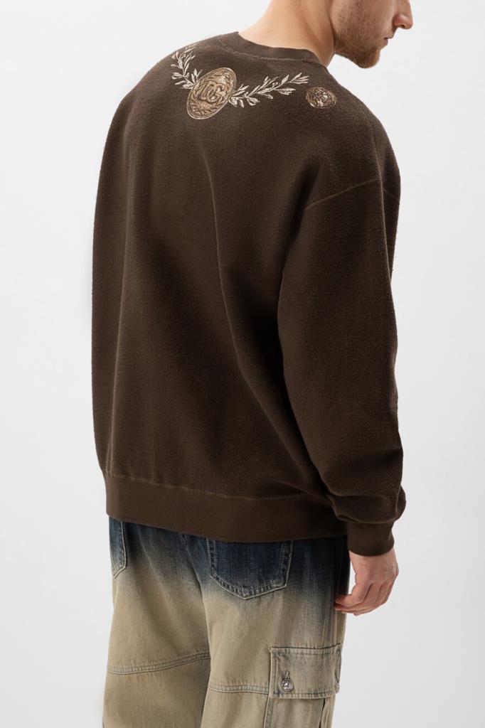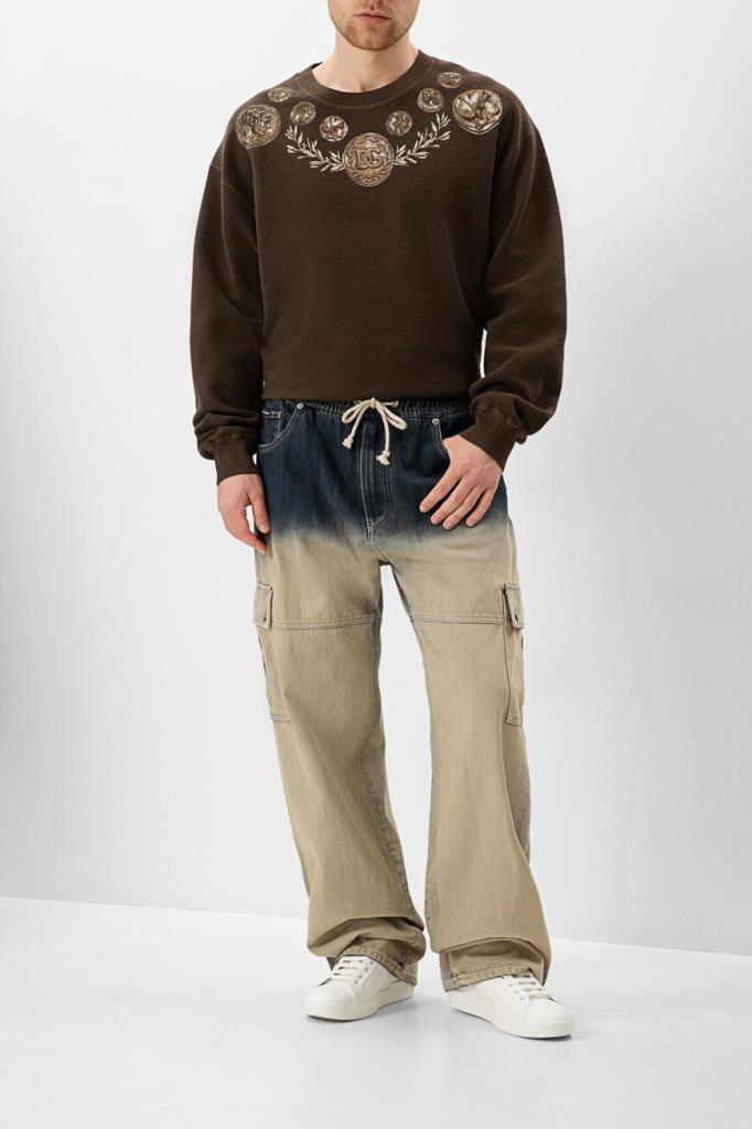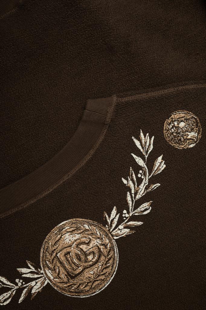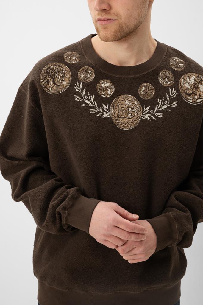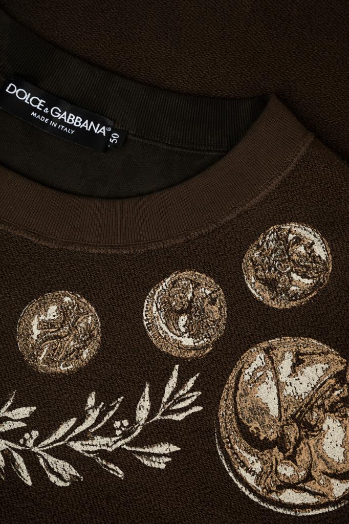 Тёмно-коричневая толстовка Dolce & Gabbana из мягкого хлопкового джерси. Коллекция Roma воздаёт дань красоте и величию Древнего Рима. Изделие с видимыми швами и фактурной поверхностью как бы «вывернуто наизнанку» и дополнено прорезиненным дизайнерским принтом с изображением старинных монет и лаврового листа.