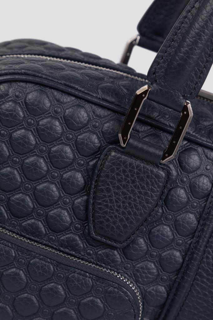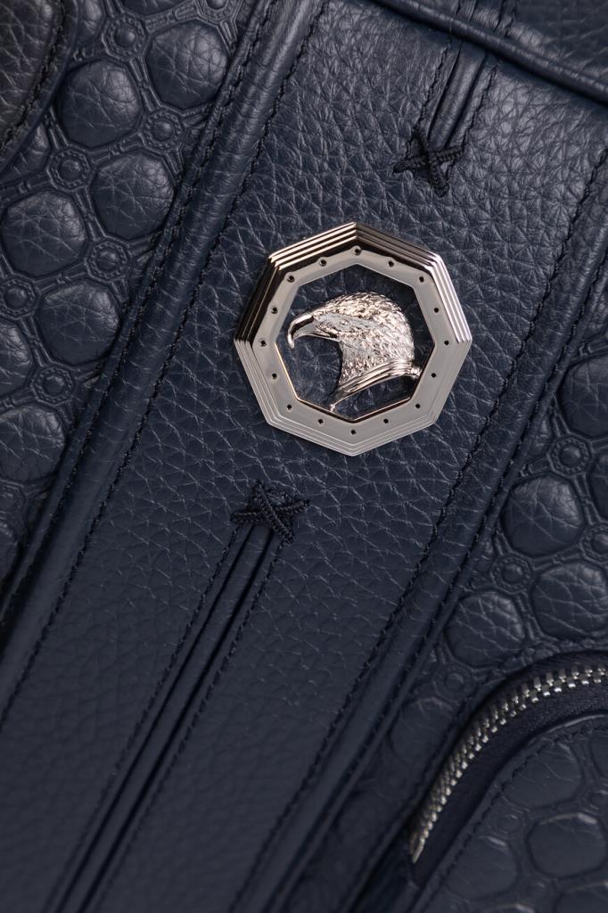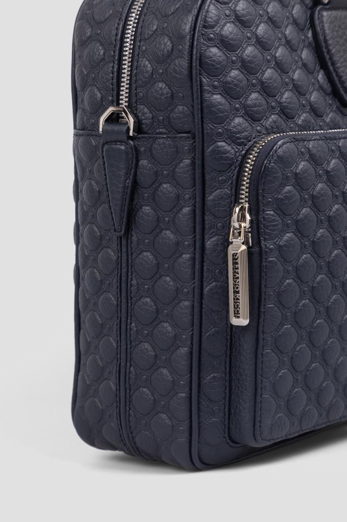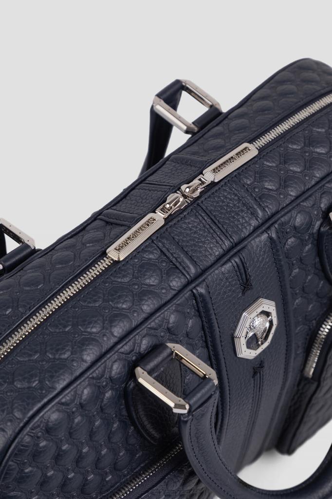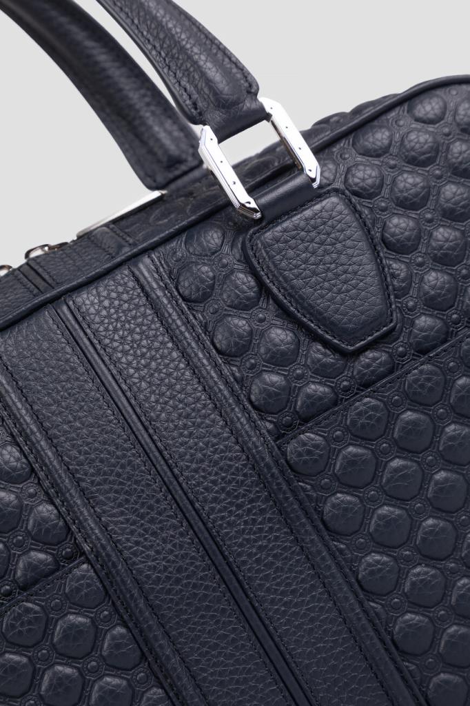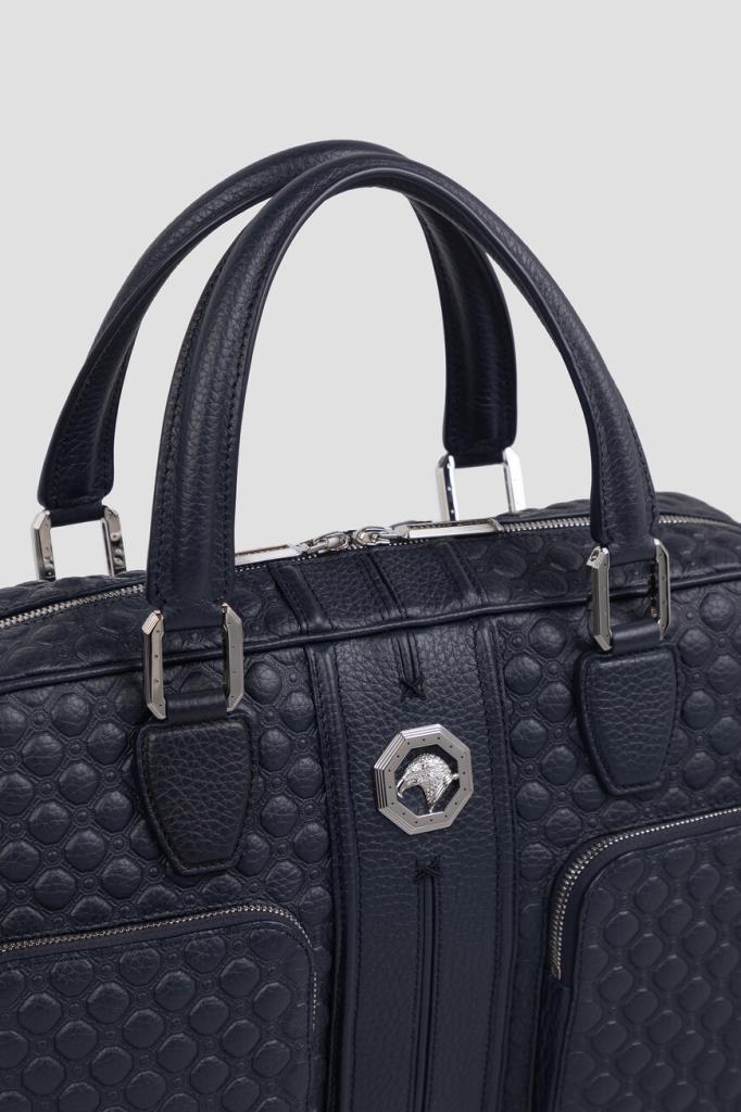 Портфель Stefano Ricci на молнии с двумя брендированными пуллерами. Для изготовления вместительной модели тёмно-синего цвета используется матовая телячья кожа. Отличительными деталями являются фактурный геометрический узор в тон, рельефные полосы-узор спереди и сзади посередине и знаковая символика Дома, размещённая на лицевой стенке - голова орла в восьмиграннике с отделкой из драгоценного палладия.