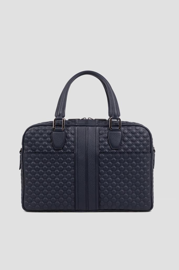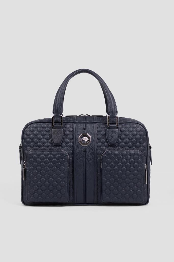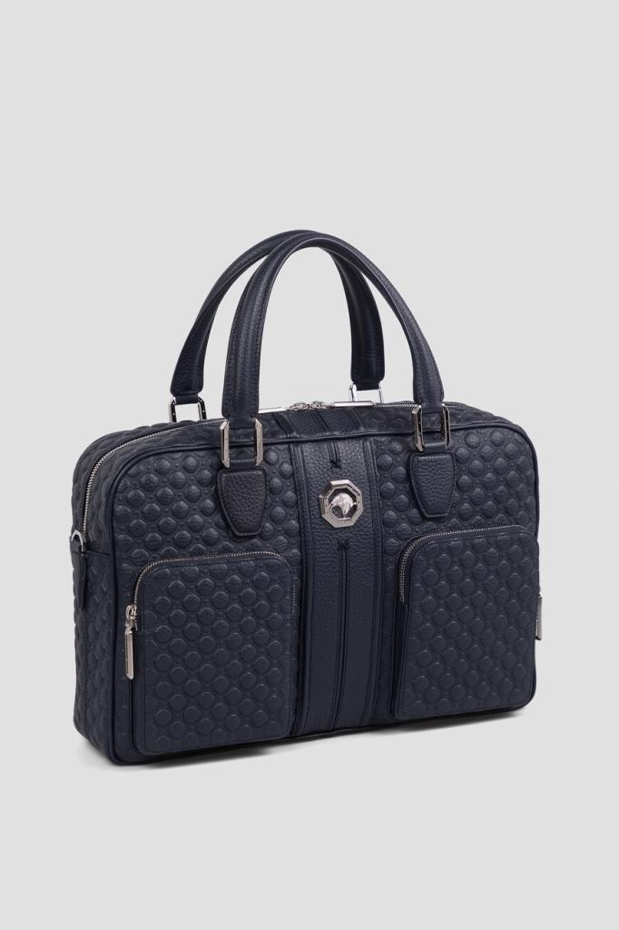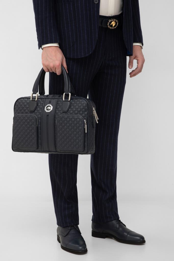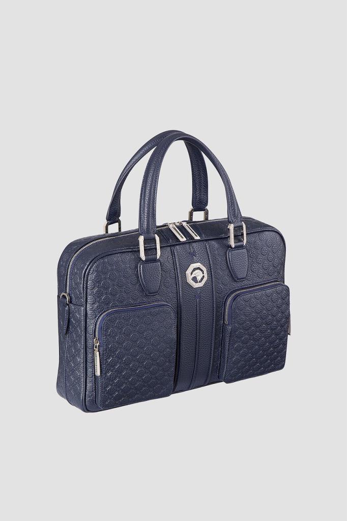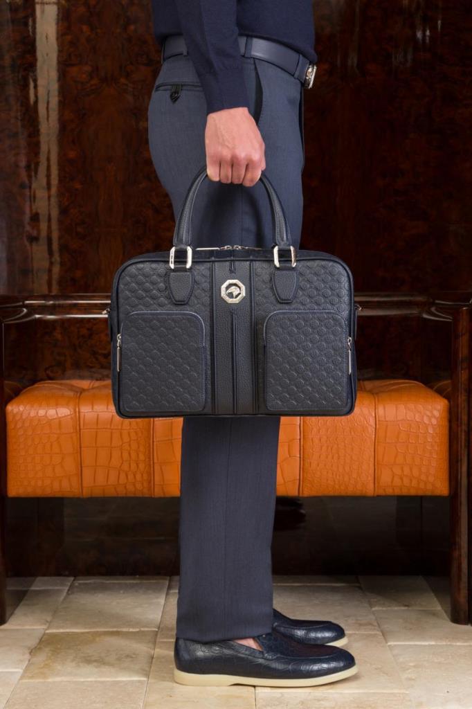 Портфель Stefano Ricci на молнии с двумя брендированными пуллерами. Для изготовления вместительной модели тёмно-синего цвета используется матовая телячья кожа. Отличительными деталями являются фактурный геометрический узор в тон, рельефные полосы-узор спереди и сзади посередине и знаковая символика Дома, размещённая на лицевой стенке - голова орла в восьмиграннике с отделкой из драгоценного палладия.