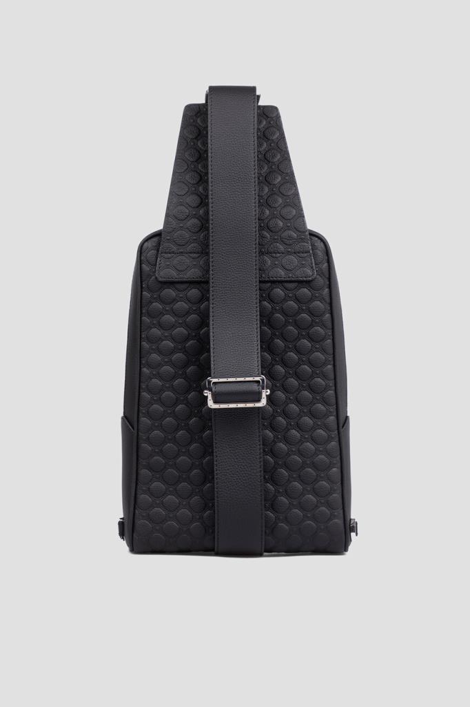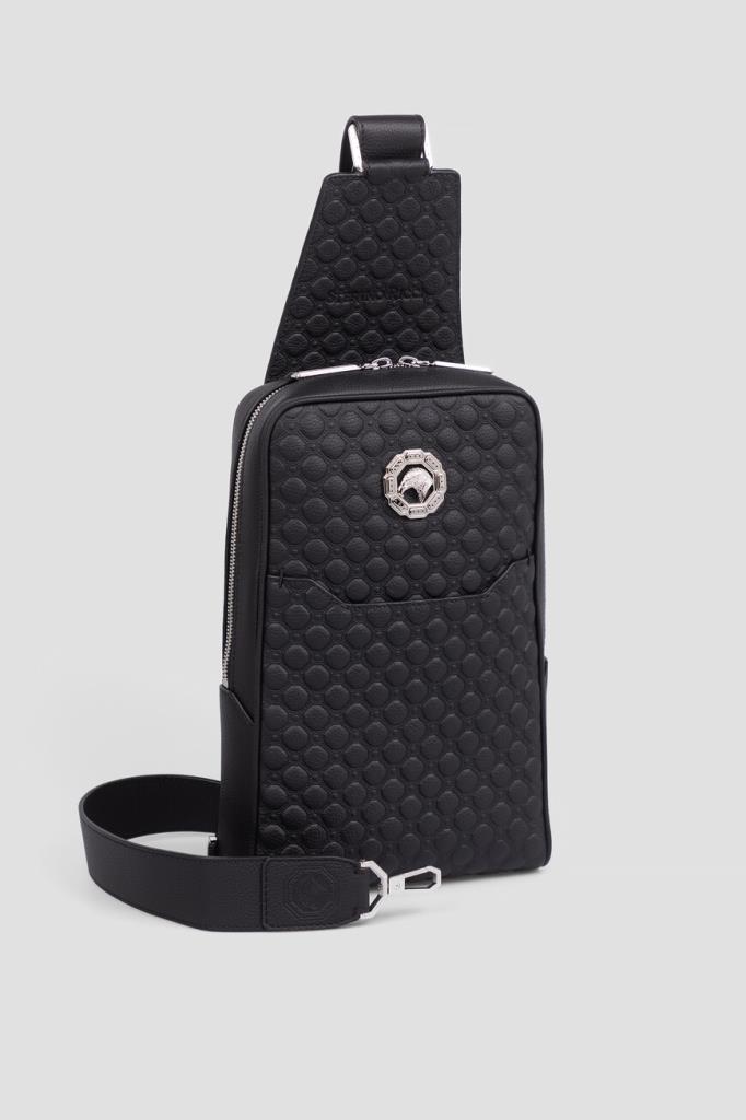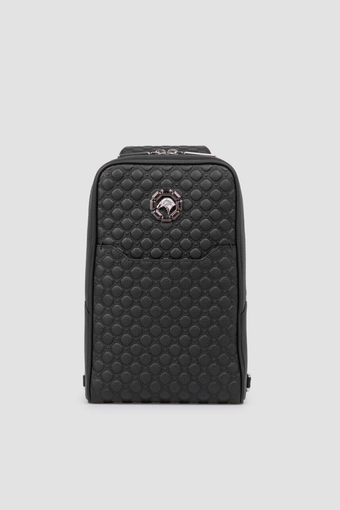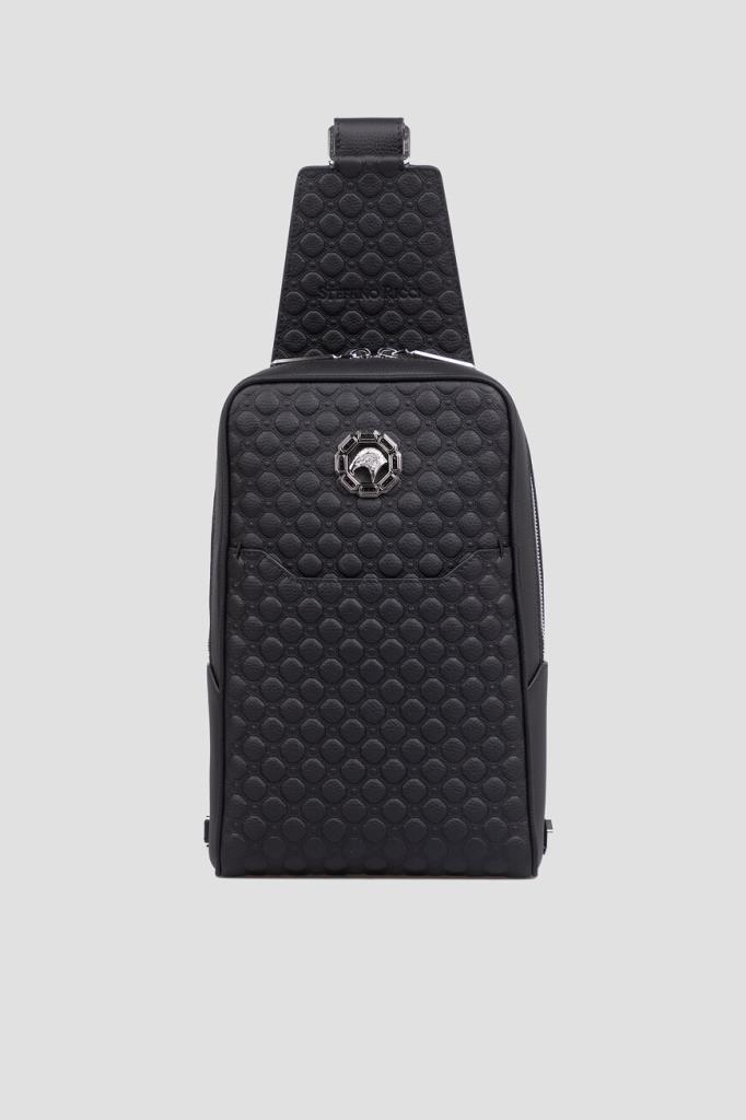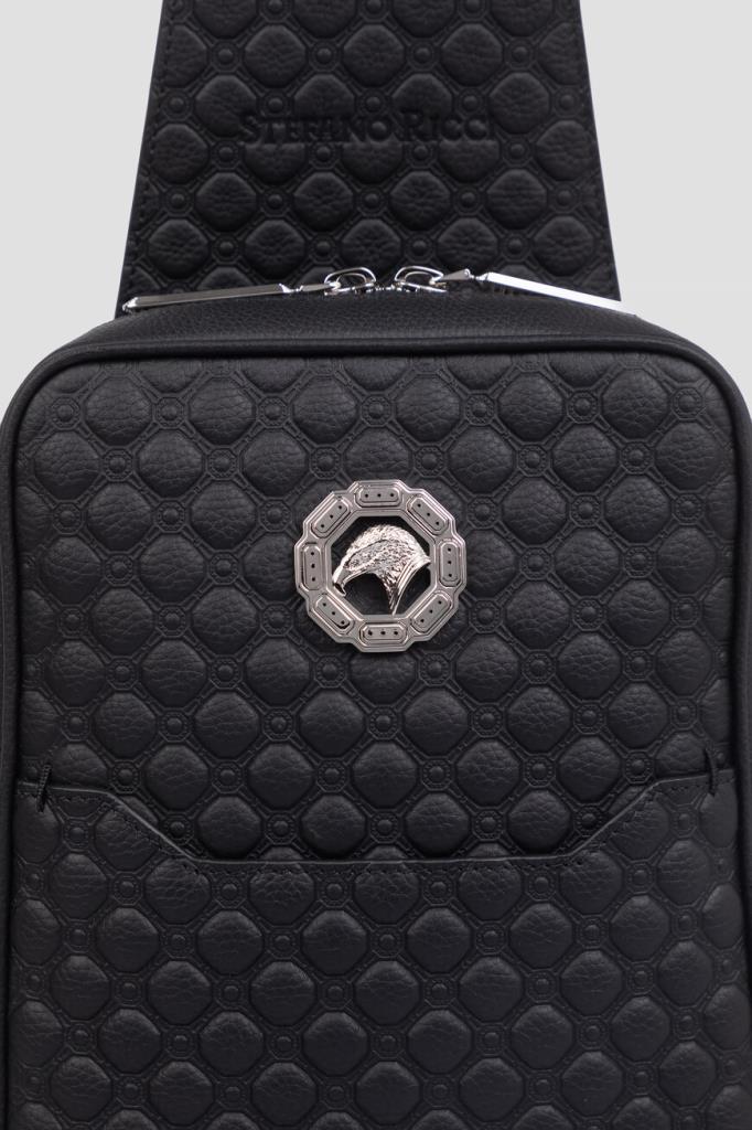 Рюкзак кросс-боди от Stefano Ricci выполнен вручную. Для создания функциональной модели чёрного цвета выбрана матовая телячья кожа. Изделие украшают фактурный геометрический узор в тон и серебристая знаковая символика Дома - голова орла в восьмиграннике спереди. Аксессуар с просторным внутренним отделением застёгивается молнией с двумя брендированными пуллерами и отличается наличием широкого плечевого ремня для переноски с двумя вариантами крепления.