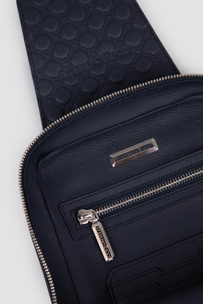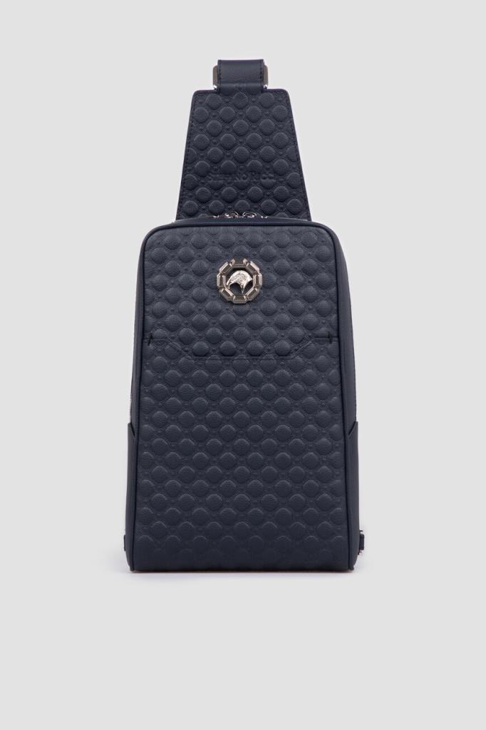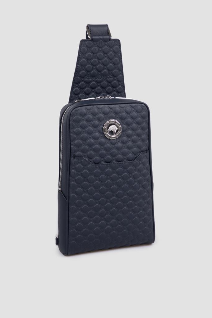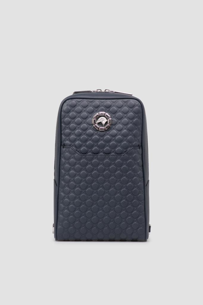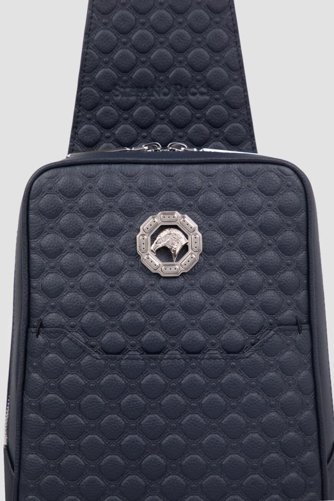 Тёмно-синий рюкзак кросс-боди со знаковой символикой Stefano Ricci. Изделие ручной работы выполнено из матовой телячьей кожи с фактурным геометрическим узором в тон. Внутри расположены одно большое отделение с двумя боковыми карманами, один из которых прорезной на молнии, а другой накладной и без застёжки, а также три слота для кредитных карт.