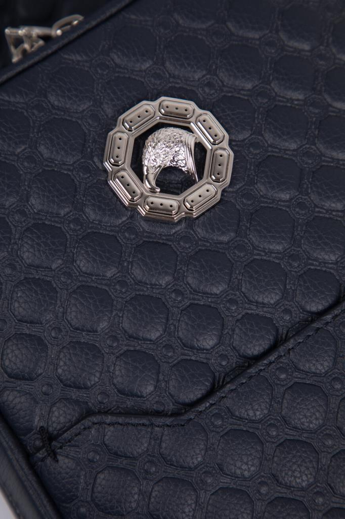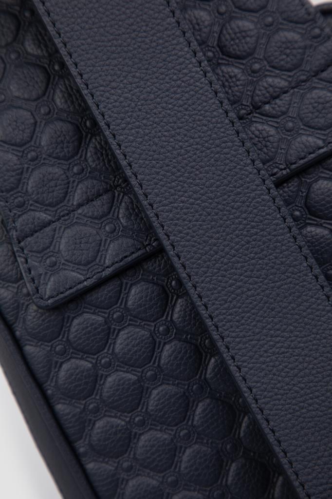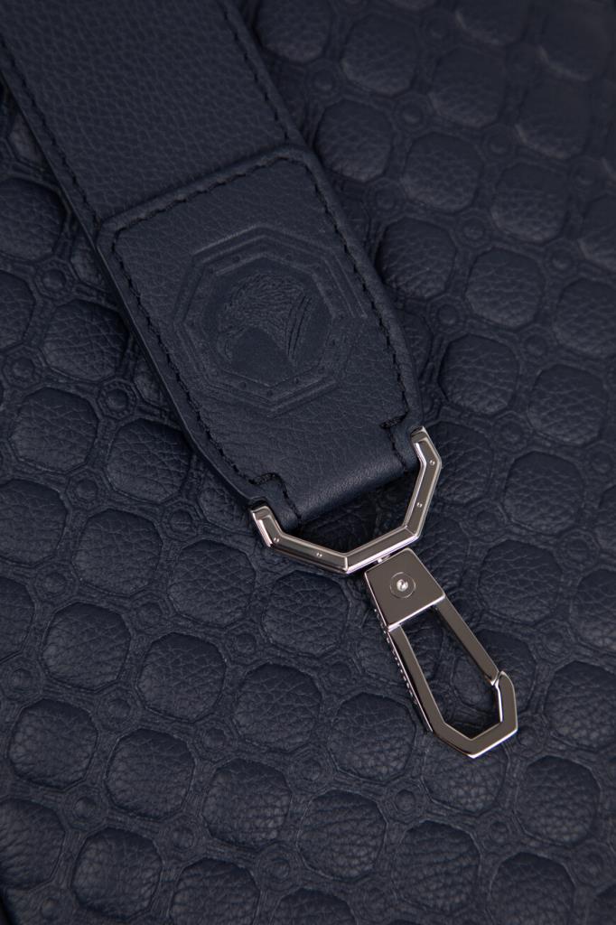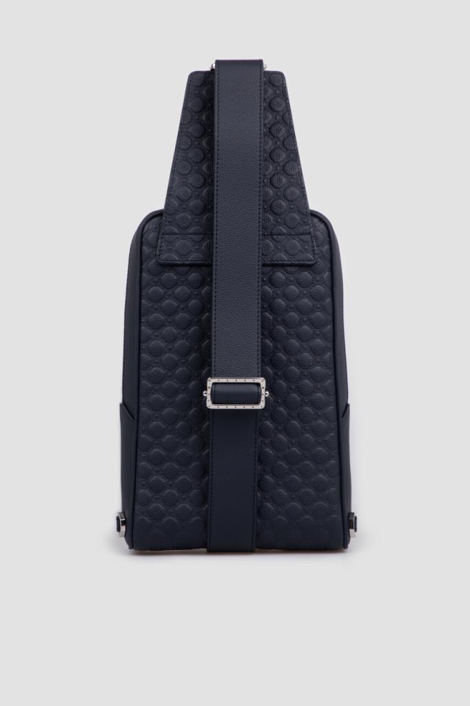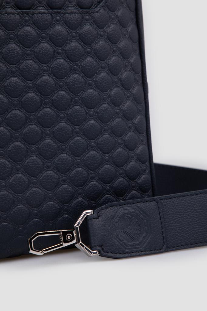 Тёмно-синий рюкзак кросс-боди со знаковой символикой Stefano Ricci. Изделие ручной работы выполнено из матовой телячьей кожи с фактурным геометрическим узором в тон. Внутри расположены одно большое отделение с двумя боковыми карманами, один из которых прорезной на молнии, а другой накладной и без застёжки, а также три слота для кредитных карт.