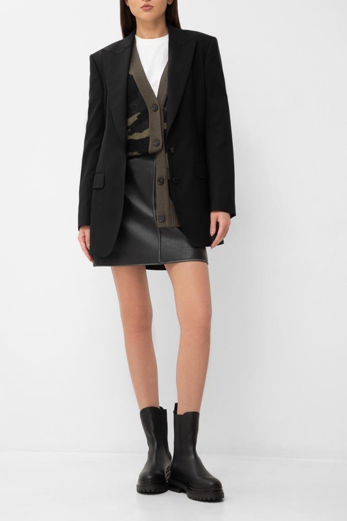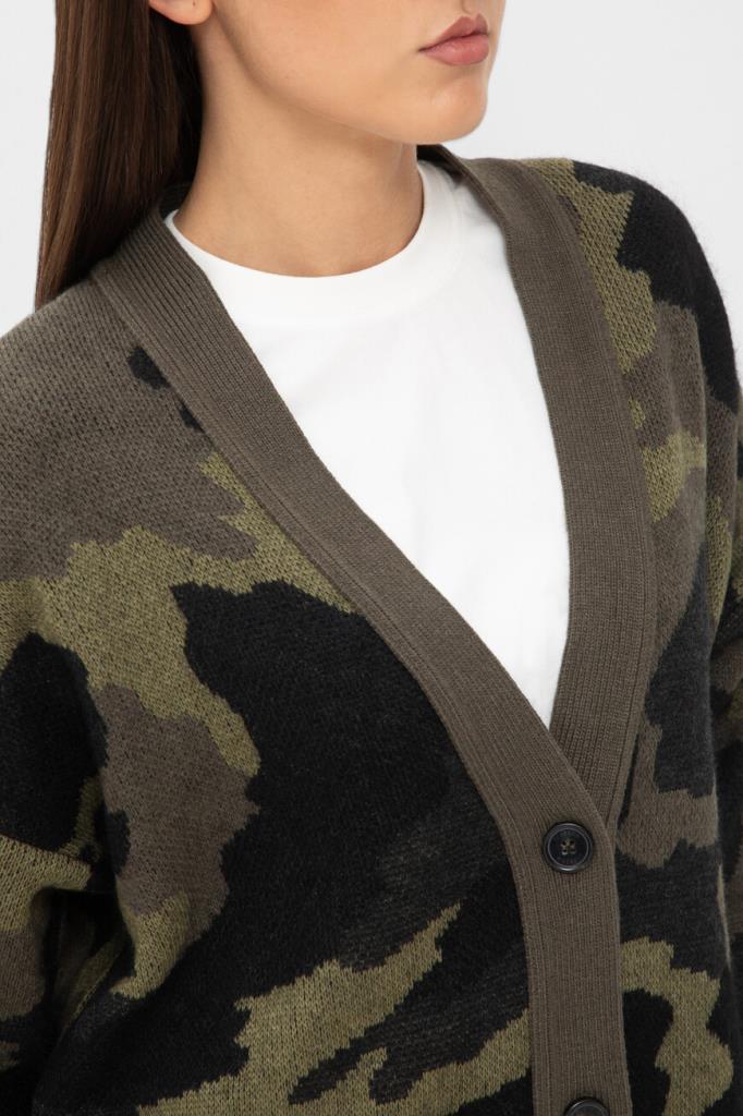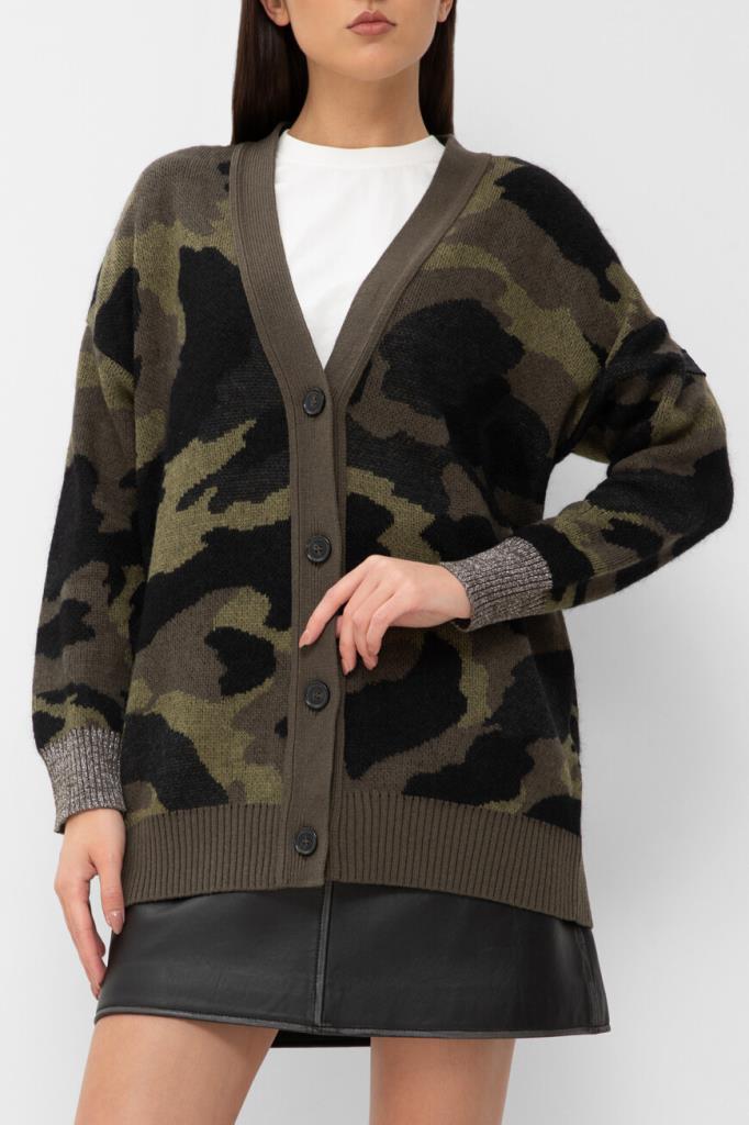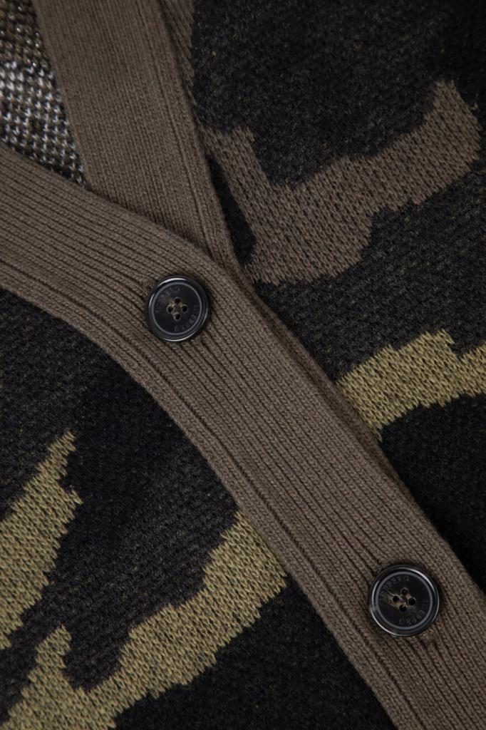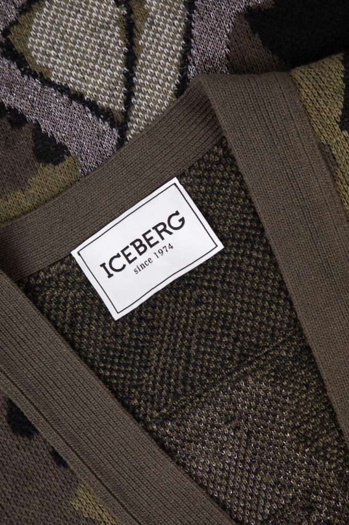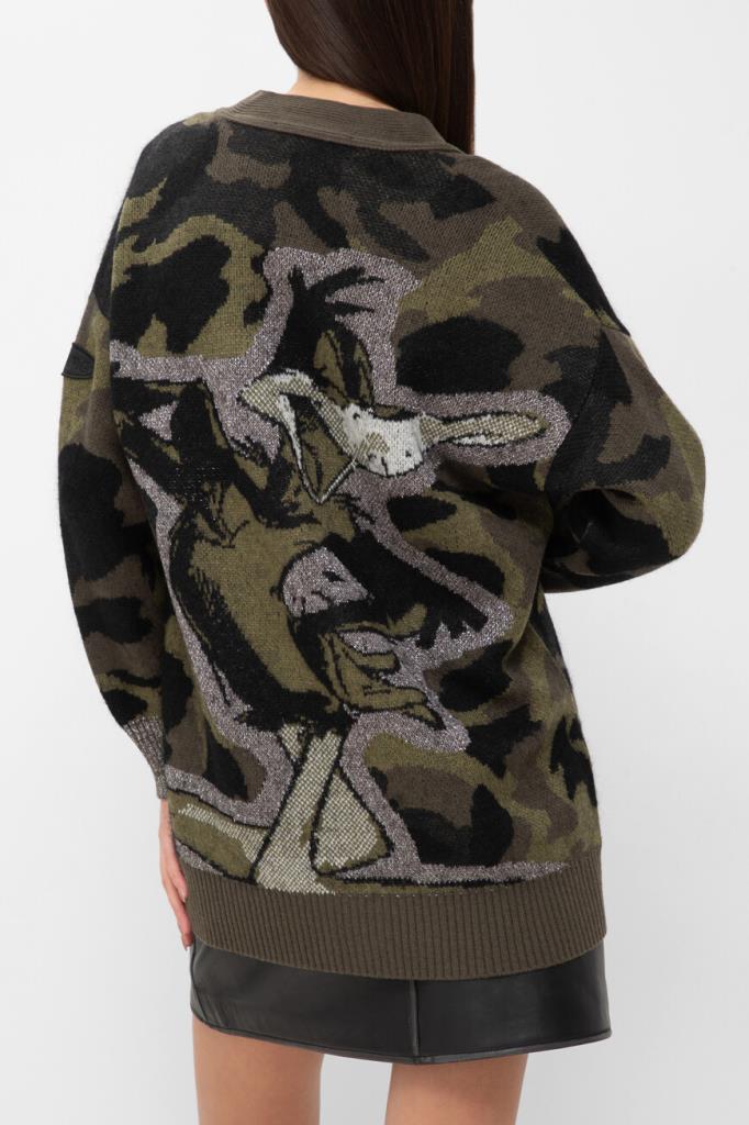 Кардиган на крупных роговых пуговицах от бренда ICEBERG. Модель из мягкого трикотажа на основе шерсти, кашемира, прочного вискозного волокна, пряжи из шерсти ангорской козы (мохера), нейлона и полиэфира выполнена в зелёной гамме. Отличительными особенностями изделия стали камуфляжный принт, крупное изображение Даффи Дака, персонажа мультсериала “LOONEY TUNES”, на спинке и патч с вышитым логотипом Дома на левом рукаве.