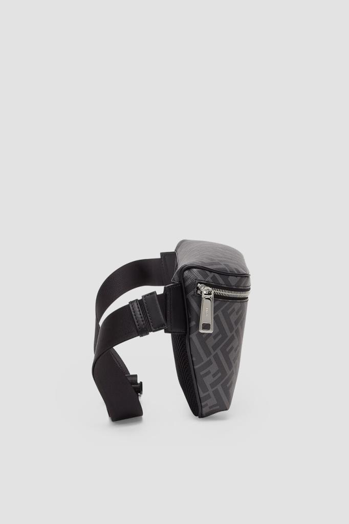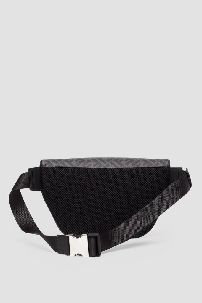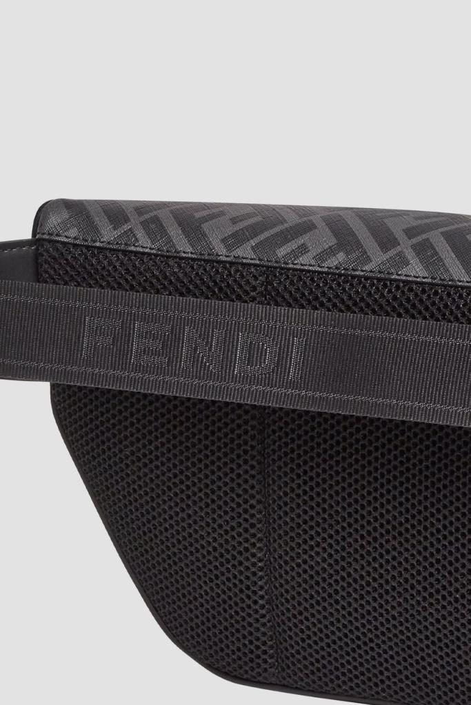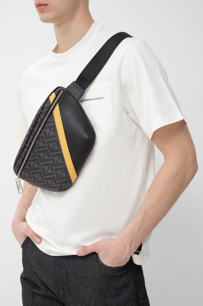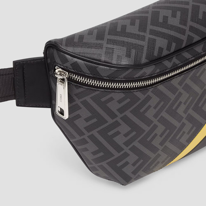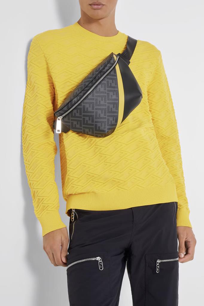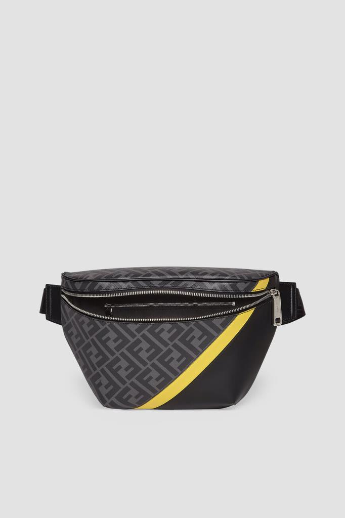 Поясная сумка Fendi Diagonal с просторным внутренним отделением на молнии. Для создания повседневного аксессуара выбрана плотная ткань гофре с крупным жаккардовым мотивом «FF» в серых оттенках. Декором выступают чёрная кожаная вставка спереди и диагональная полоса жёлтого цвета, выполненная в технике интарсия и разделяющая между собой два вида материалов с разными текстурами. Особенностями изделия также являются брендированный поясной ремень с кожаными деталями и металлической застёжкой-фастексом и плоский внутренний карман на серебристой молнии.