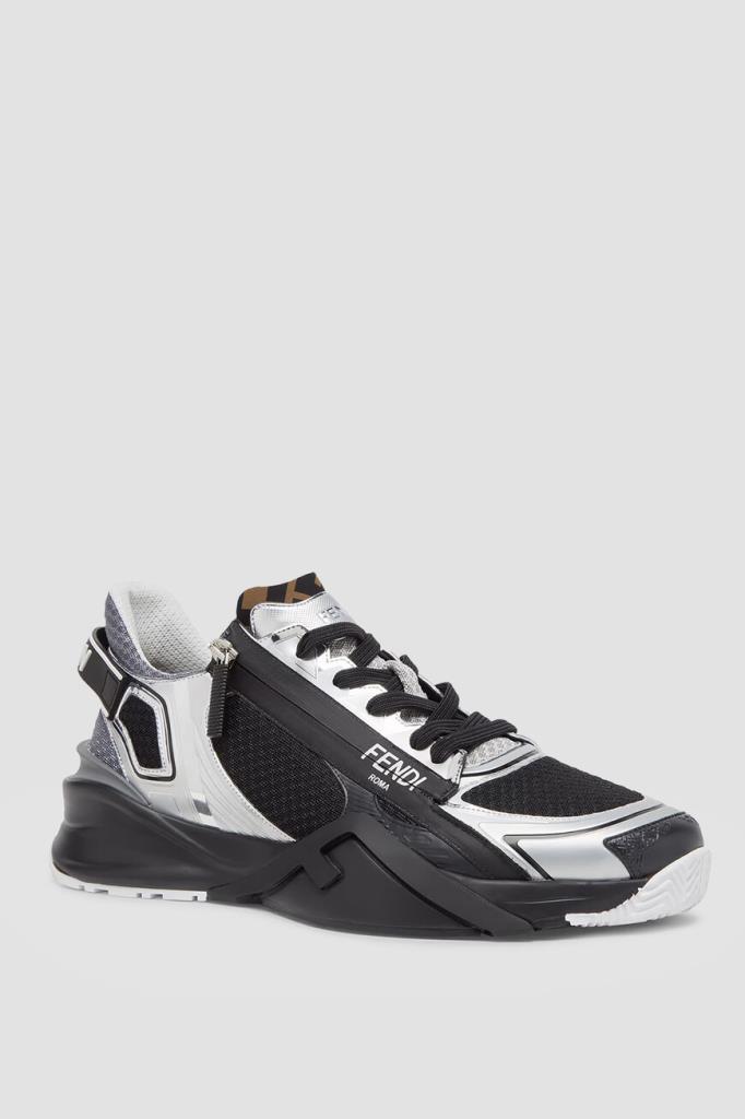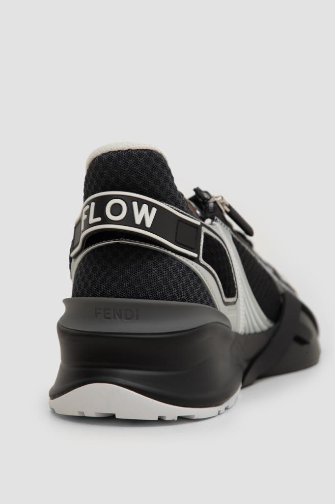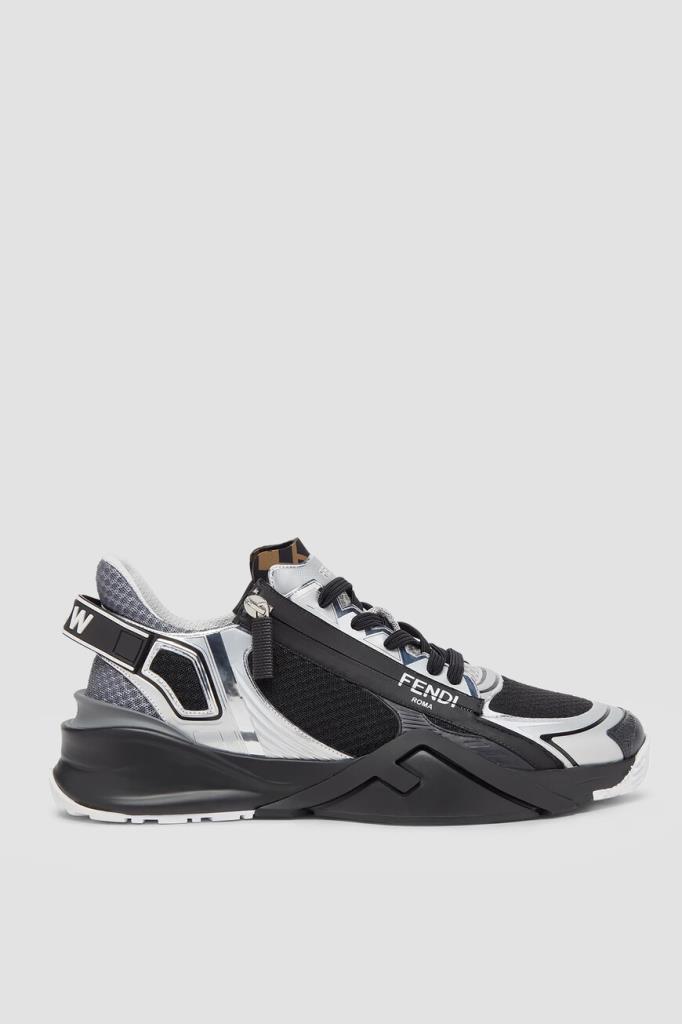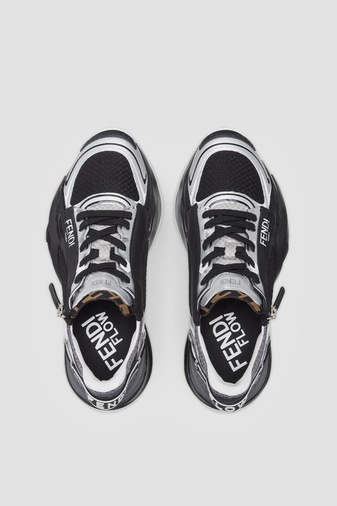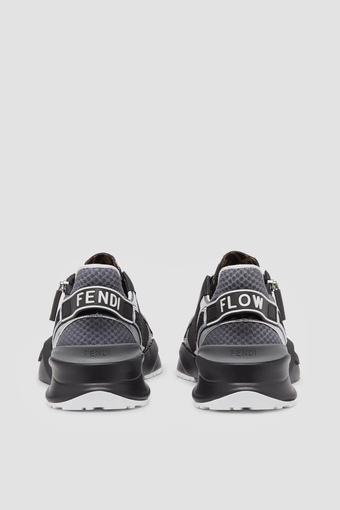 Сникеры-слипоны Fendi Flow с усиленной перекрёстной шнуровкой. Для создания удобной пары используется плотная сетка чёрного и серого оттенков с металлизированными вставками и объёмными элементами. Модель установлена на чёрно-белую скульптурную подошву из каучука с рифлением снизу и крупными фактурными накладками в виде литер «F» на боковинах. Принадлежность изделия Дому обозначена коричневой полосой «FF» и тиснёным логотипом Fendi на язычке, белой надписью «Fendi Roma» на застёжке-молнии сбоку и рельефными логотипом и названием модели, размещёнными на ремешках с окантовкой в задней части.