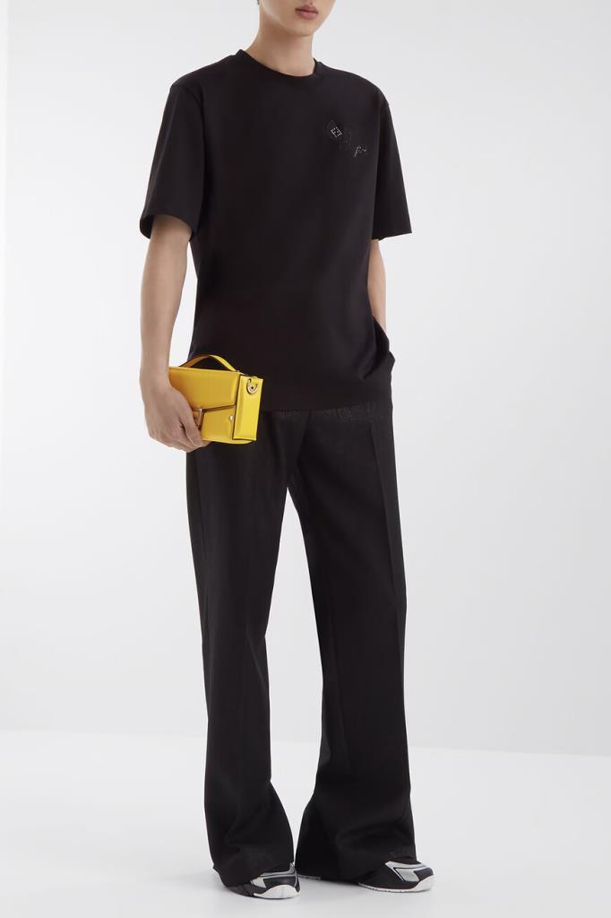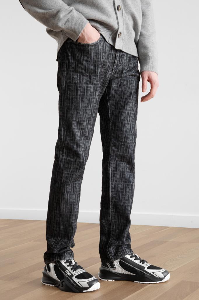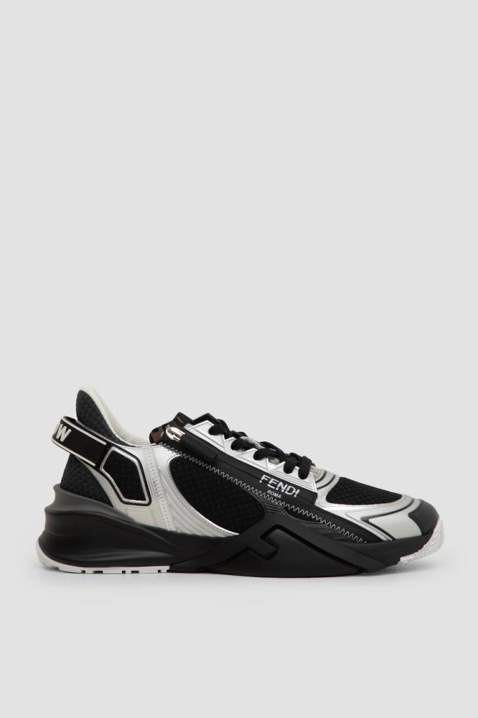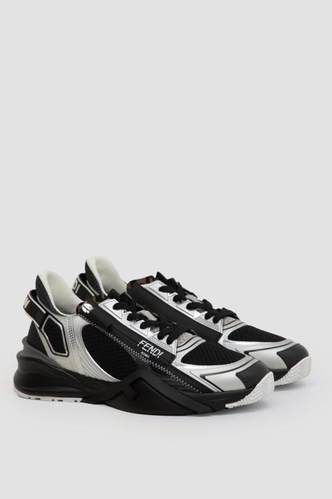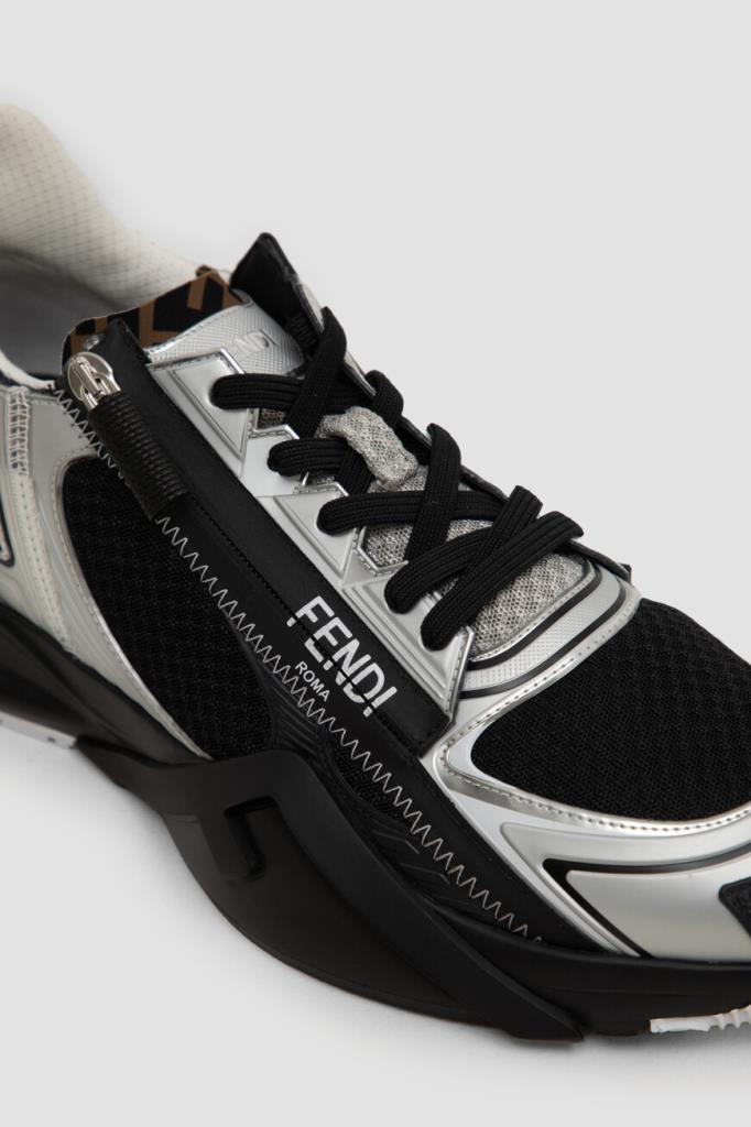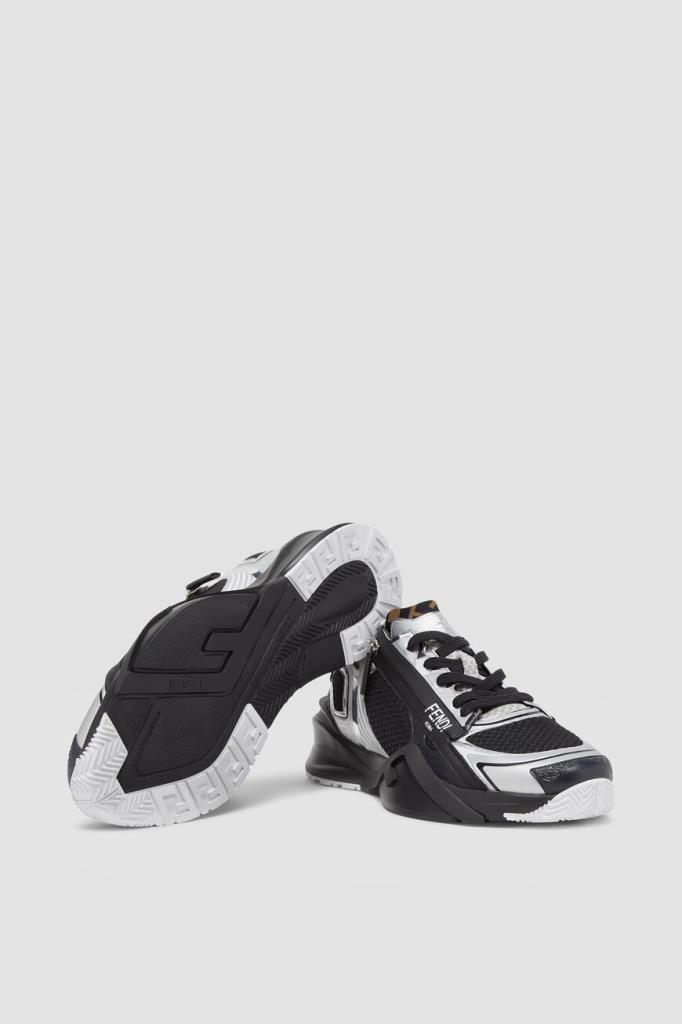 Сникеры-слипоны Fendi Flow с усиленной перекрёстной шнуровкой. Для создания удобной пары используется плотная сетка чёрного и серого оттенков с металлизированными вставками и объёмными элементами. Модель установлена на чёрно-белую скульптурную подошву из каучука с рифлением снизу и крупными фактурными накладками в виде литер «F» на боковинах. Принадлежность изделия Дому обозначена коричневой полосой «FF» и тиснёным логотипом Fendi на язычке, белой надписью «Fendi Roma» на застёжке-молнии сбоку и рельефными логотипом и названием модели, размещёнными на ремешках с окантовкой в задней части.