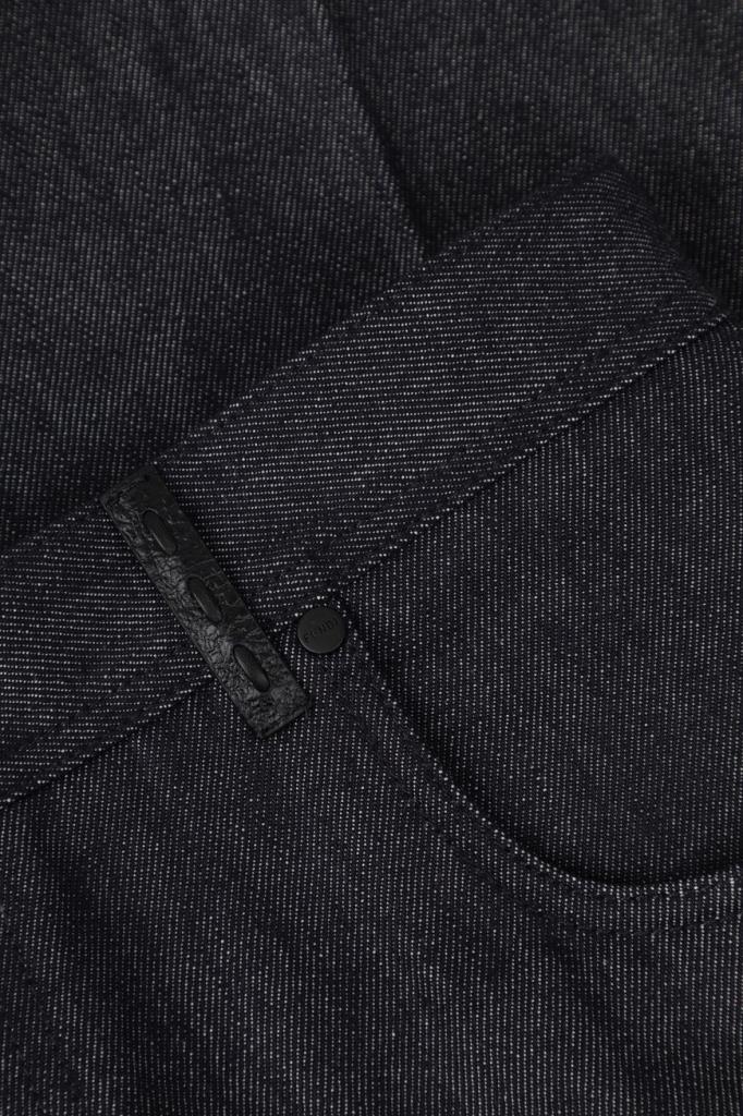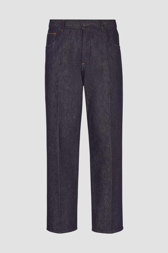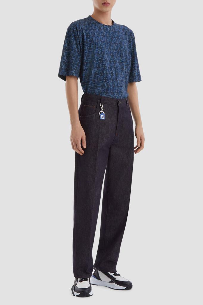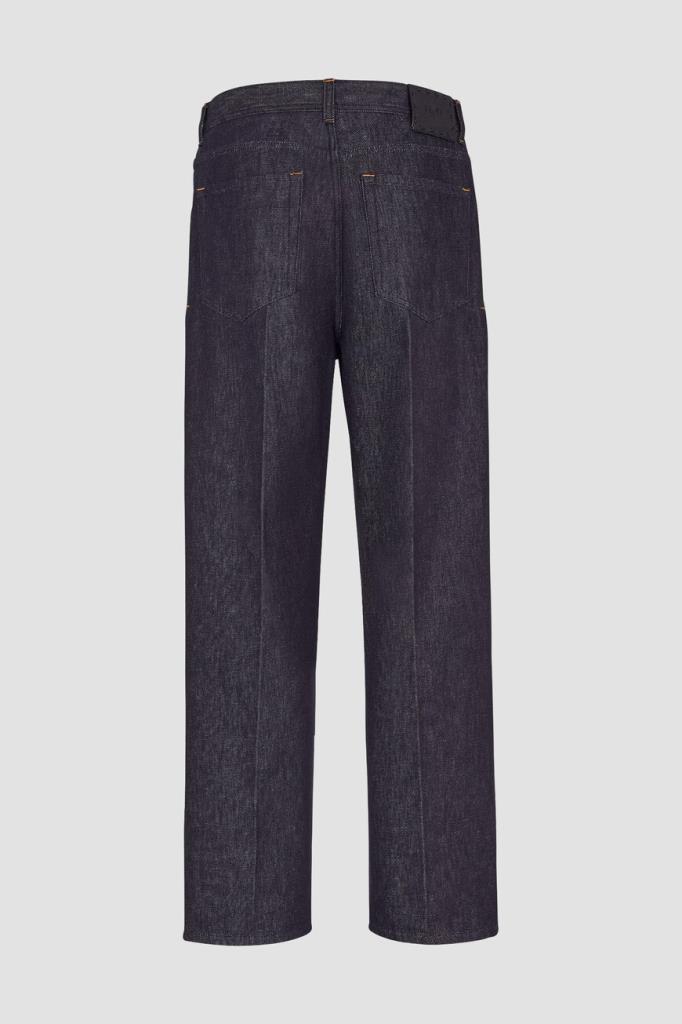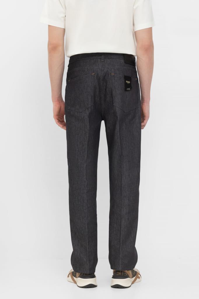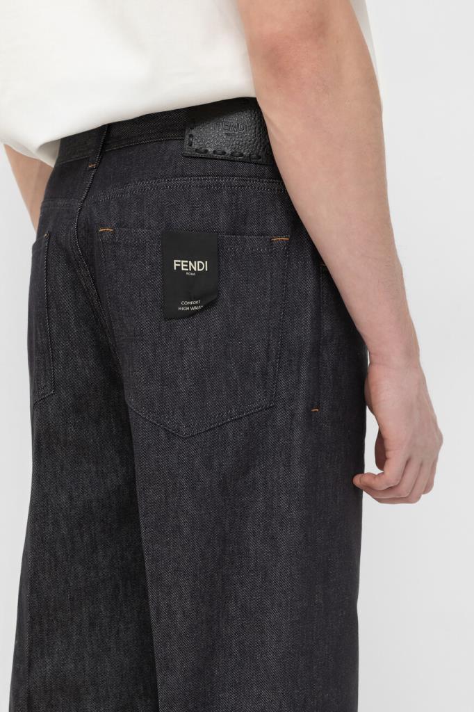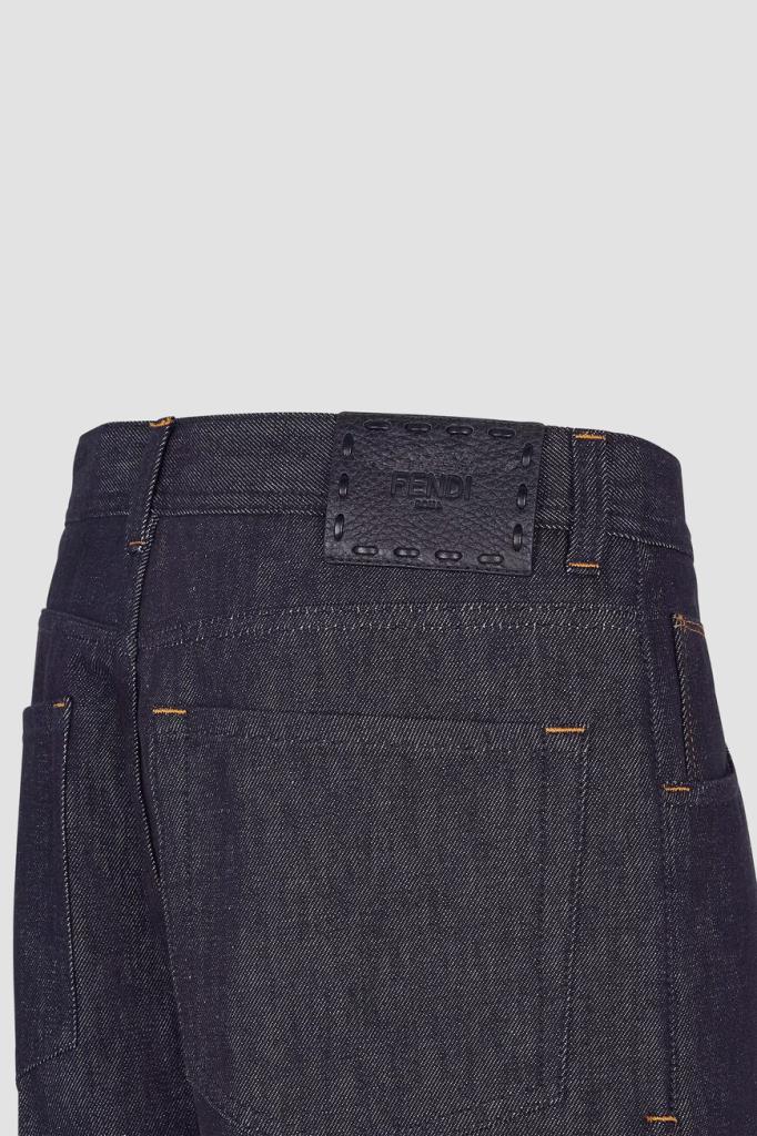 Тёмно-синие брюки Fendi с пятью карманами. Изделие сшито из мягкого хлопкового денима с классическими стрелками и застёжкой на потайную молнию и брендированную матовую пуговицу с планкой. Декором выступают оранжевые прострочка на маленьком кармане спереди, петля и швы на шлевках и чёрная кожаная накладка с рельефной текстурой, логотипом «Fendi Roma» и рельефной строчкой-швом Selleria на поясе сзади.