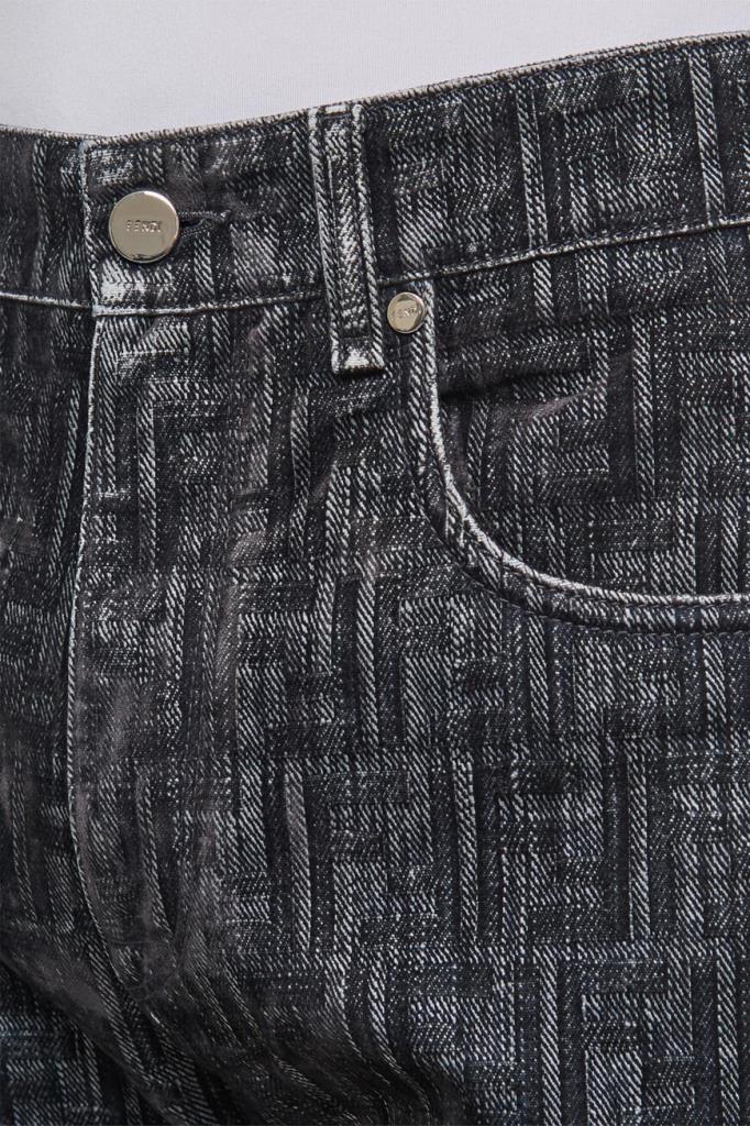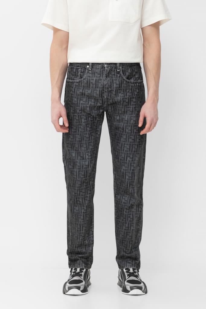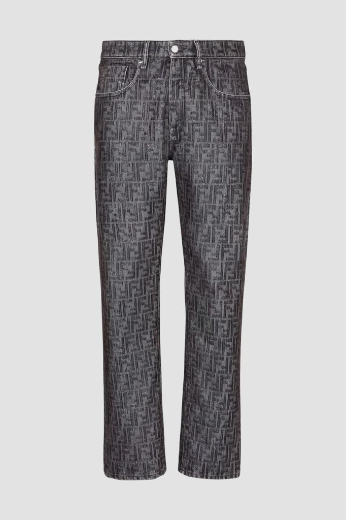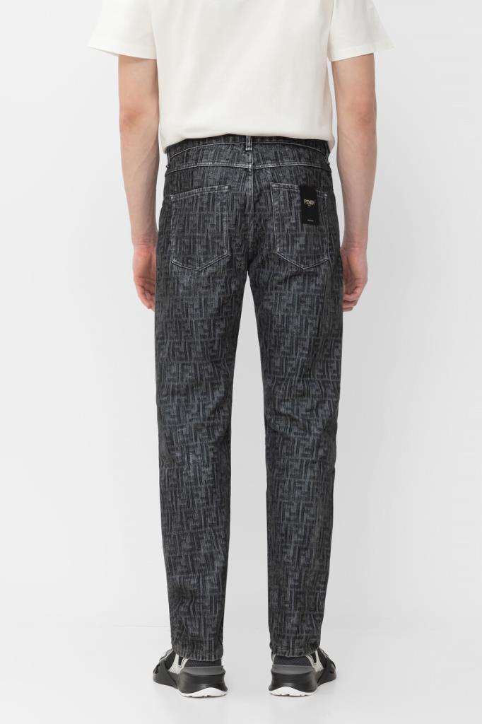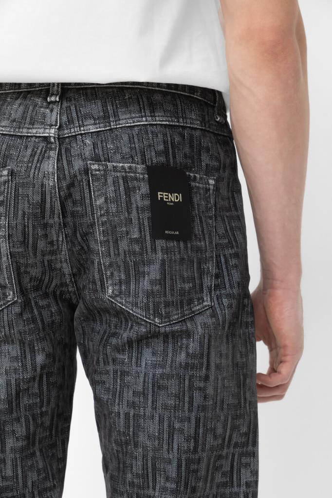 Джинсы прямого силуэта от бренда Fendi. Для создания изделия в серых тонах используется мягкий деним на основе хлопка и полиэстера. Немнущийся плотный материал хорошо пропускает воздух, а выверенный крой не сковывает движения. Поверхность модели покрыта крупным геометрическим мотивом «FF» тёмно-серого цвета на сером фоне. Фасон джинсов с дизайнерскими потёртостями предполагает наличие пяти карманов и застёжку на потайную молнию и брендированную металлическую пуговицу.