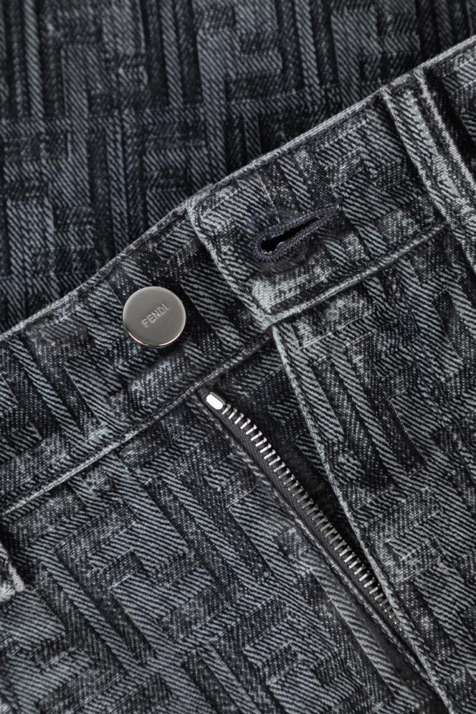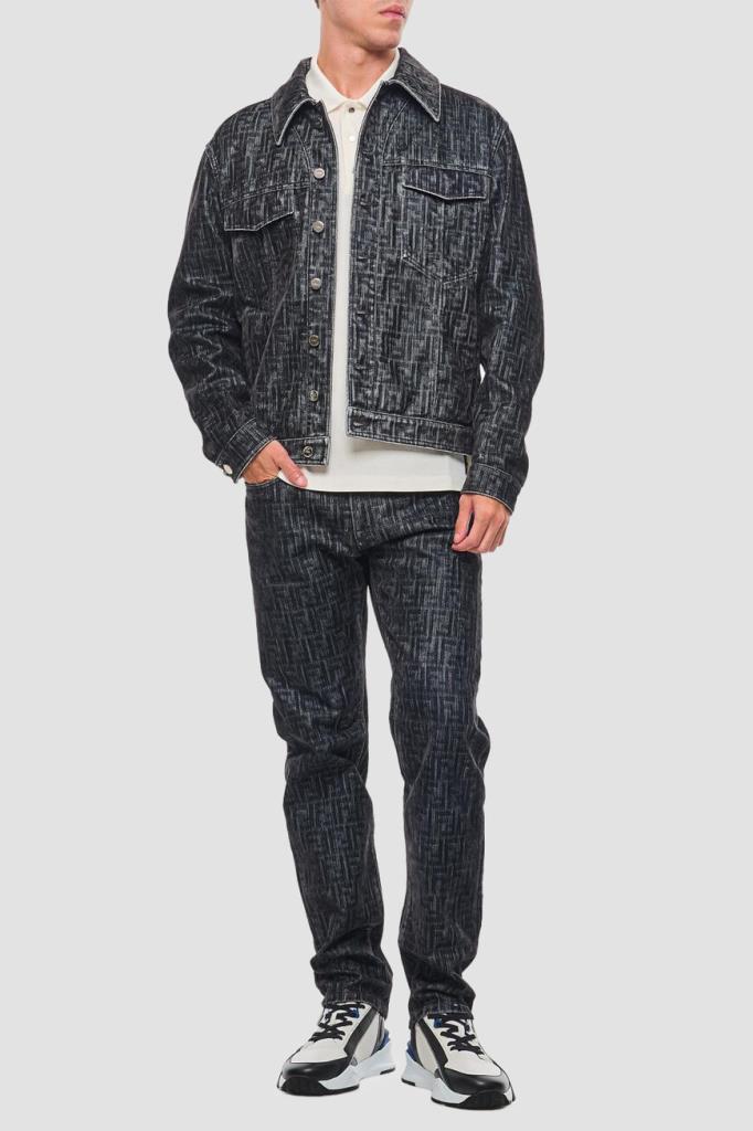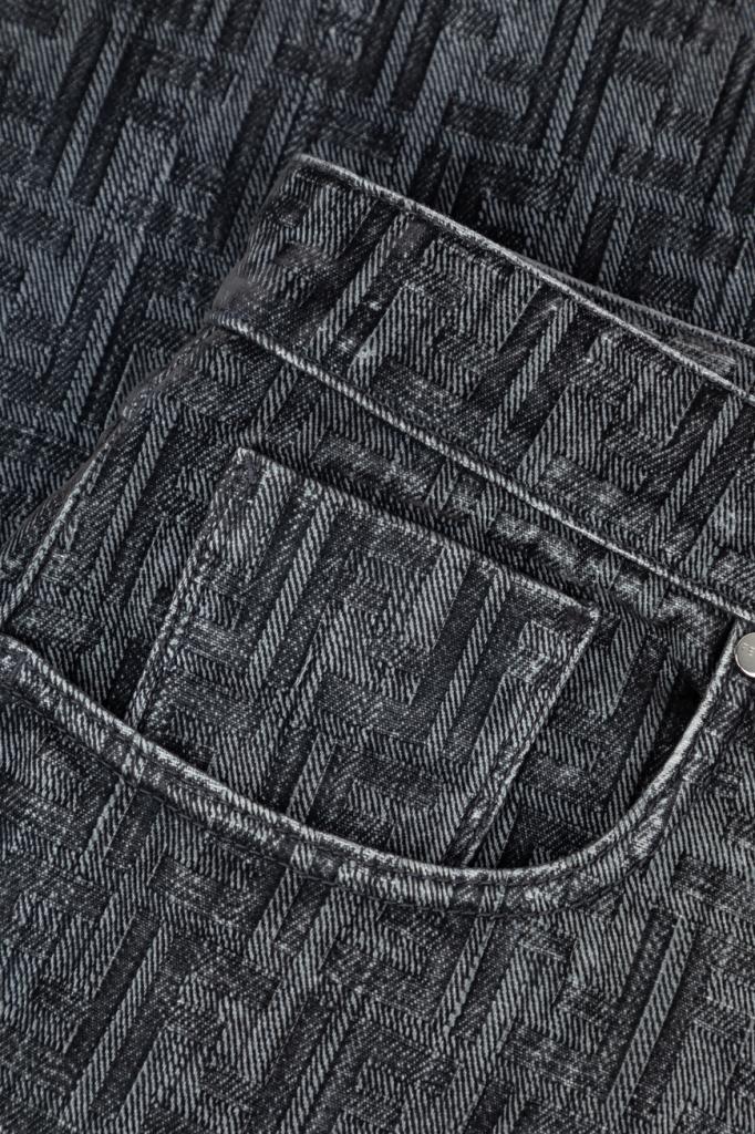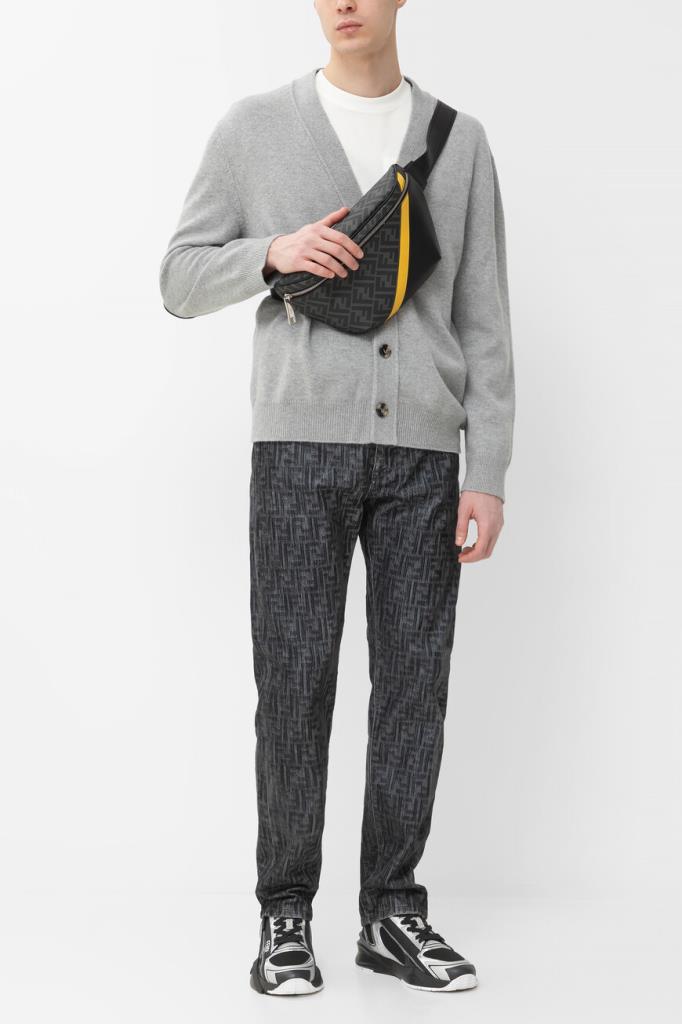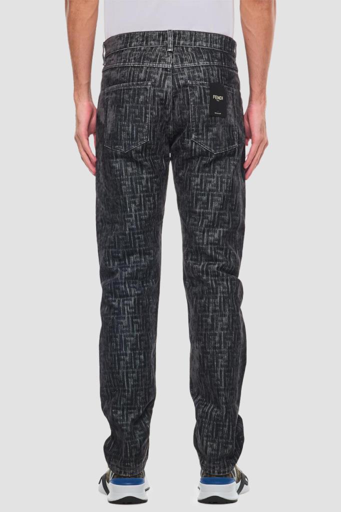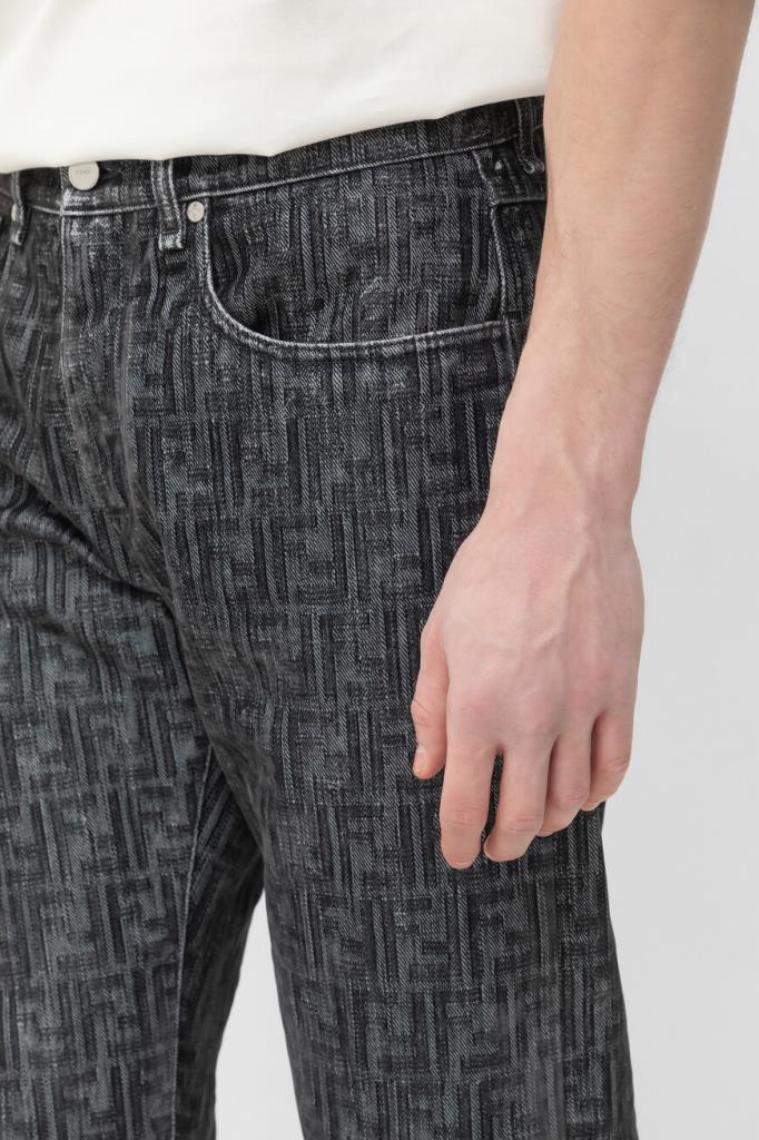 Джинсы прямого силуэта от бренда Fendi. Для создания изделия в серых тонах используется мягкий деним на основе хлопка и полиэстера. Немнущийся плотный материал хорошо пропускает воздух, а выверенный крой не сковывает движения. Поверхность модели покрыта крупным геометрическим мотивом «FF» тёмно-серого цвета на сером фоне. Фасон джинсов с дизайнерскими потёртостями предполагает наличие пяти карманов и застёжку на потайную молнию и брендированную металлическую пуговицу.