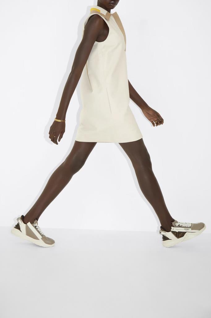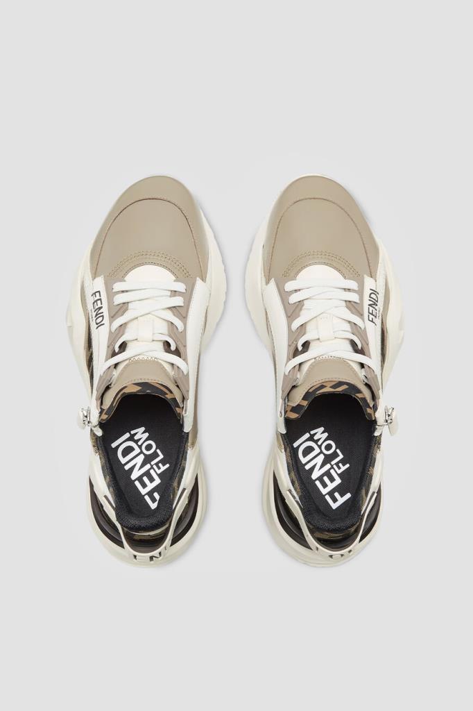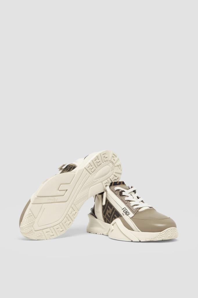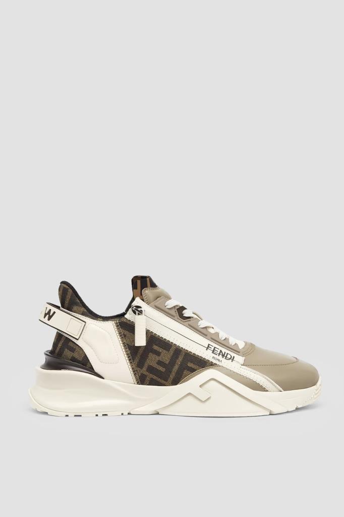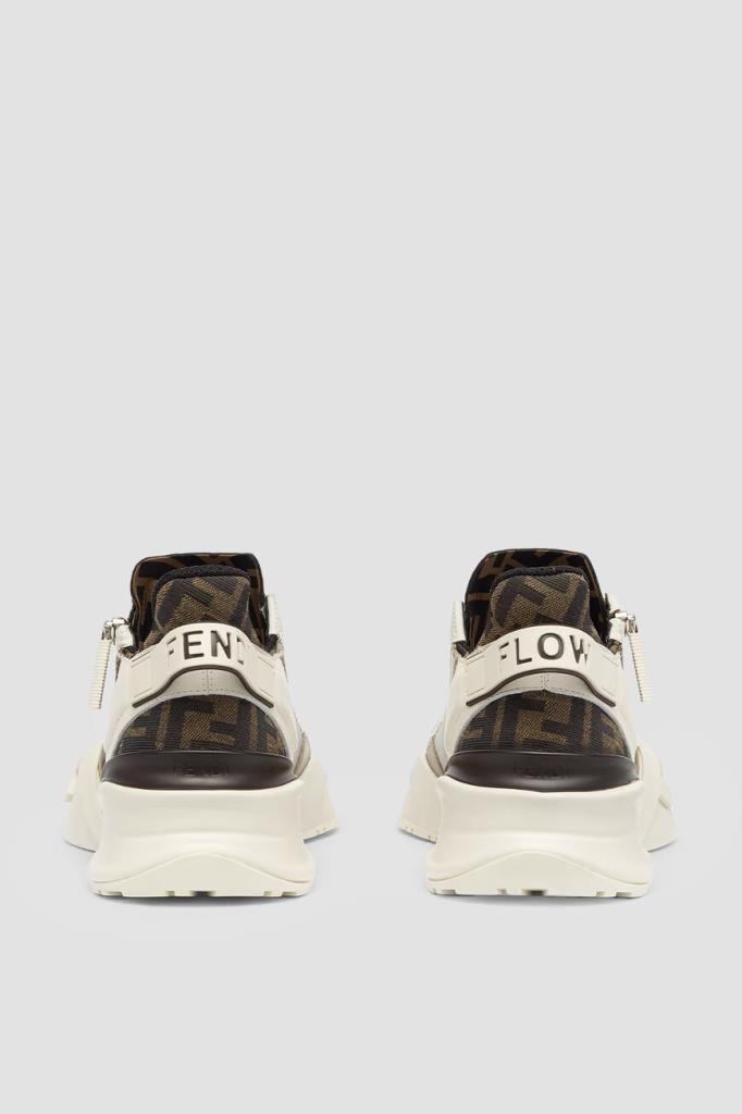 Комбинированные сникеры-слипоны Flow с культовой символикой бренда Fendi. Модель изготовлена из гладкой телячьей кожи и прочной ткани LYCRA® на основе хлопка и нейлона в бежево-коричневой гамме. Поверхность тканевой части пары украшает графичный паттерн Zucca, сбоку на прорезиненной молнии присутствует надпись «Fendi Roma», а задник декорирован ремешками с логотипом и названием модели.