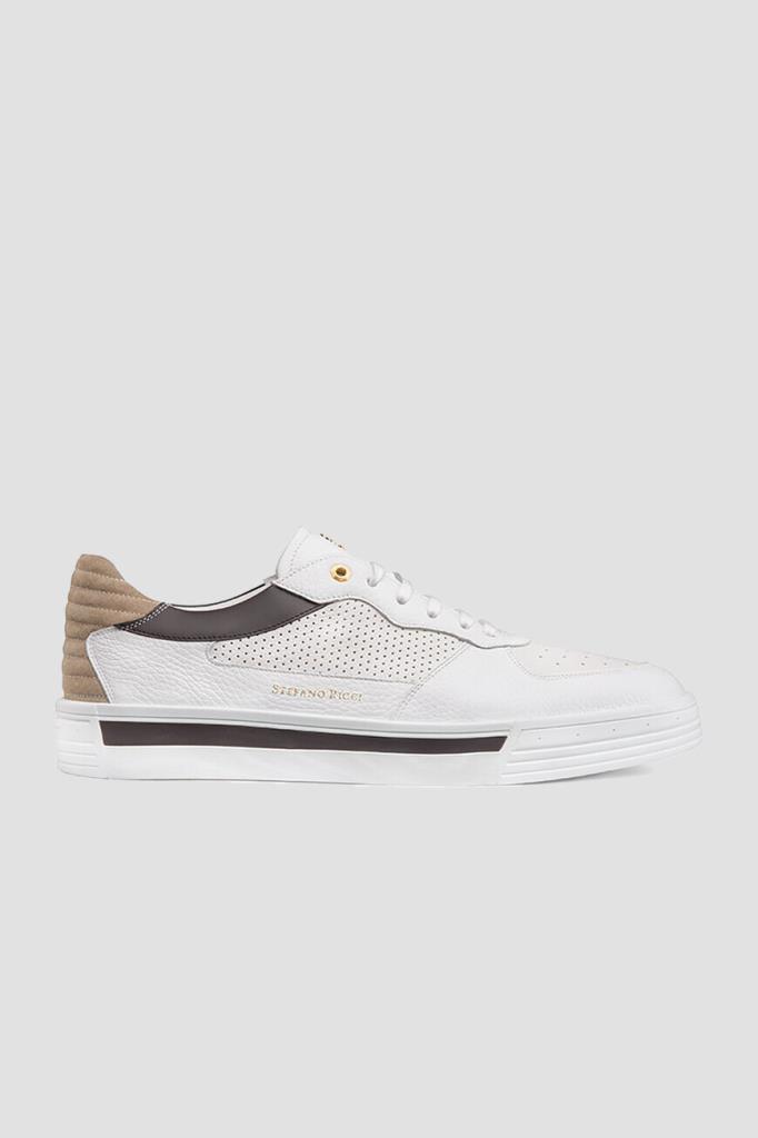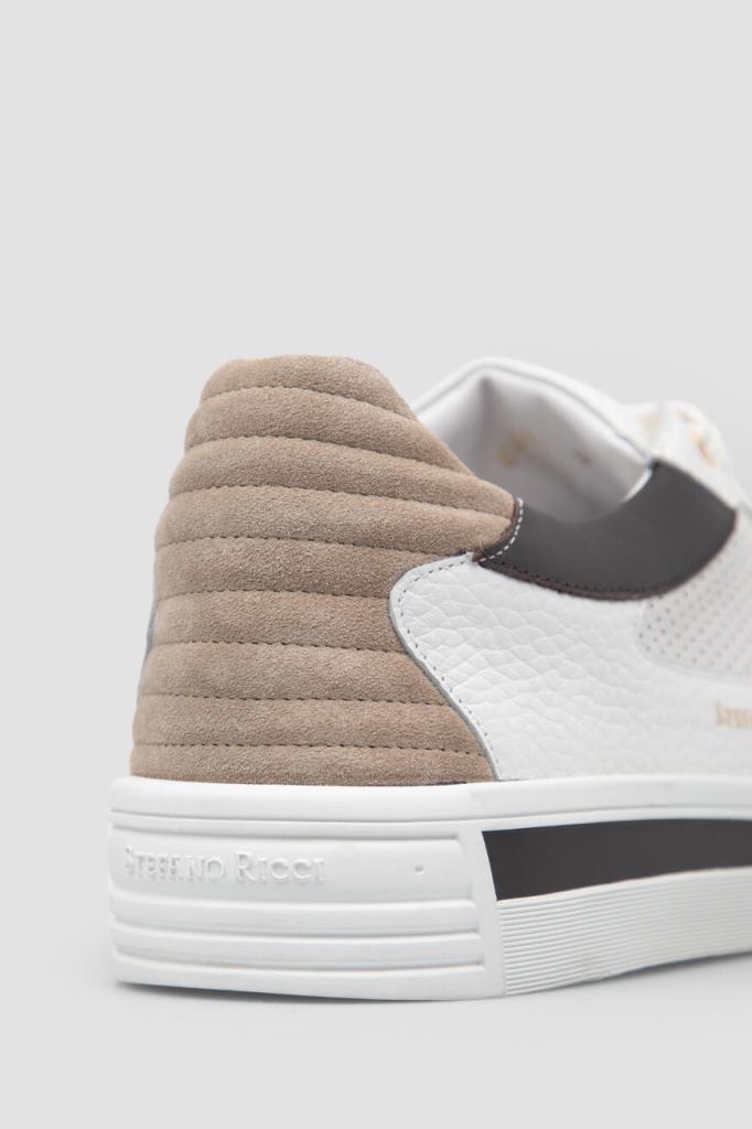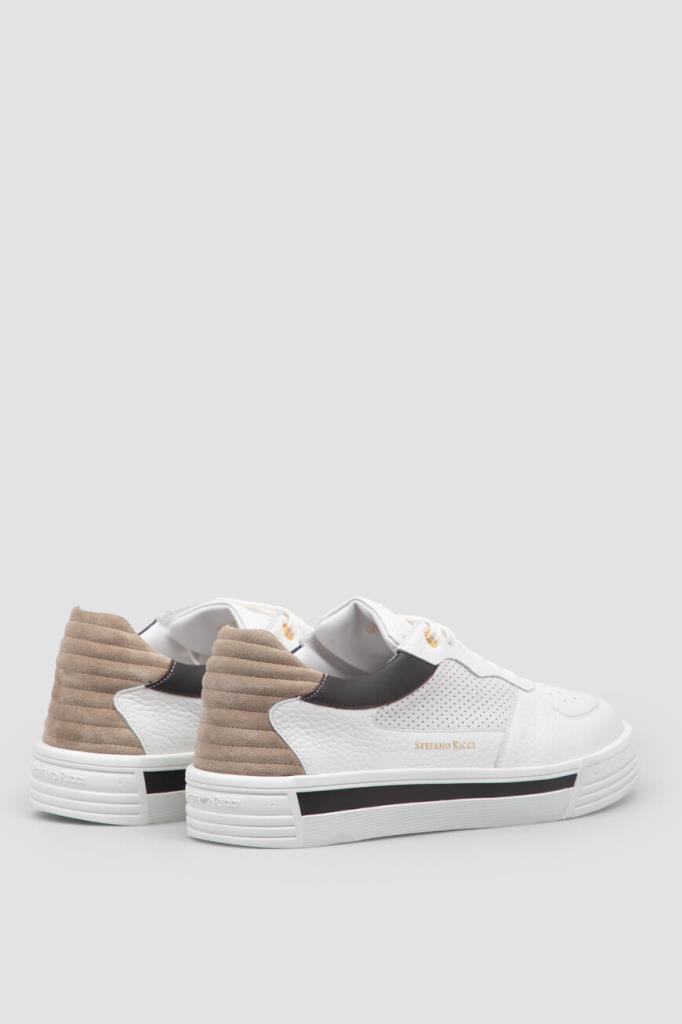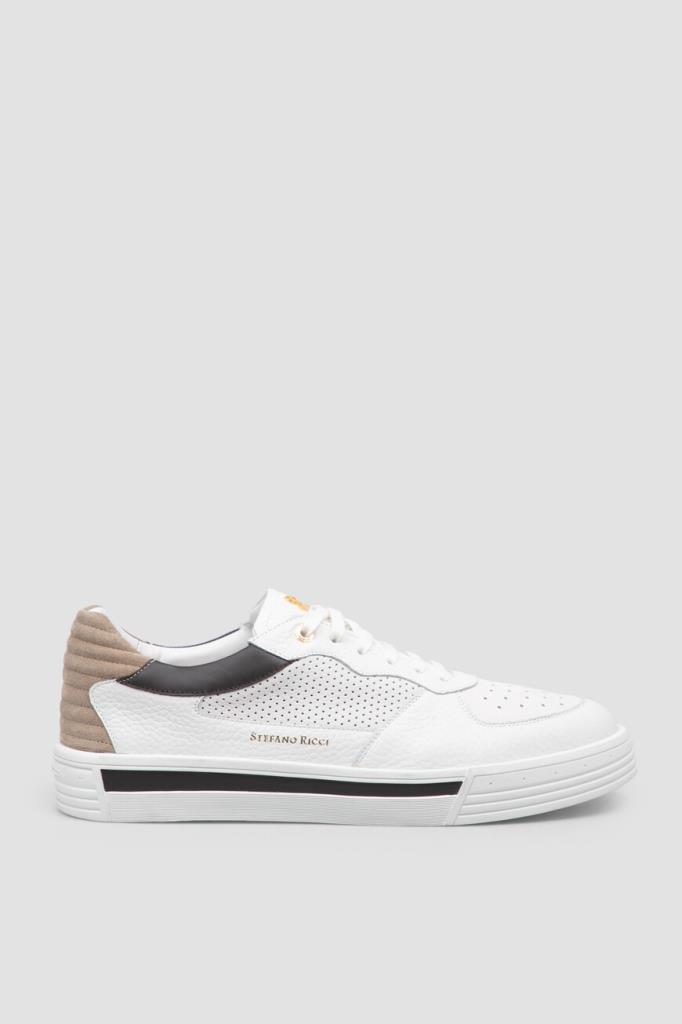 Комбинированные сникеры с широкой колодкой от Stefano Ricci. Для создания повседневной модели с закрытой шнуровкой используются перфорированная и зернистая телячья кожа белого цвета со вставками из гладкой контрастной кожи по бокам и бархатистой стёганой замши бежевого оттенка на заднике. О принадлежности изделия бренду напоминают крупный лого-монограмма из металла золотого оттенка на язычке и надпись-логотип на боковинах.