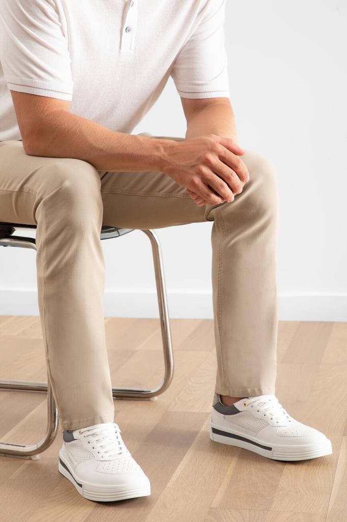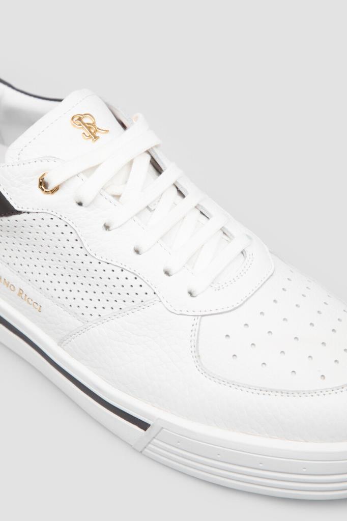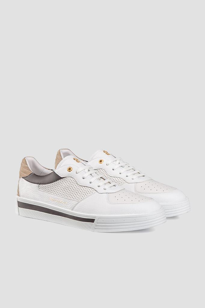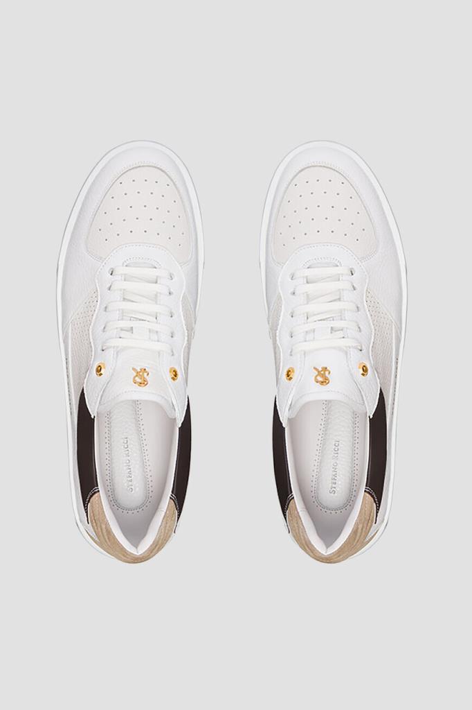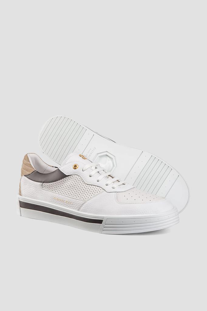 Комбинированные сникеры с широкой колодкой от Stefano Ricci. Для создания повседневной модели с закрытой шнуровкой используются перфорированная и зернистая телячья кожа белого цвета со вставками из гладкой контрастной кожи по бокам и бархатистой стёганой замши бежевого оттенка на заднике. О принадлежности изделия бренду напоминают крупный лого-монограмма из металла золотого оттенка на язычке и надпись-логотип на боковинах.