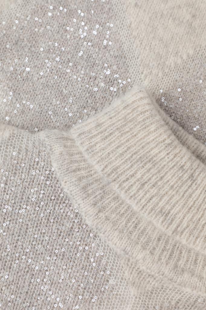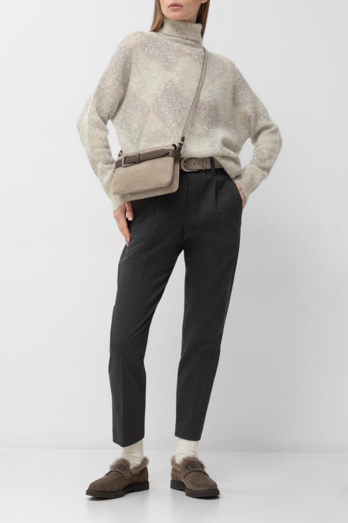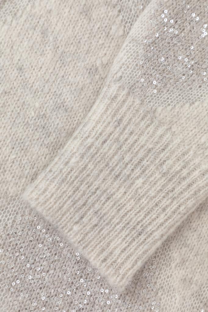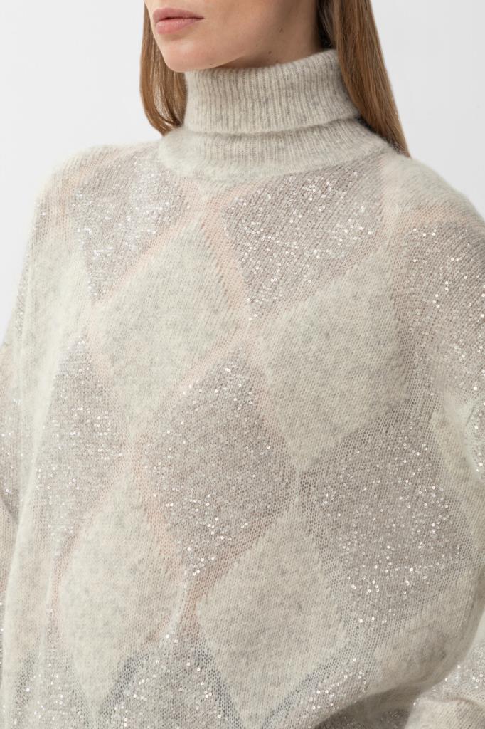 Жемчужно-серый свитер Dazzling Argyle от BRUNELLO CUCINELLI. Для создания вязаной модели выбрана мягкая пряжа на основе шерсти и мохера. Изделие из такого материала станет идеальным выбором для холодного сезона. Изящный блеск пайеток и чулочная вязка чередуются между собой, образуя нежный геометрический мотив в виде ромбов. Свитер отличается прямым силуэтом и длинными рукавами с приспущенным плечом. Модель составит образ в светлых тонах и подружится с вещами в контрастных оттенках.