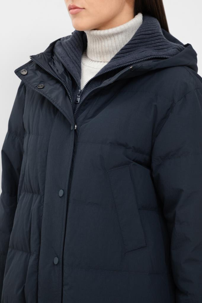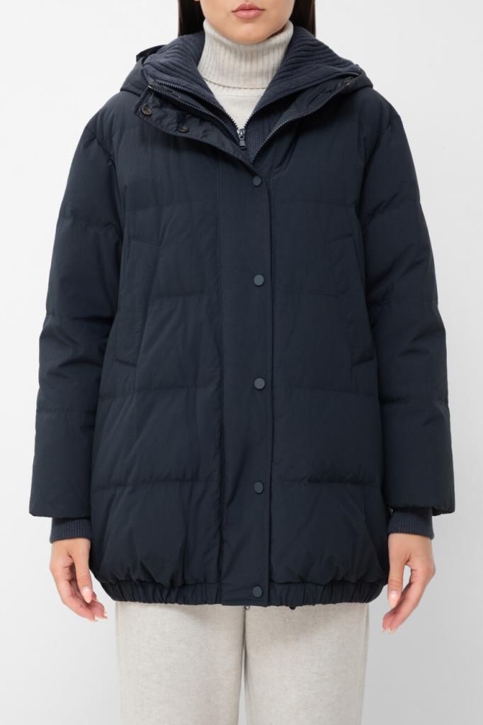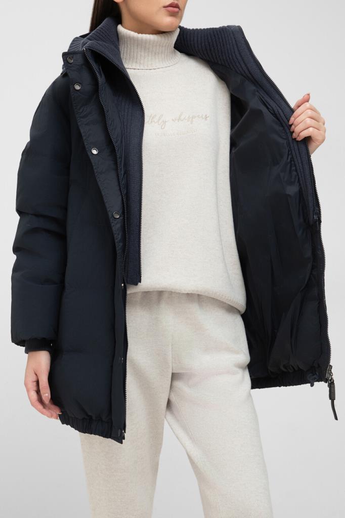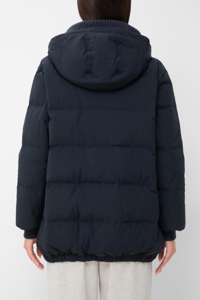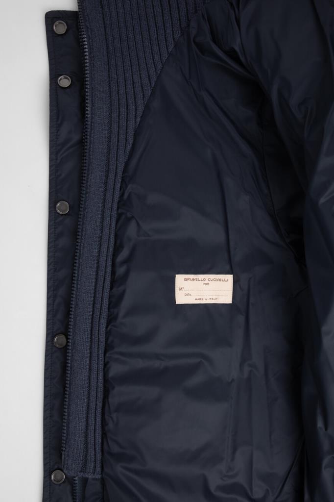 Куртка BRUNELLO CUCINELLI с утеплённой вязаной вставкой. Изделие выполнено из высокотехнологичного полотна на основе хлопка и прочного нейлона тёмно-синего цвета и оснащено застёжкой на потайную молнию и клёпки с планкой. Отделка позволяет защитить ткань от минимального контакта с водой. Дополнительный комфорт и защиту от непогоды обеспечивают глубокий капюшон, трикотажные манжеты-резинки и кулиска по нижнему краю. Утеплитель на основе натурального гусиного пуха и пера также гарантирует уют и тепло.