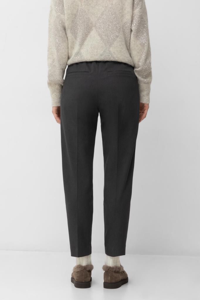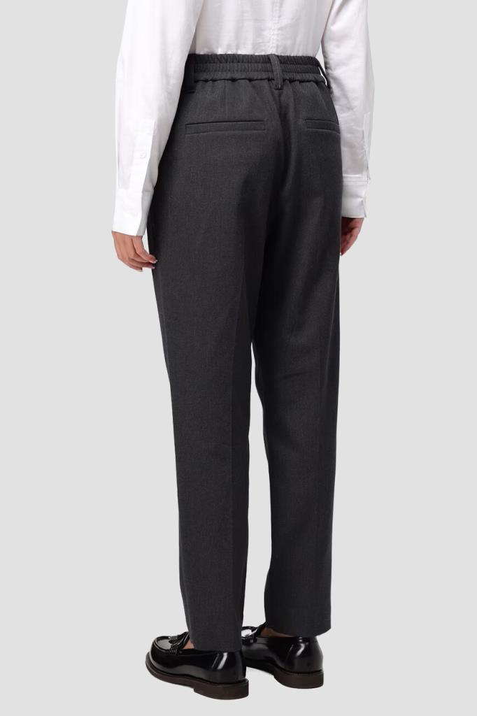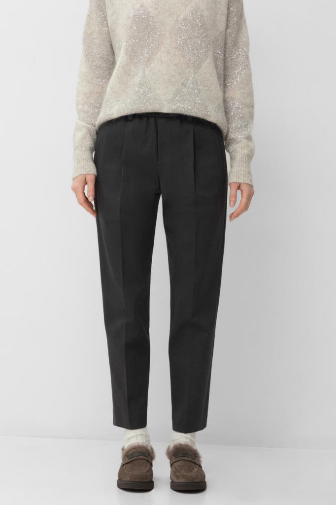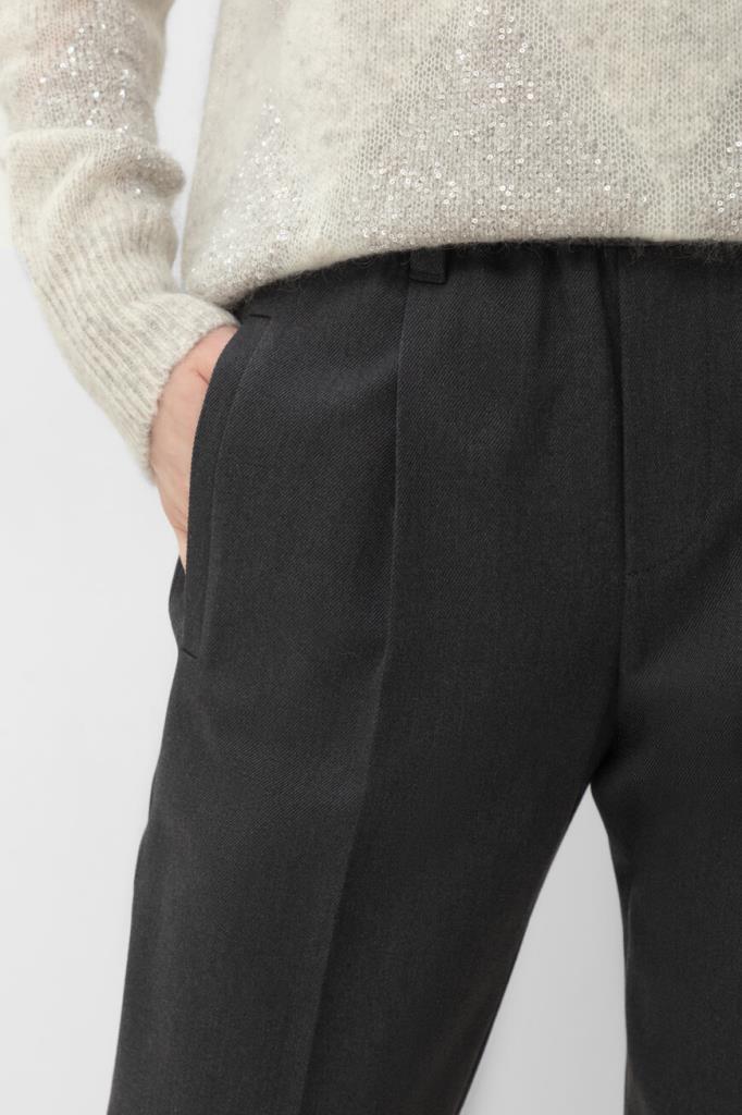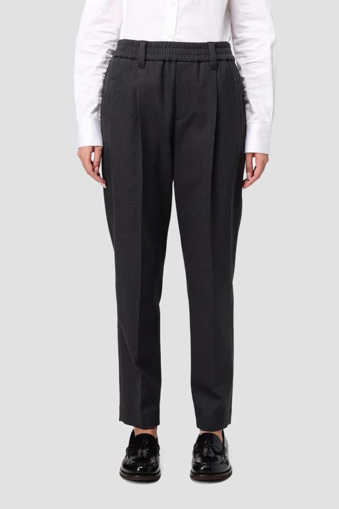 Тёмно-серые брюки BRUNELLO CUCINELLI из мягкого хлопка стрейч. Фасон изделия предполагает свободный крой сверху и зауженный книзу, американские карманы по бокам и прорезные - сзади. Безукоризненную и вместе с тем непринуждённую посадку обеспечивают классические стрелки с защипами сверху и широкий эластичный пояс-резинка.