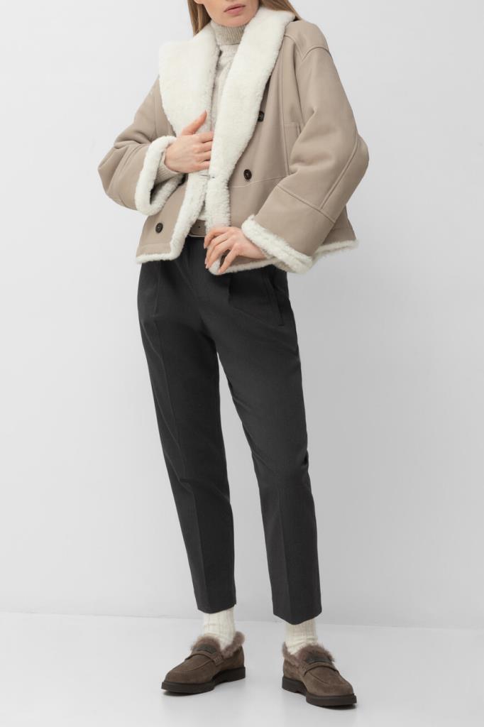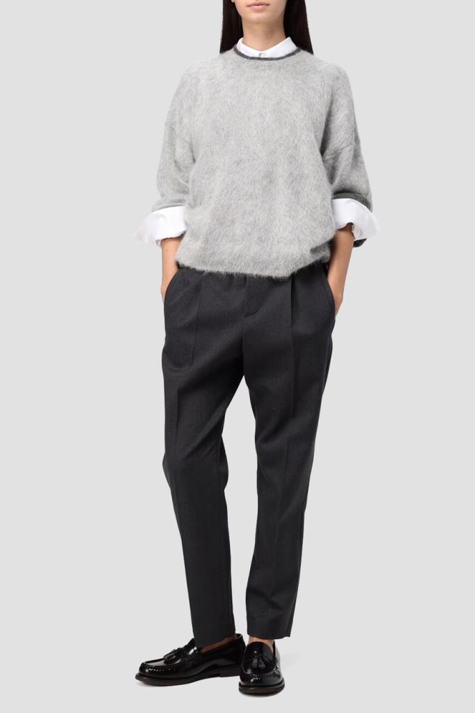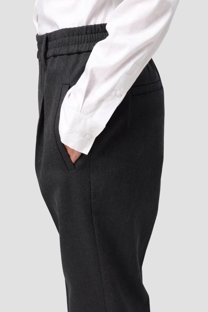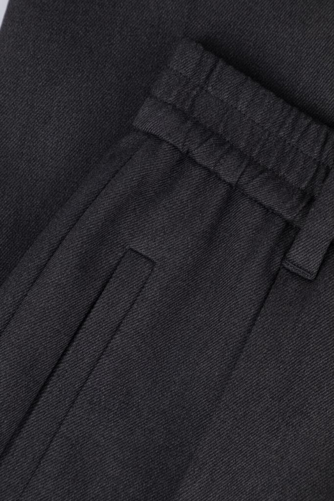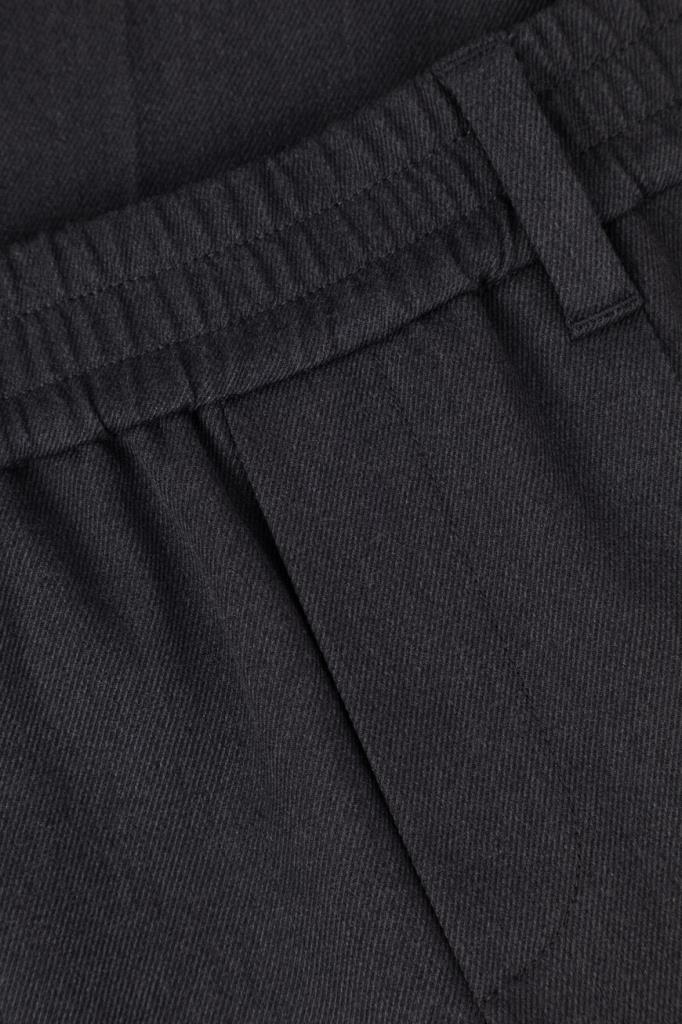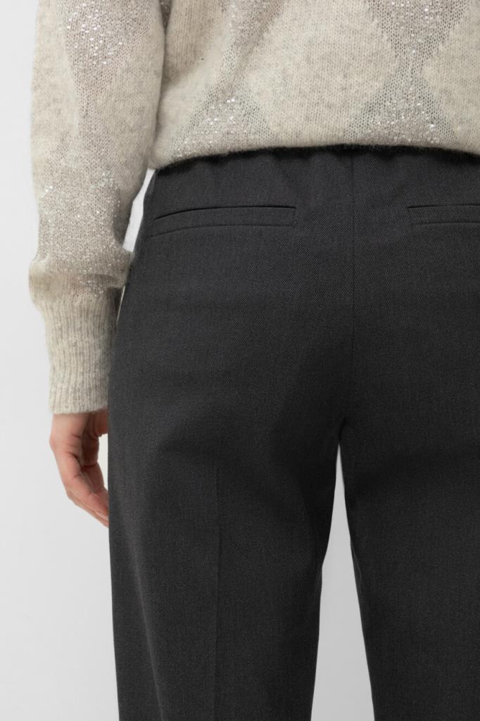 Тёмно-серые брюки BRUNELLO CUCINELLI из мягкого хлопка стрейч. Фасон изделия предполагает свободный крой сверху и зауженный книзу, американские карманы по бокам и прорезные - сзади. Безукоризненную и вместе с тем непринуждённую посадку обеспечивают классические стрелки с защипами сверху и широкий эластичный пояс-резинка.