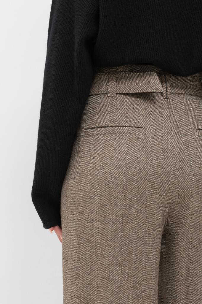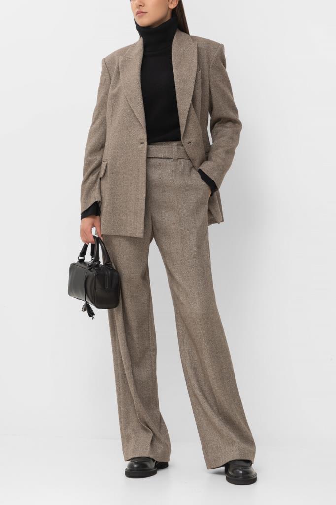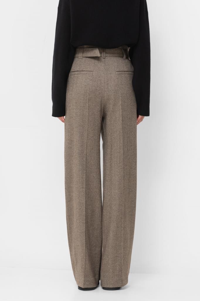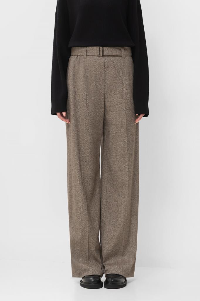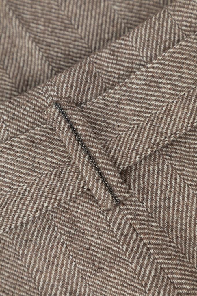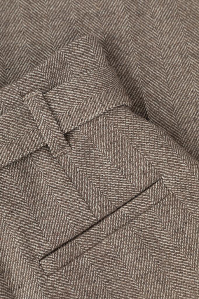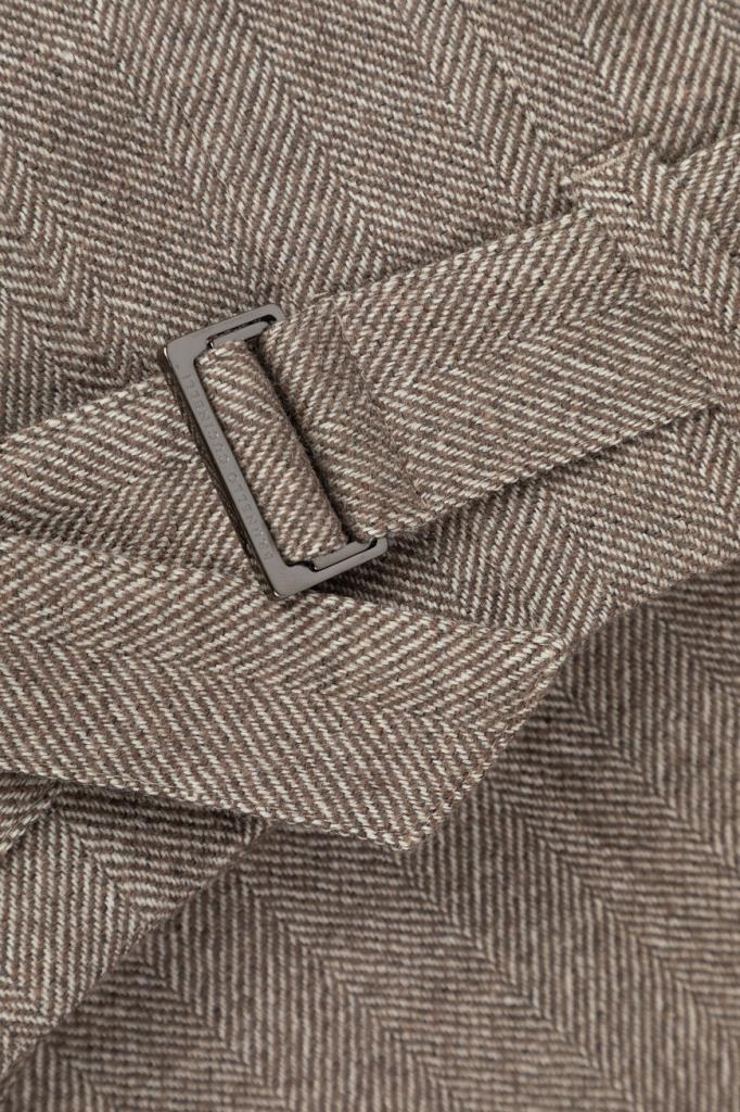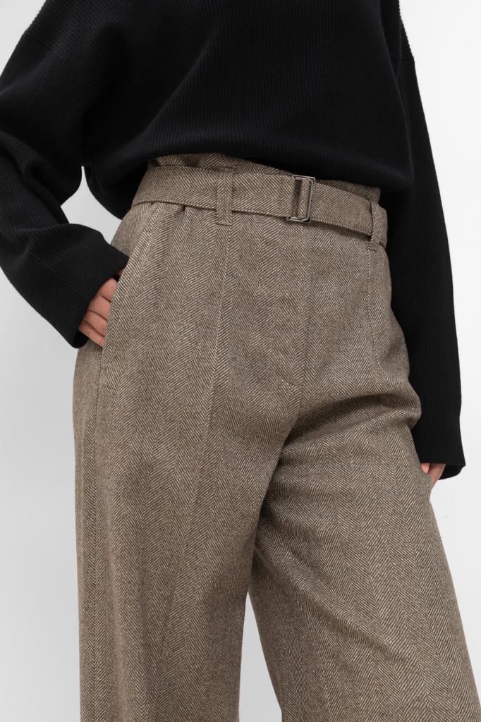 Брюки Corset Loose от BRUNELLO CUCINELLI с геометрическим мотивом в «ёлочку». Изделие выполнено в коричневых тонах из эластичного трикотажа на основе высокотехнологичной чесаной шерсти и прочного нейлона. Модель просторного кроя отличается классическими стрелками и четырьмя прорезными карманами. Регулируемый пояс-ремень из такой же ткани продет в шлёвки и оснащён брендированной прямоугольной пряжкой. Брюки высокой посадки станут основой образов в холодный сезон.