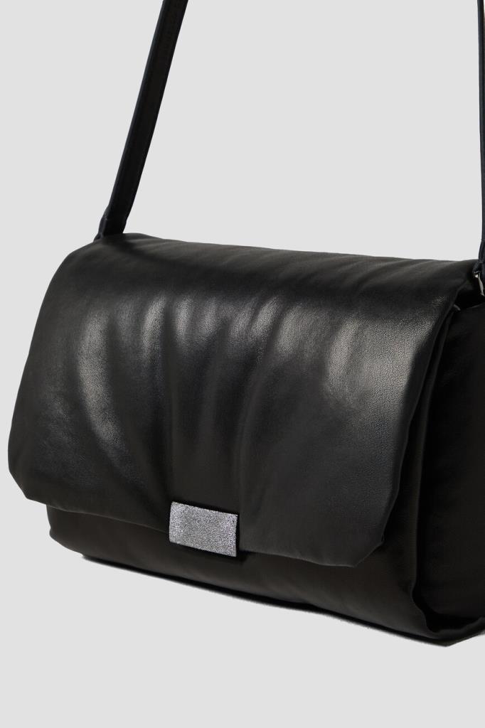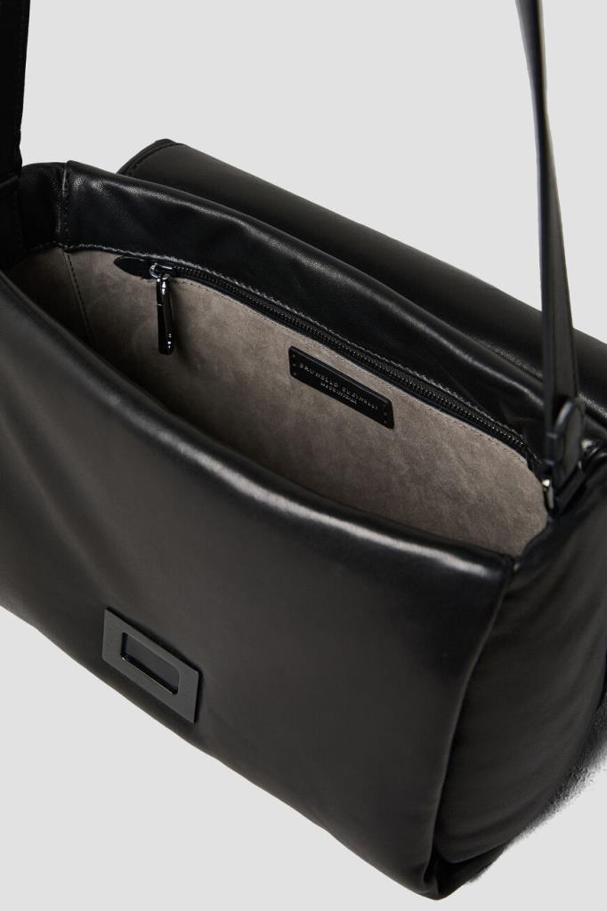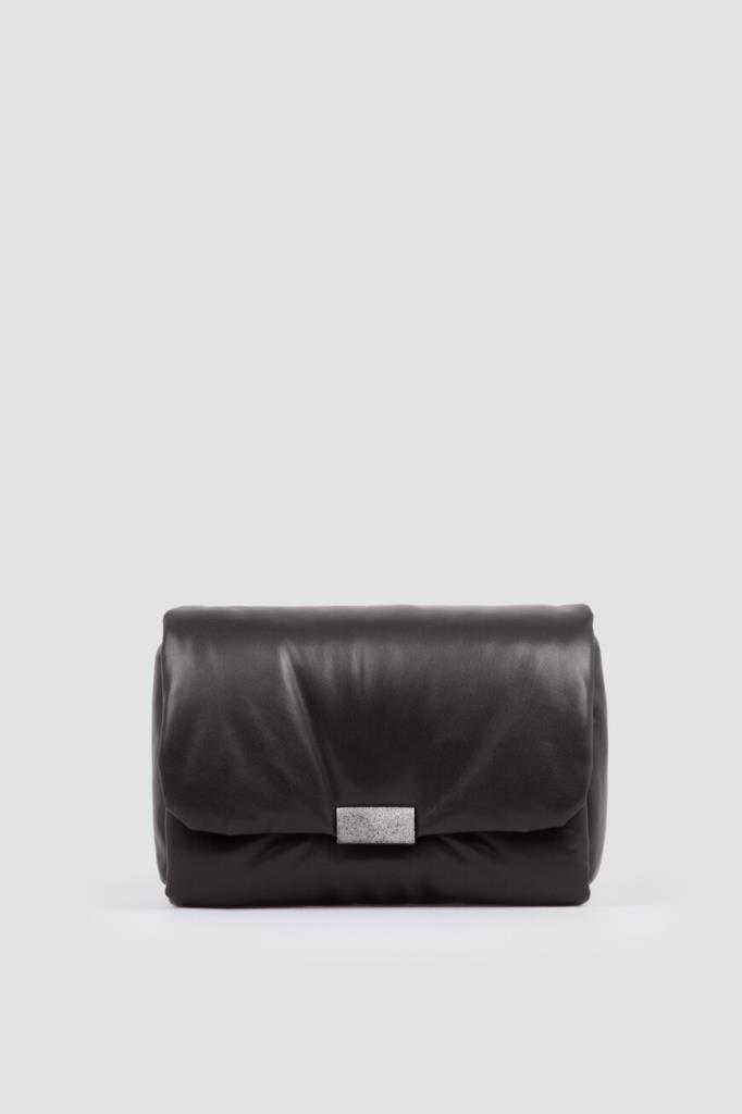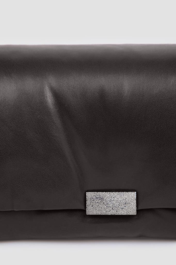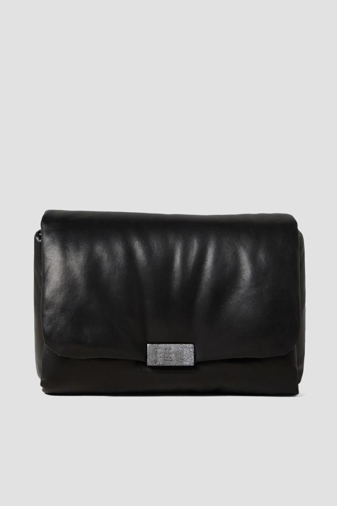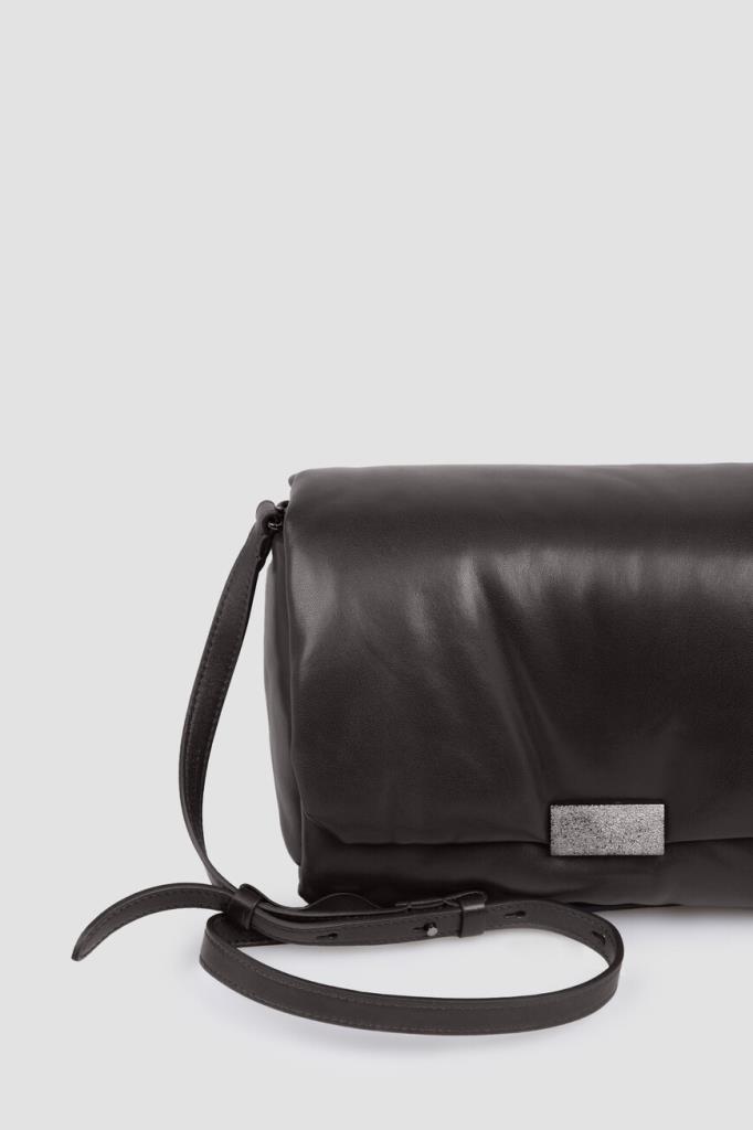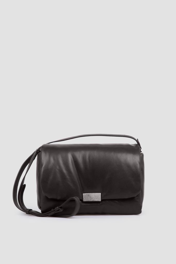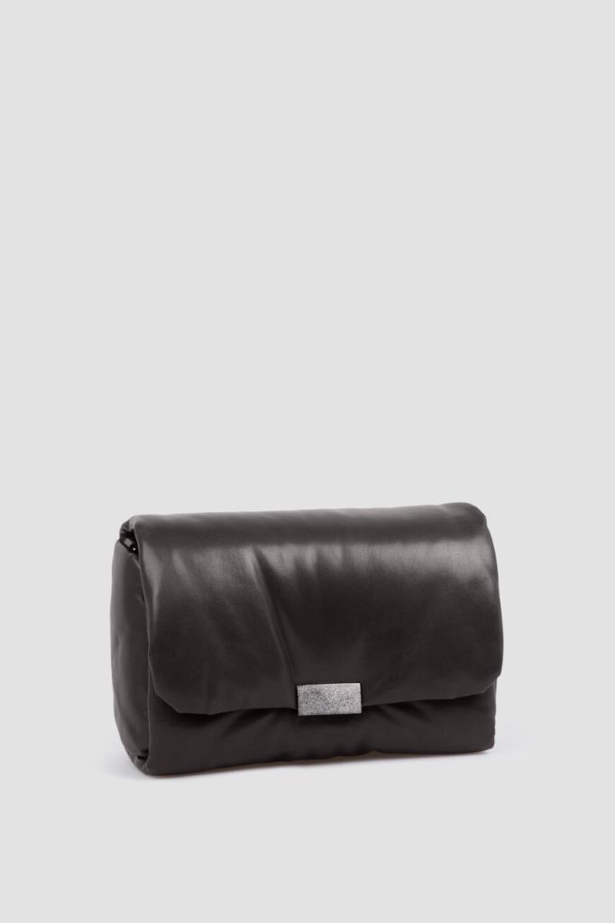 Сумка Brunello Cucinelli с культовым сияющим декором. Для создания практичного аксессуара используется мягкая кожа наппа. Изделие чёрного базового цвета удобно носить в руке как клатч, на плече или через плечо благодаря наличию регулируемого плечевого ремня. Откидной клапан на потайной магнитной застёжке, обработанной по технологии зеркальной полировки, украшает вставка из серебристой цепочки Мониль.