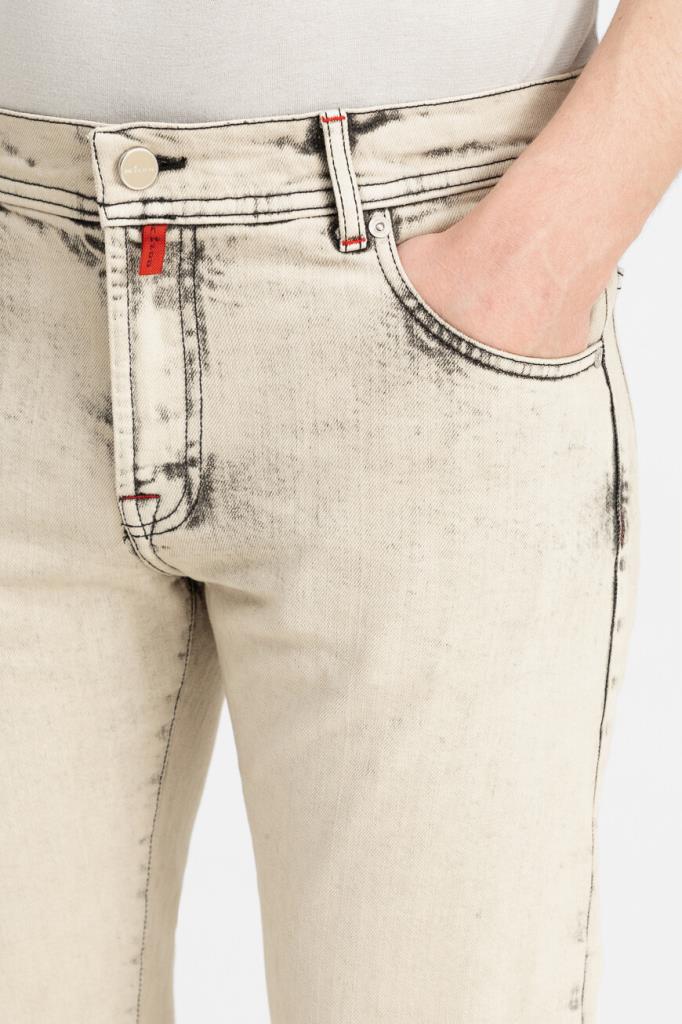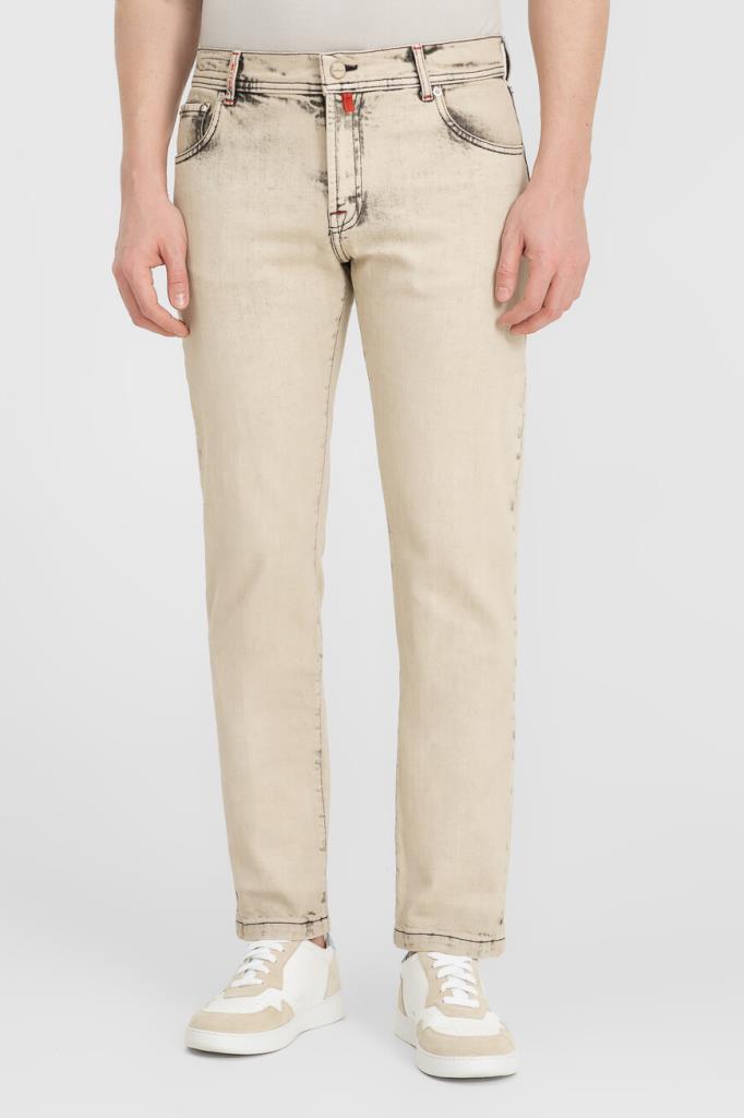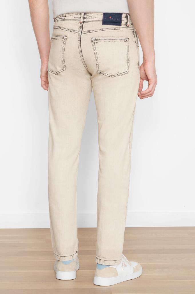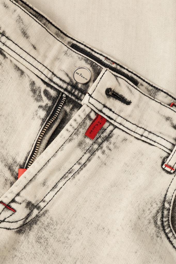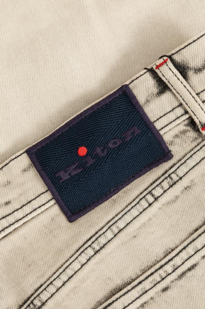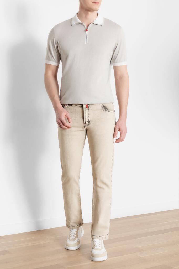 Оригинальные джинсы Kiton изысканного бежевого оттенка. Стильная модель прямого кроя выполнена из эластичного хлопкового денима с эффектными дизайнерскими потёртостями. Декор: тёмно-синяя текстильная накладка с фирменным логотипом на поясе сзади.