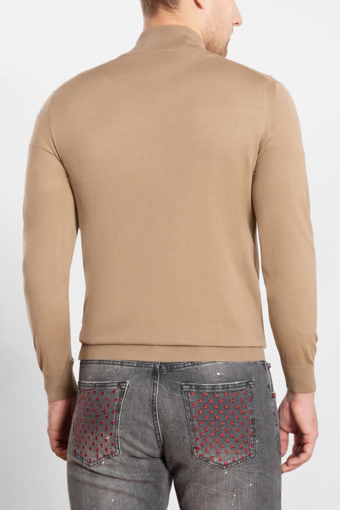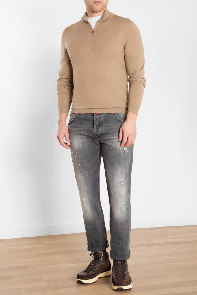Свитер Kiton выполнен из мягкой натуральной шерсти чулочной вязкой. Модель с высоком воротником-стойкой на молнии окрашена в светло-коричневый оттенок и гармонично сочетается с прямыми джинсами с эффектом делаве и дизайнерскими разрывами и комбинированными ботинками того же бренда.