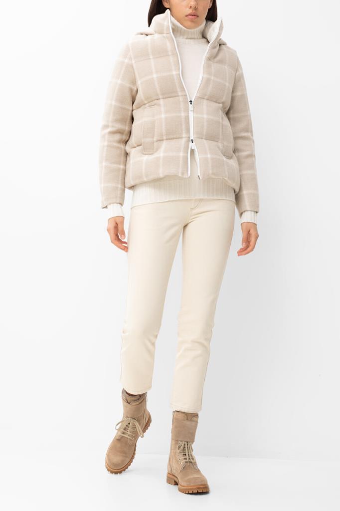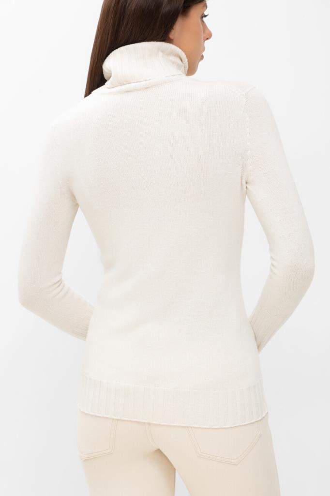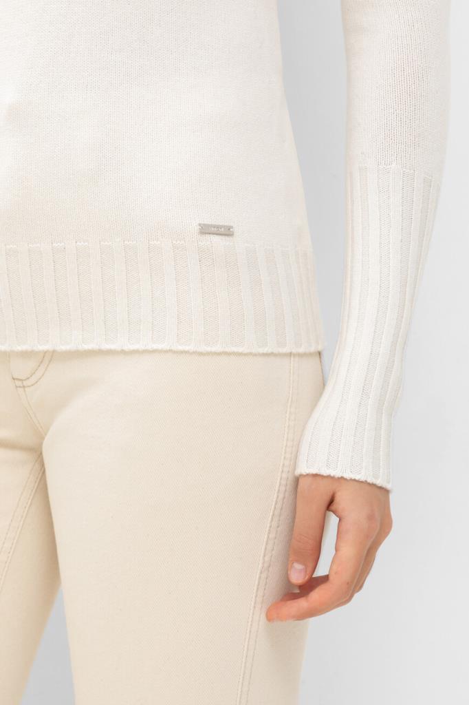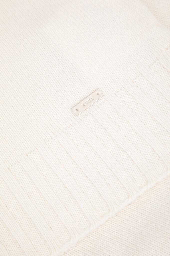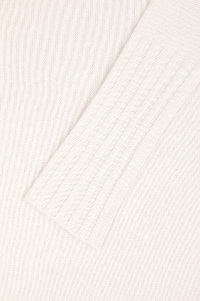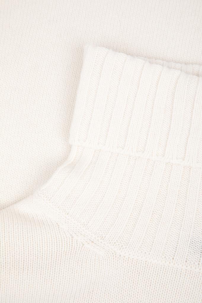 Свитер белого цвета от бренда Kiton. Для создания модели чулочной вязки выбран мягкий кашемир. На принадлежность изделия бренду указывает прямоугольный лейбл из серебристого металла спереди.
