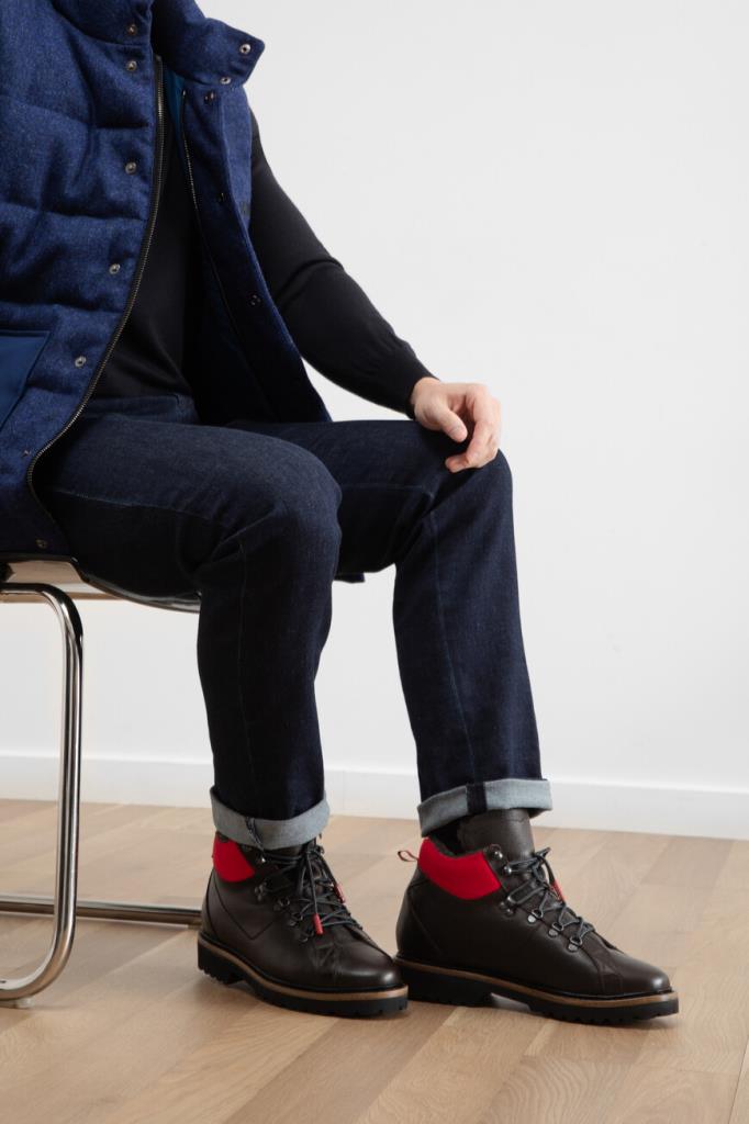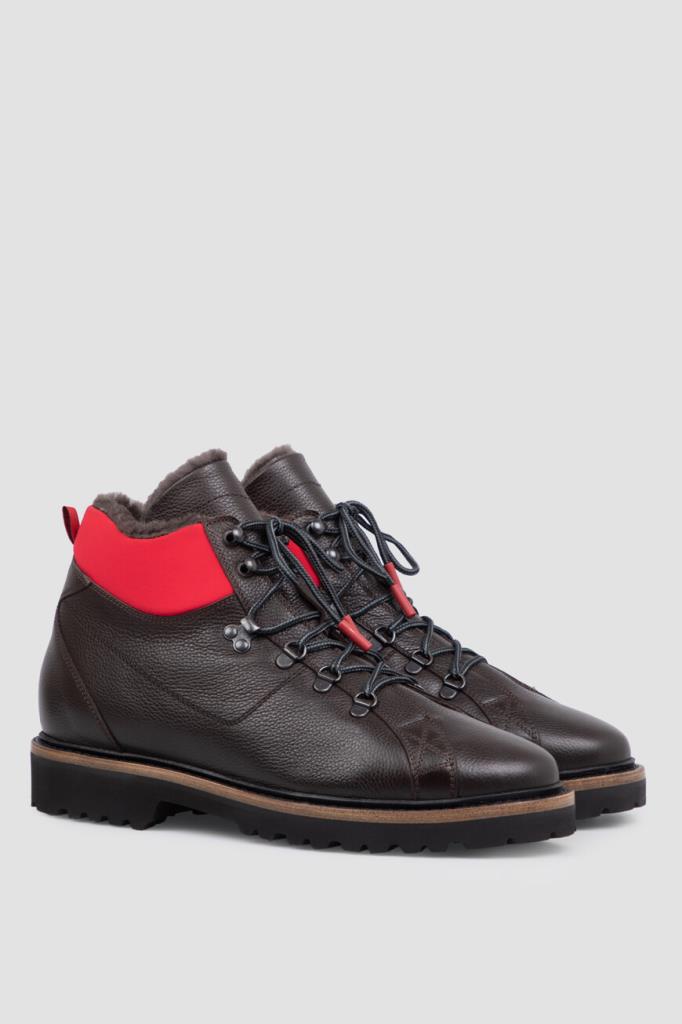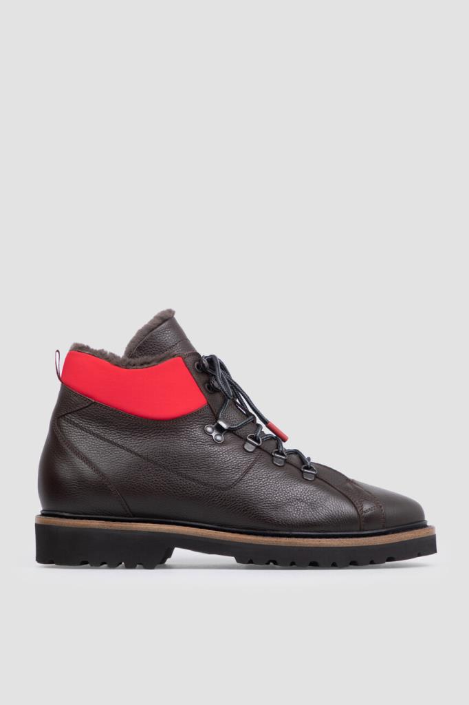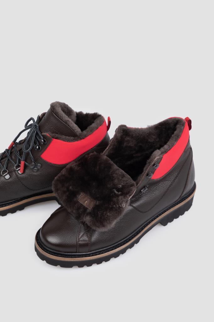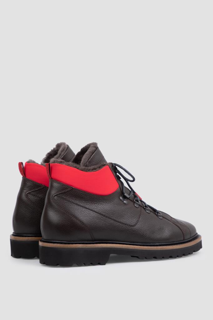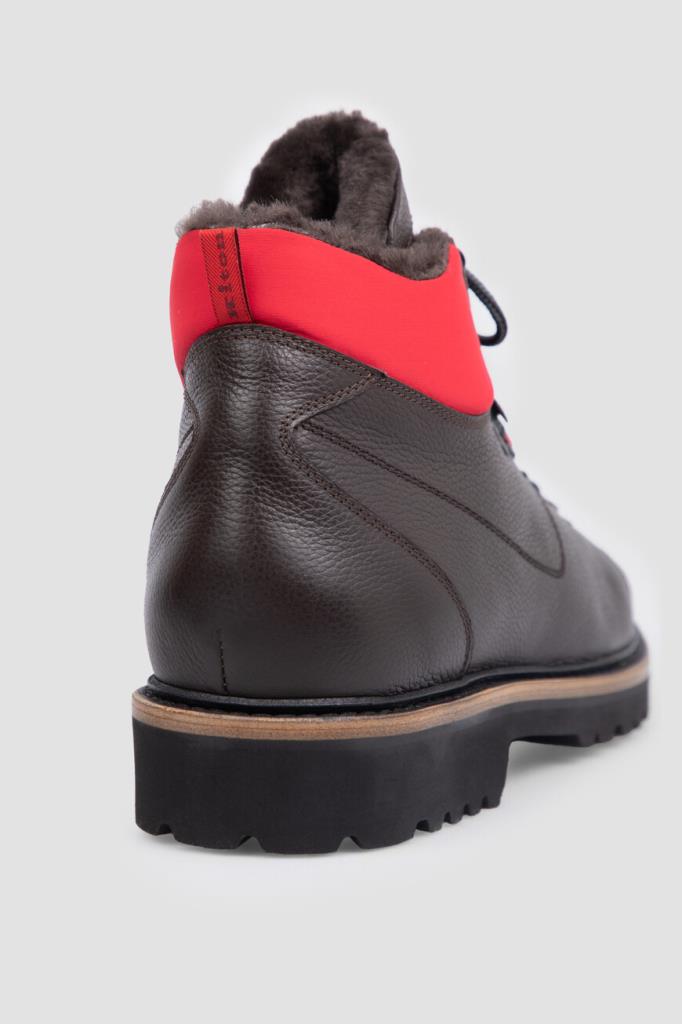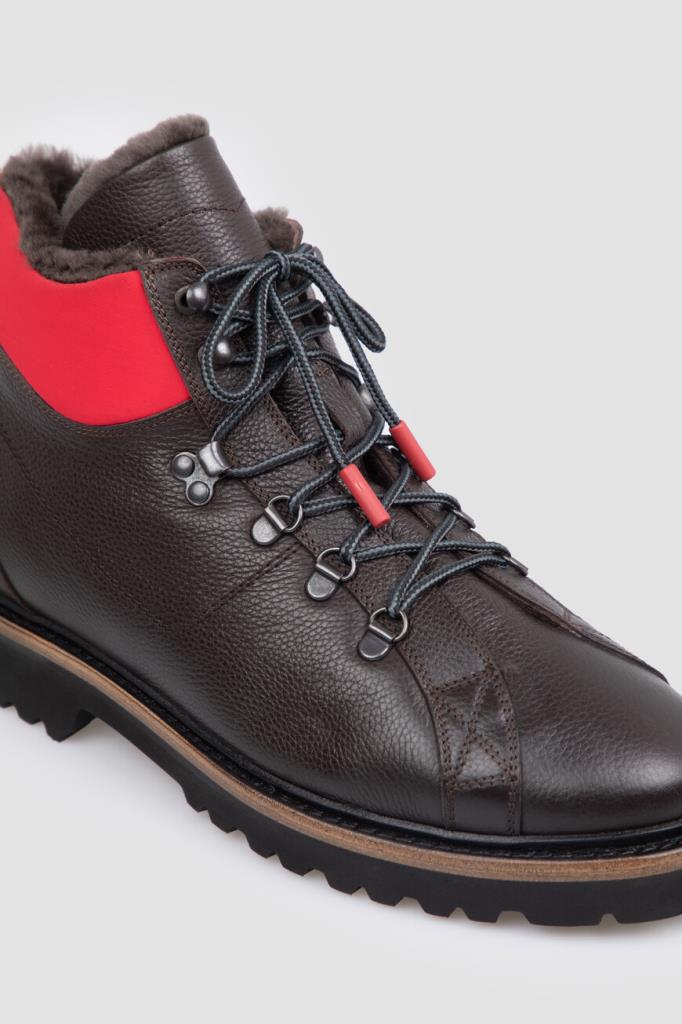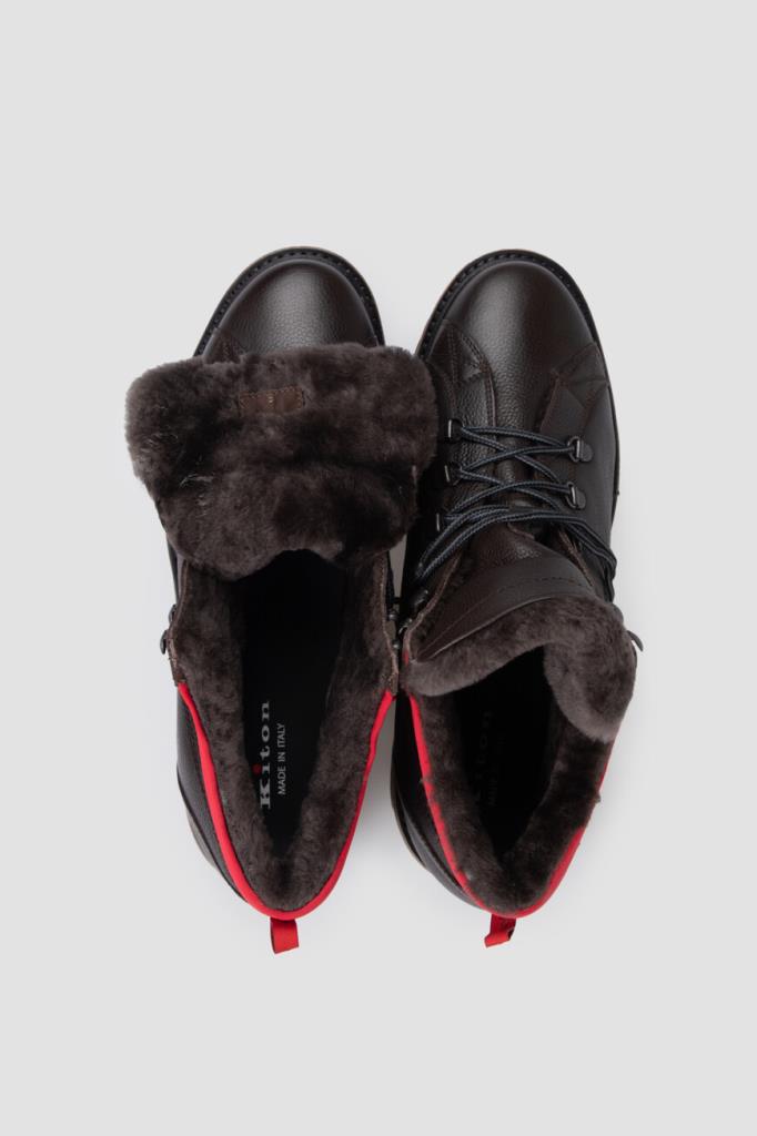 Кожаные ботинки Kiton с усиленной перекрёстной шнуровкой. Модель окрашена в тёмно-коричневый оттенок и дополнена ярко-красной вставкой-полосой на голенище и внутренней отделкой из густой овчины с коротким плотным ворсом в тон. Изделие отличается металлическими D-образными деталями вместо люверсов и чёрной резиновой подошвой с устойчивым каблуком, глубоким протектором и светло-коричневой вставкой сверху.