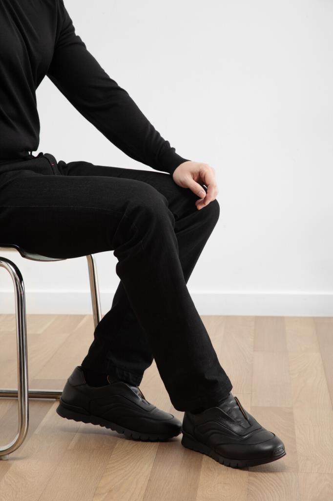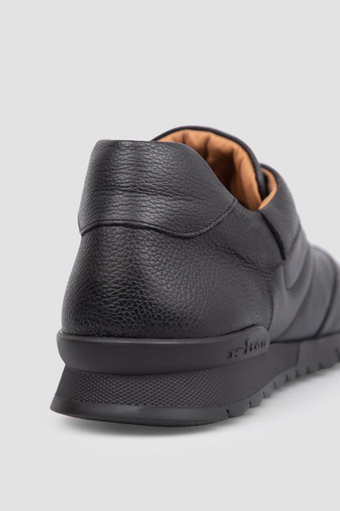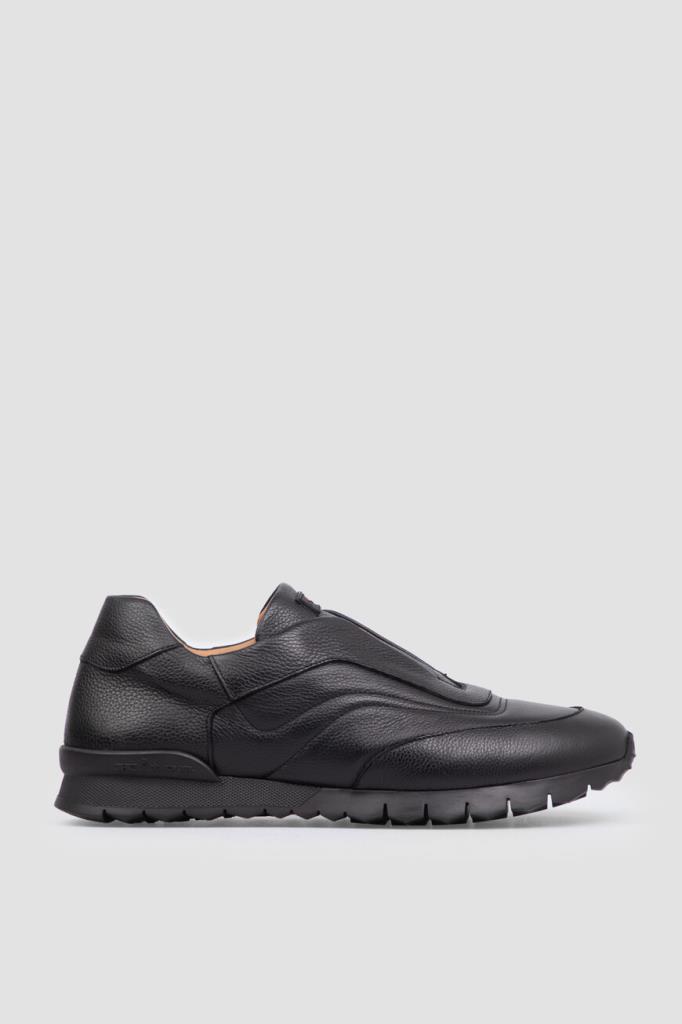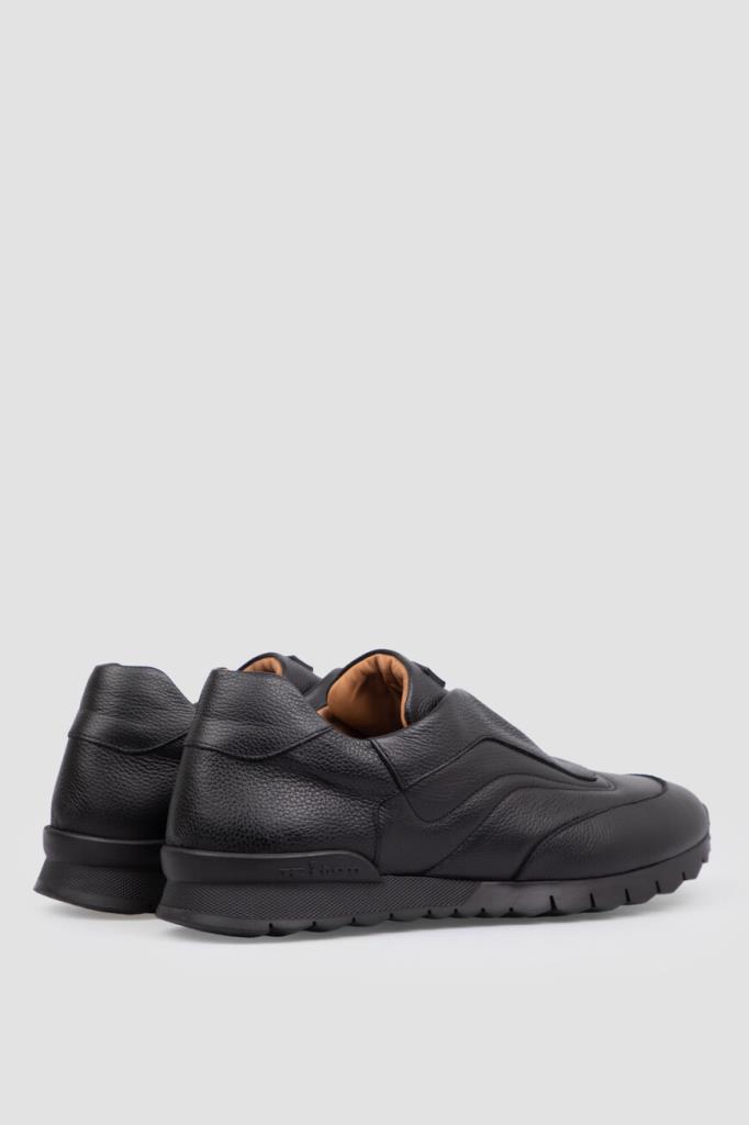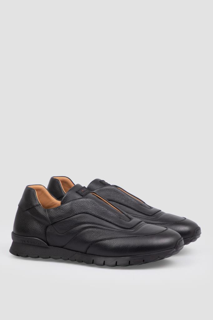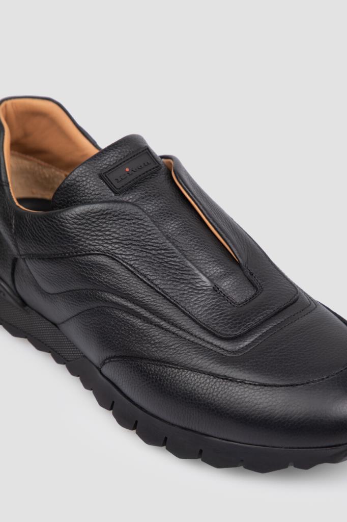 Сникеры чёрного цвета от бренда Kiton выполнены без шнуровки. Для изготовления модели с укреплёнными округлым носки и задником выбрана зернистая телячья кожа. Язычок декорирован прямоугольным патчем с логотипом Дома, а на прорезиненной накладке сзади также расположен рельефный логотип. Пара со стёганым узором установлена на объёмную амортизирующую подошву с крупным протектором для надёжного сцепления с дорогой.