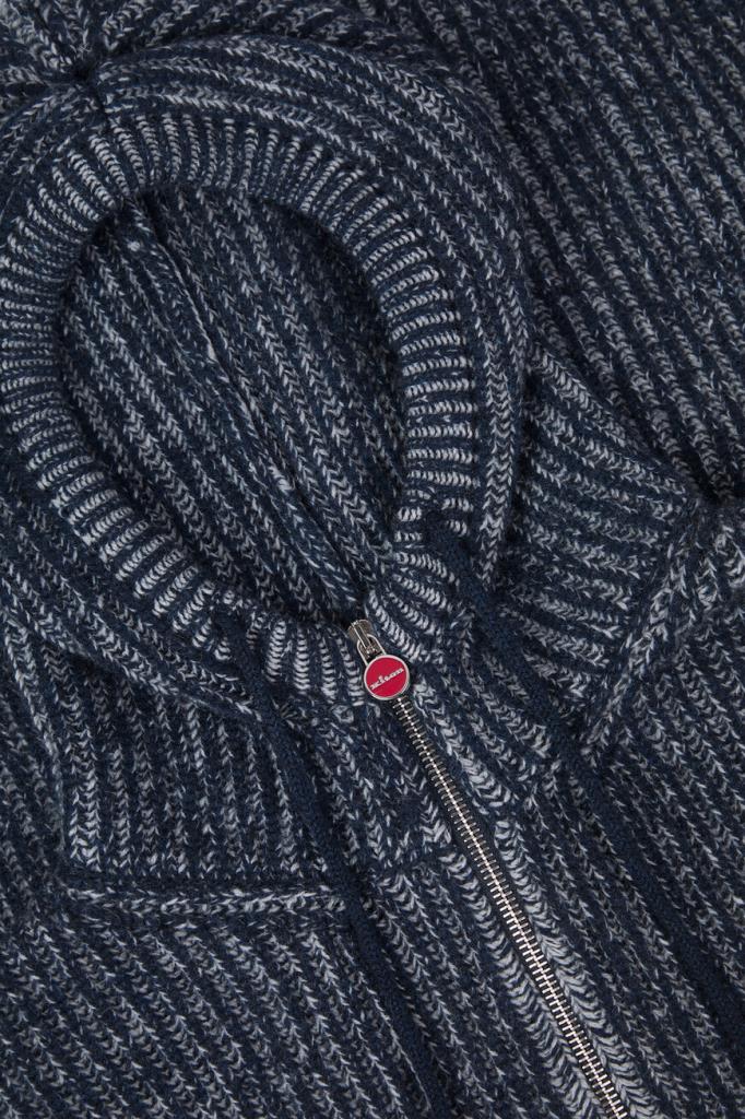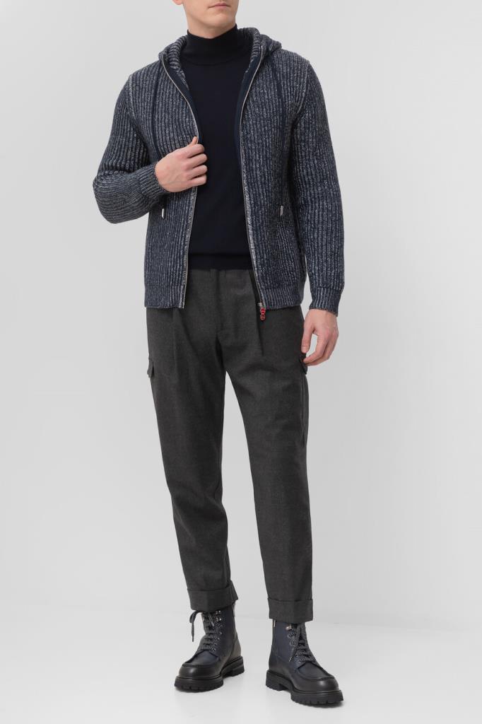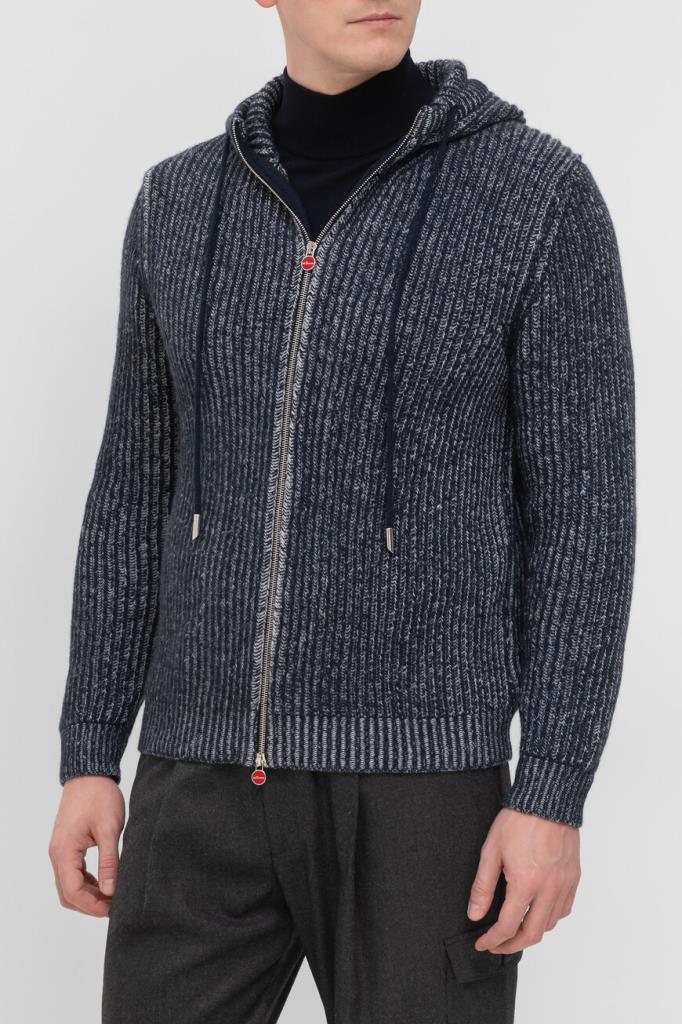 Толстовка Kiton в белом и тёмно-синем тонах. Изделие прямого силуэта связано из мягкой кашемировой пряжи и оснащено глубоким капюшоном на регулируемых завязках. Модель застёгивается на встречную молнию с брендированными пуллерами фирменного алого оттенка и сочетается с брюками из коллекции городской одежды KNT.