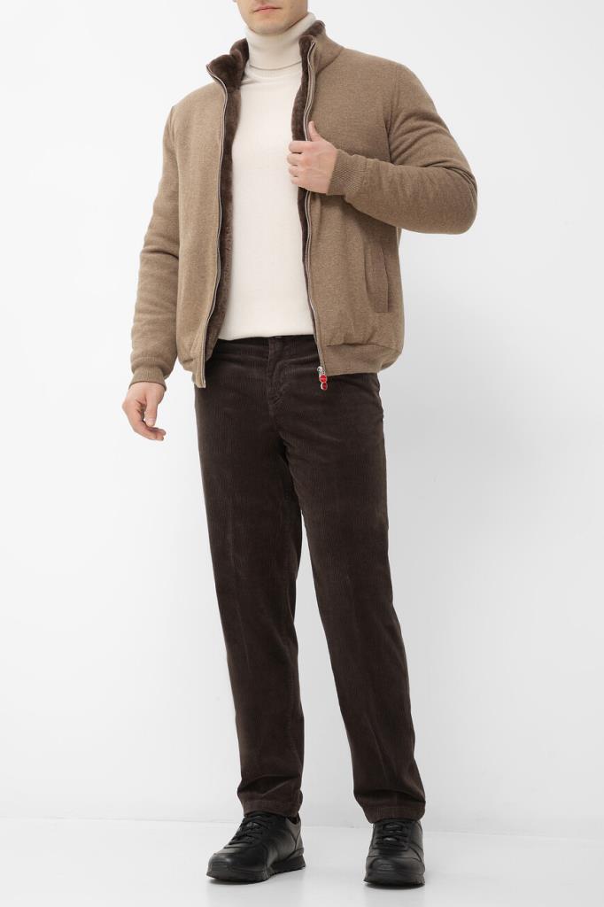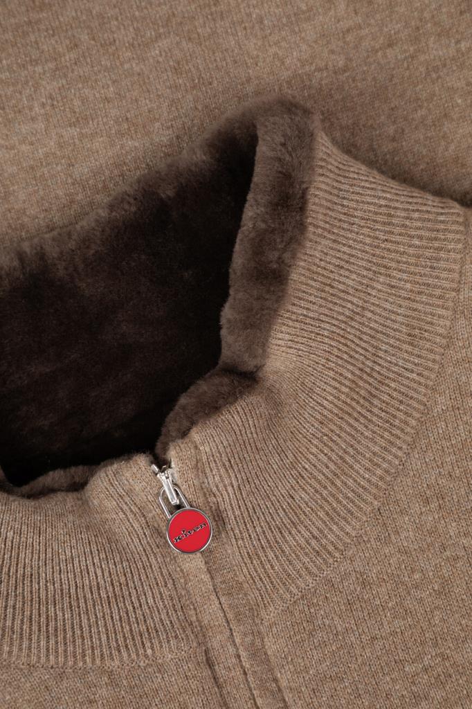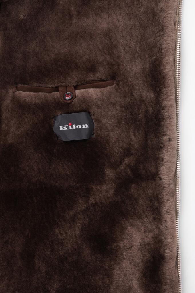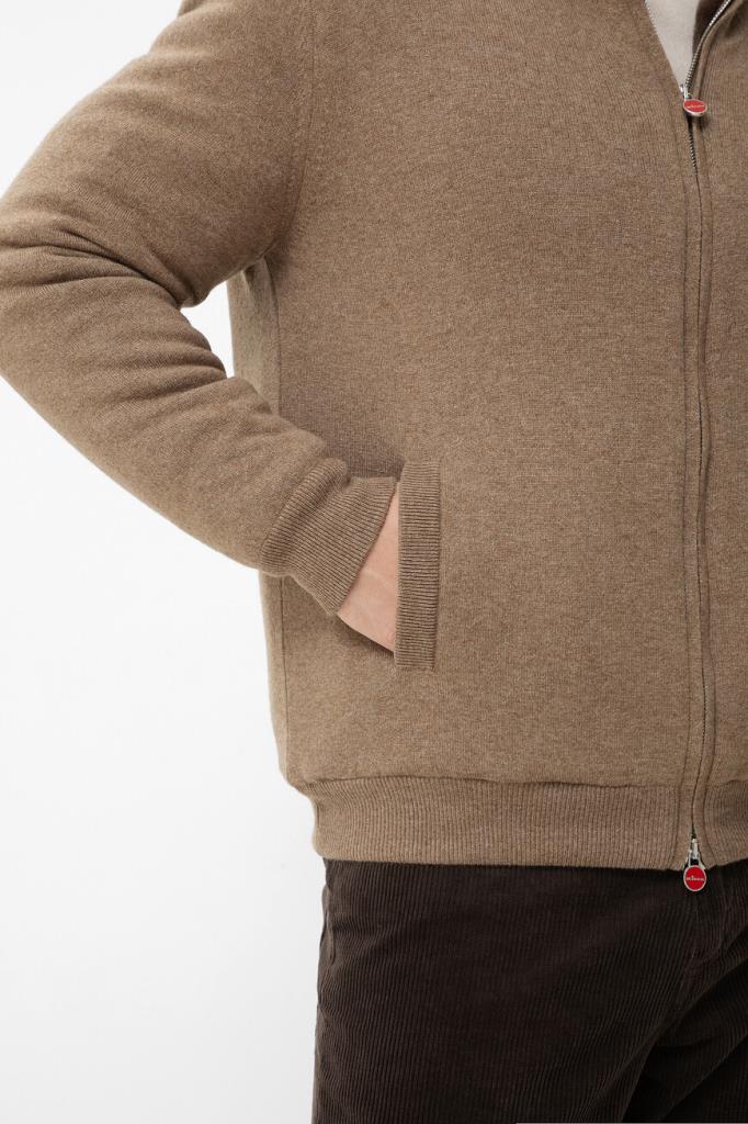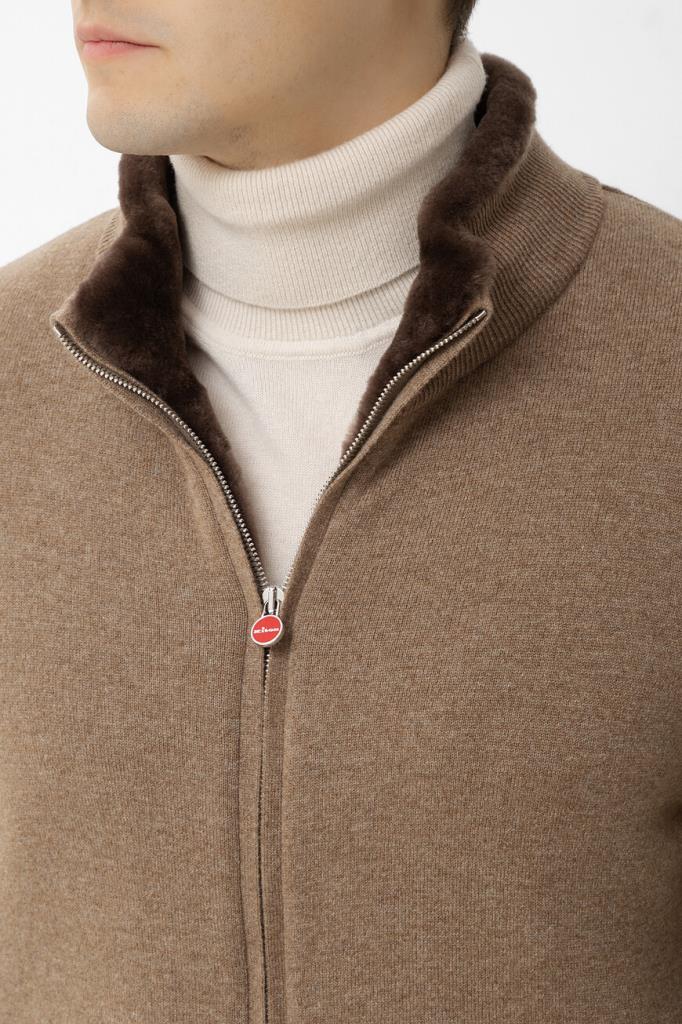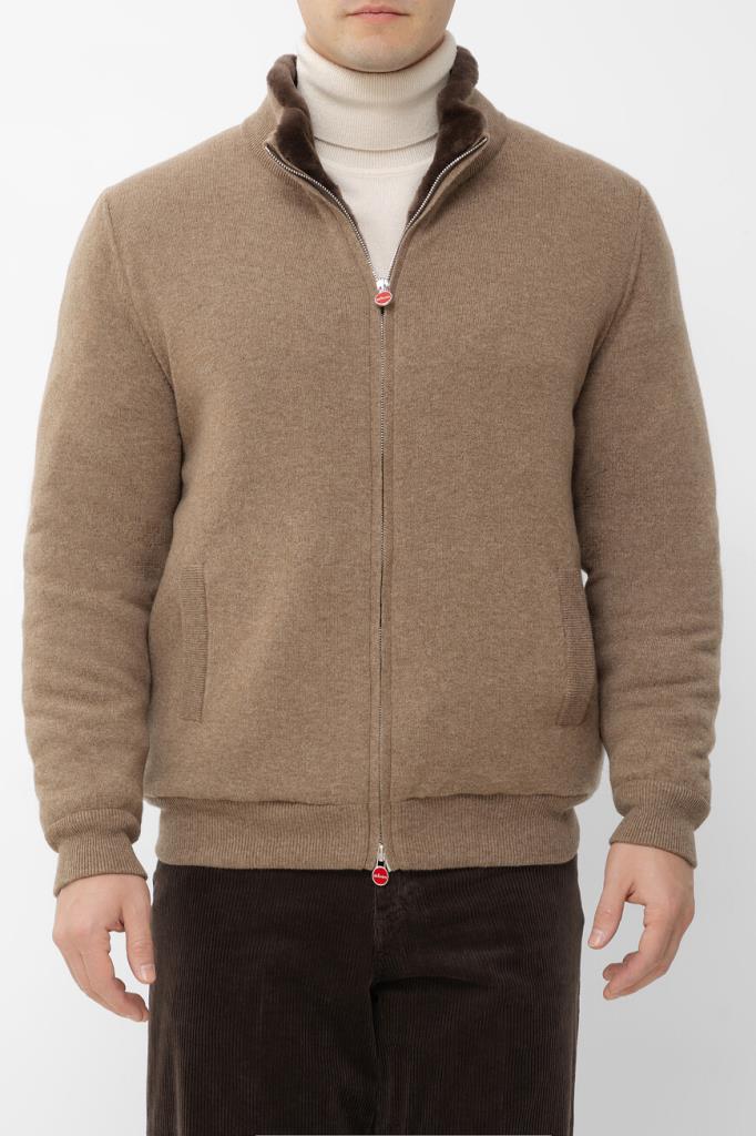 Утеплённая олимпийка орехового оттенка от бренда Kiton. Фасон повседневной модели из мягкого кашемира, выполненной лицевой гладью, предполагает наличие невысокого воротника-стойки и застёжку на встречную молнию с двумя эмалированными пуллерами. Отличительными особенностями изделия стали тёмно-коричневая внутренняя отделка из натурального меха и брендирование на бегунках.