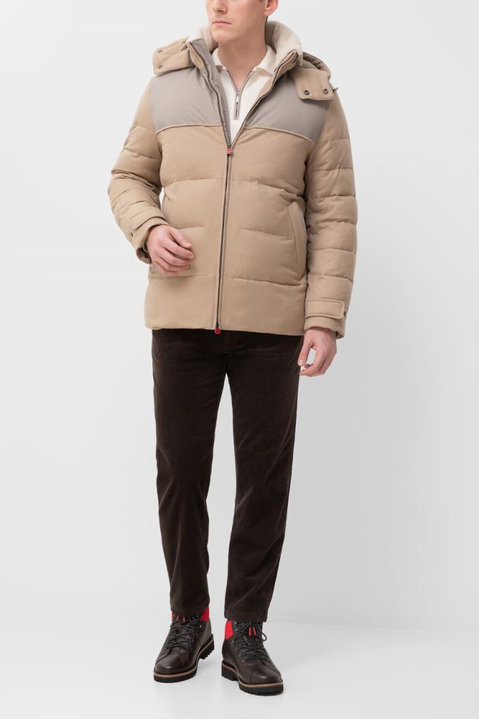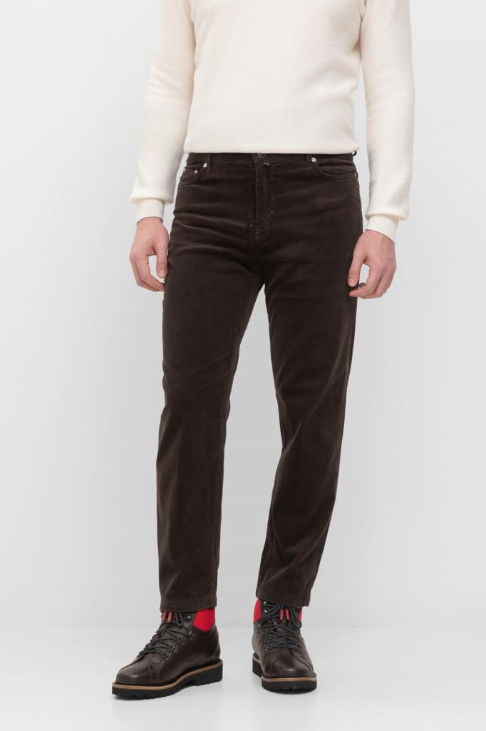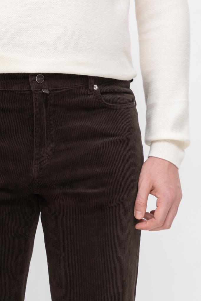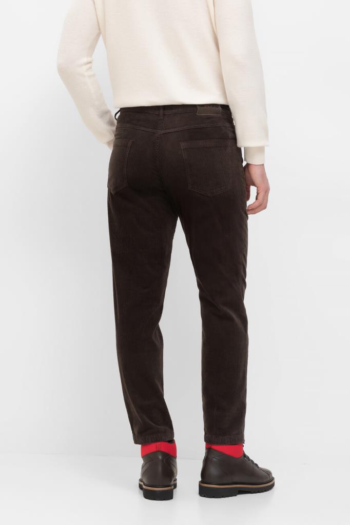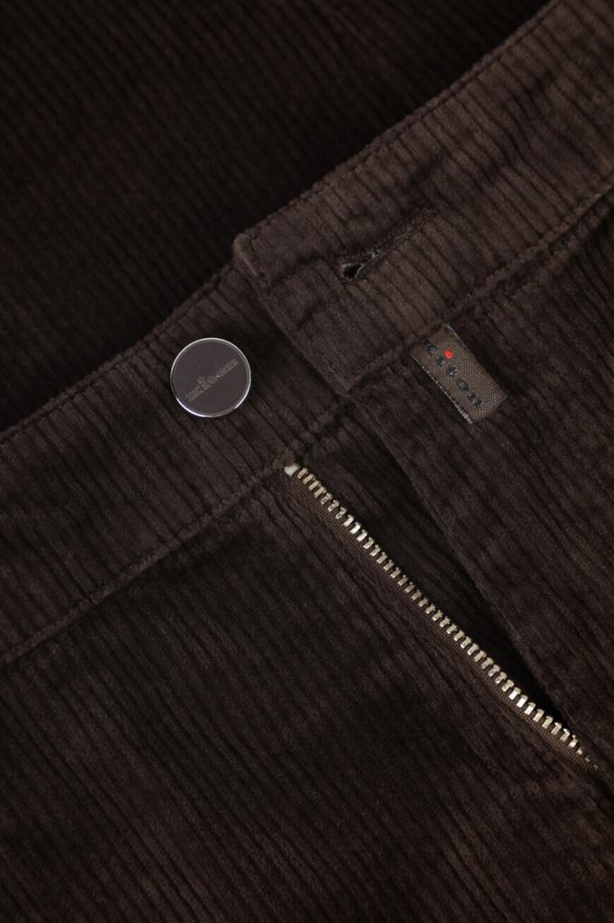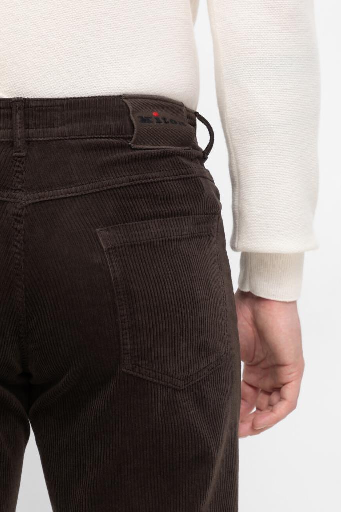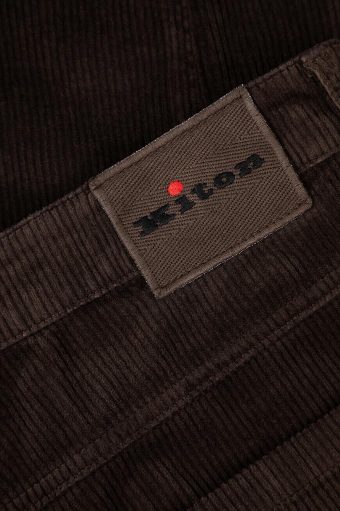 Брюки со знаковой символикой бренда Kiton. Для создания изделия с классическими стрелками используется эластичный вельвет на основе хлопка и кашемира тёмно-коричневого оттенка. На поясе сзади расположена  текстильная накладка с вышитой надписью-лого Дома, а внутреннюю сторону пояса и одну из шлевок украшает вышитый логотип в тон.