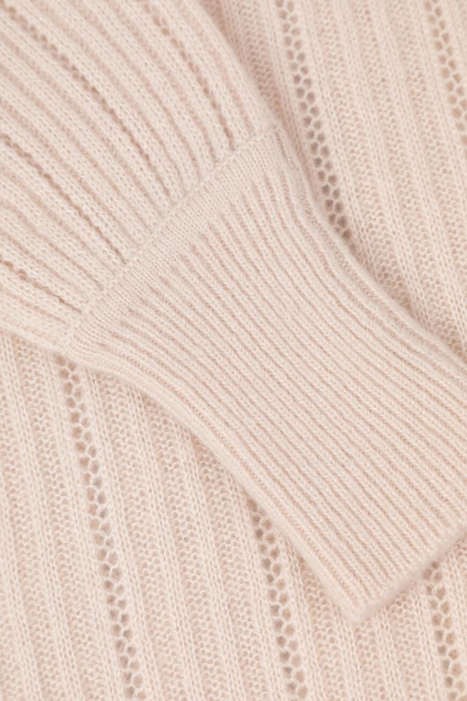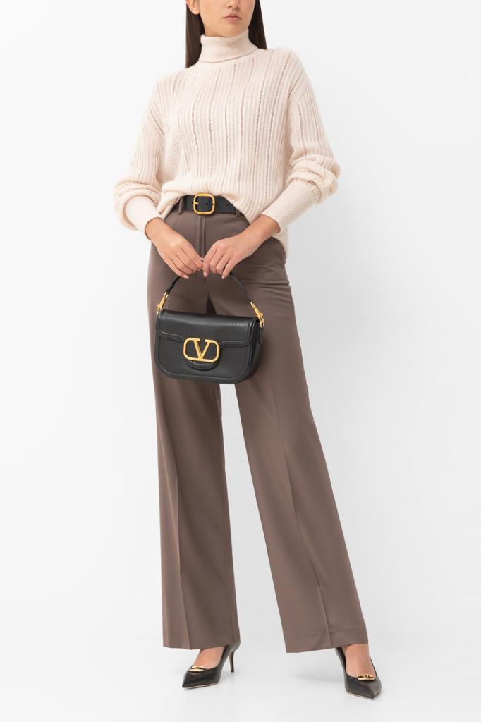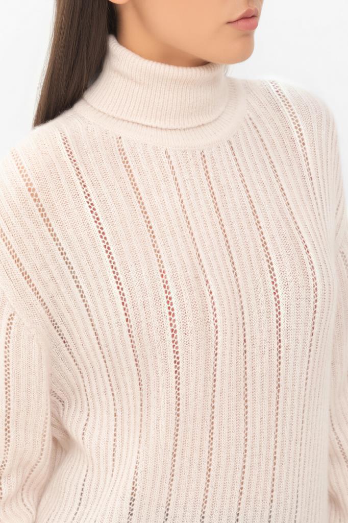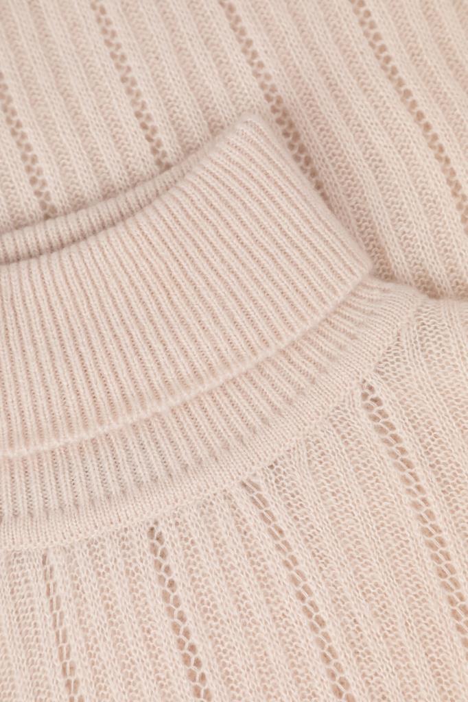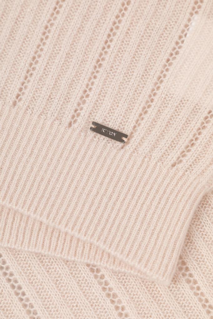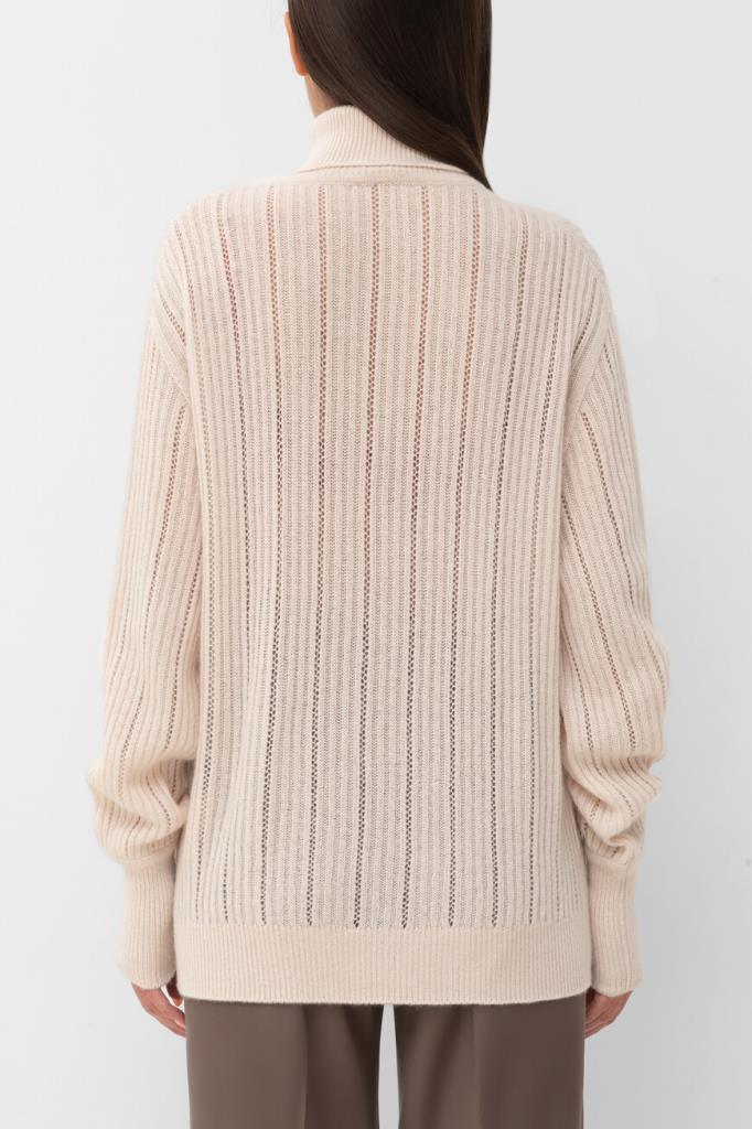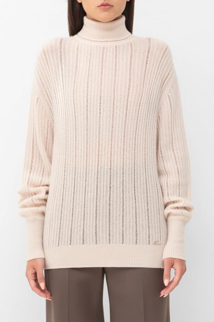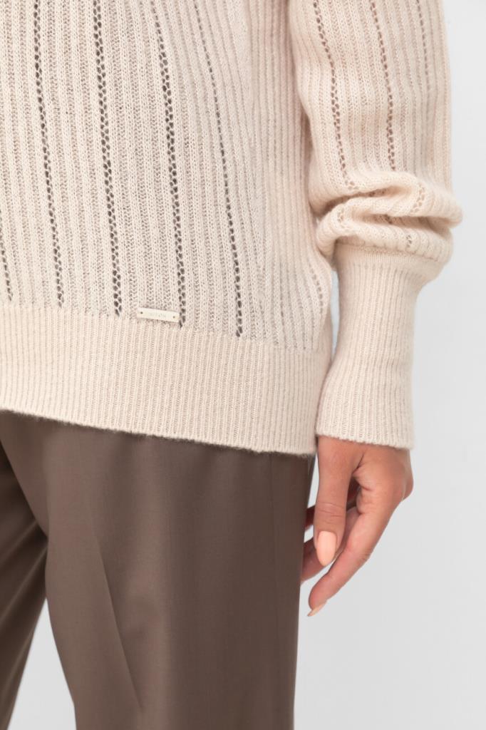 Водолазка Kiton с сетчатым полосатым узором. Полупрозрачная модель изготовлена из лёгкой пряжи на основе отборного кашемира с добавлением шёлка. Декором выступает серебристая металлическая деталь с гравировкой спереди. Высокий воротник фасона «гольф», удлинённый манжеты рукавов и пояс оформлены широкой резинкой. Создайте органичный комплект в сочетании с брюками с отглаженными стрелками из той же коллекции.