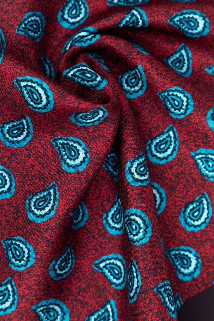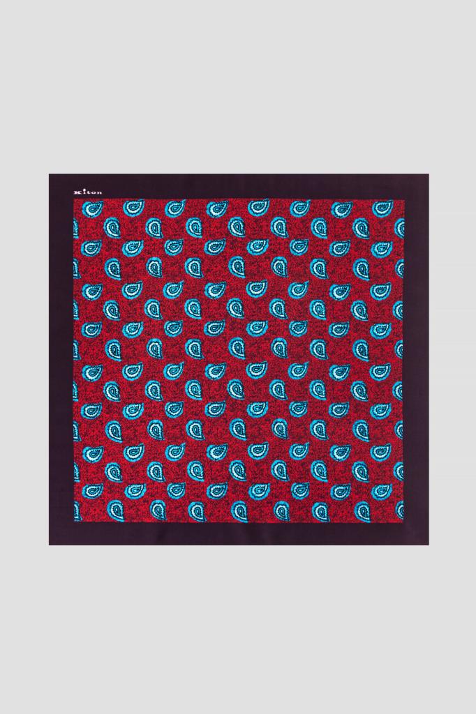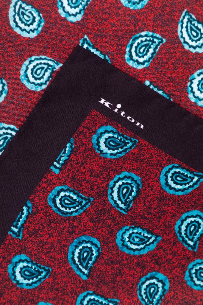 Принтованный платок Kiton выполнен в бордовом и голубом тонах. Для создания квадратного аксессуара выбран гладкий шёлк. Прочный материал с плотным переплетением нитей почти не мнётся, не деформируется со временем и аккуратно драпируется в мягкие складки. Декором выступает легендарный восточный мотив пейсли в виде вытянутых слегка закруглённых капель, переплетающихся между собой.